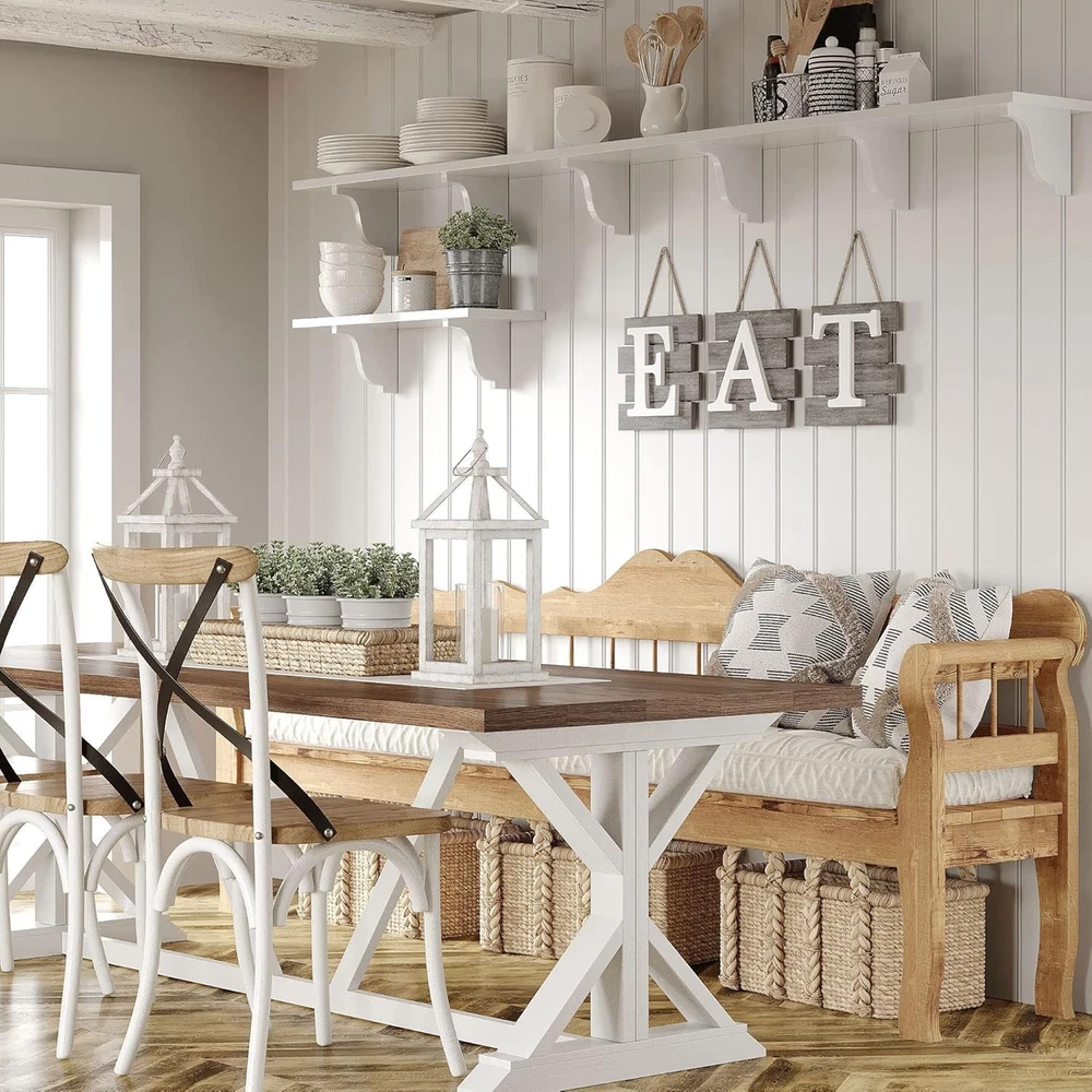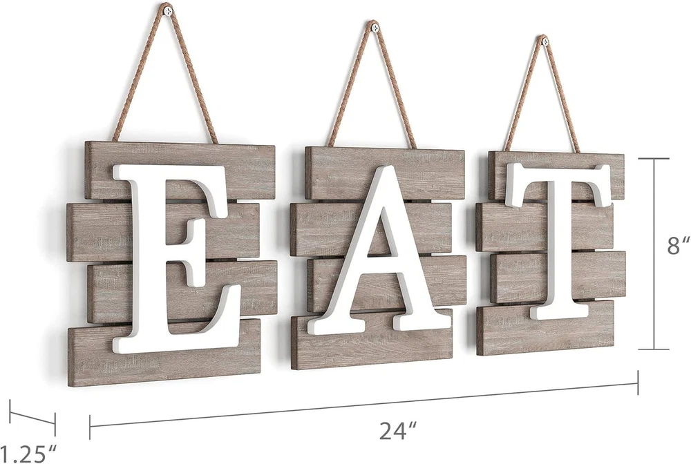 The Barnyard Designs Eat Sign is a rustic white and brown decorative sign made out of wood, perfect for adding a touch of charm to any kitchen. The sign is designed to be a focal point in the kitchen, adding a unique and decorative flair to the space. It is a stylish and functional addition to home décor, suitable for those looking to add a personal touch to their kitchen design.