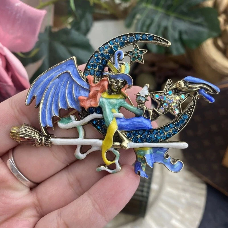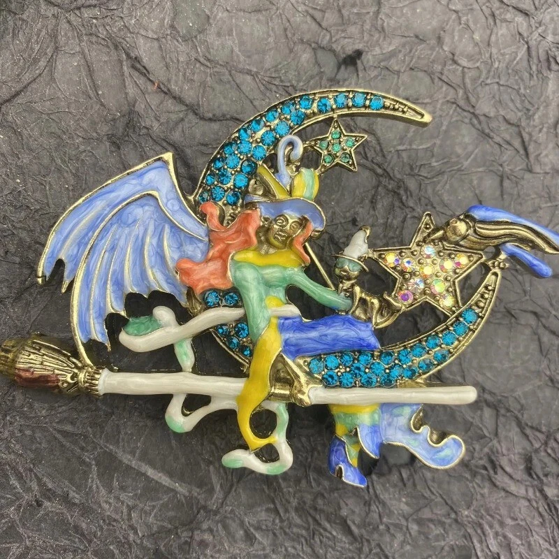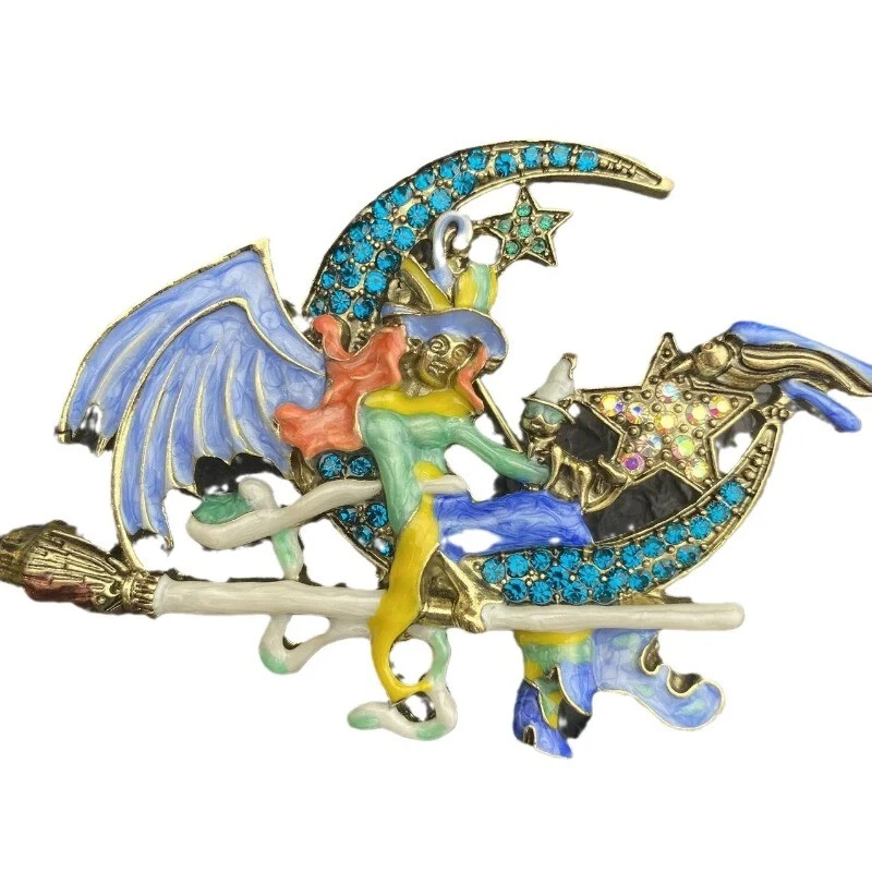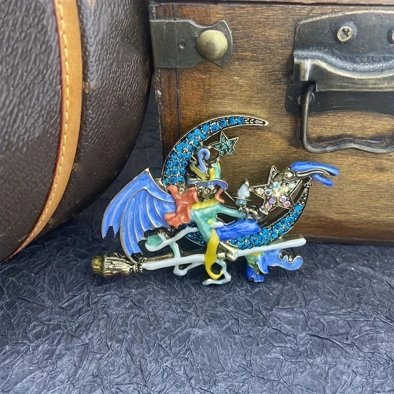 Baroque Vintage Enamel Blue Fairy on Moon Witch Women Brooch Pins Accessory