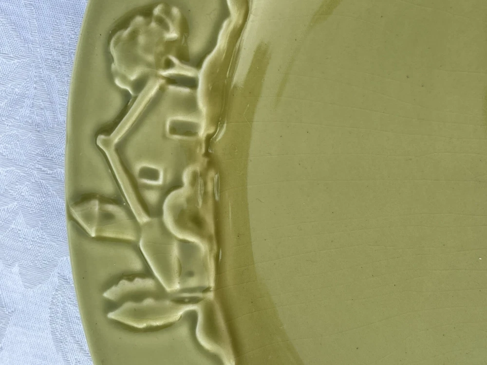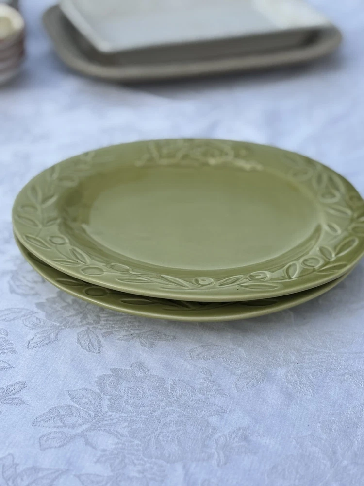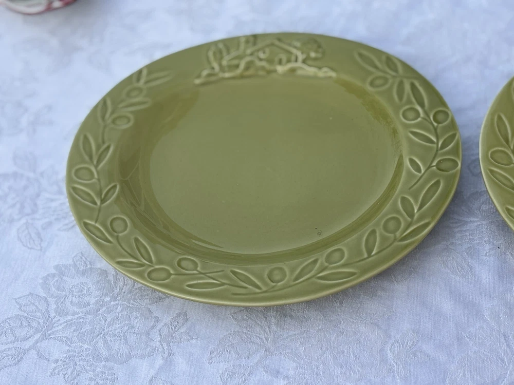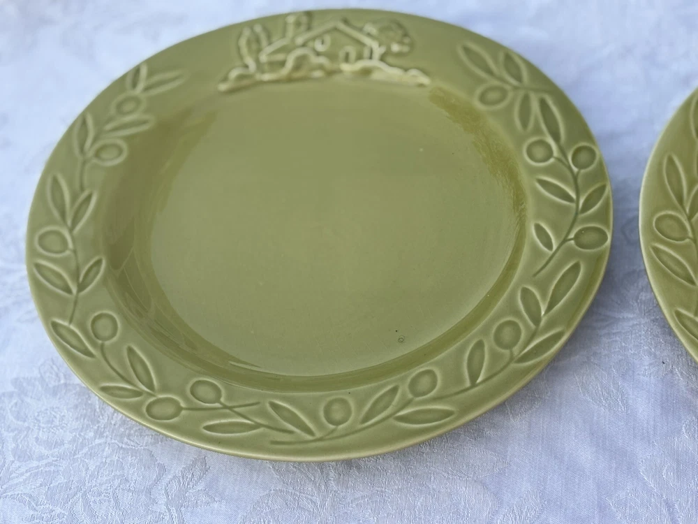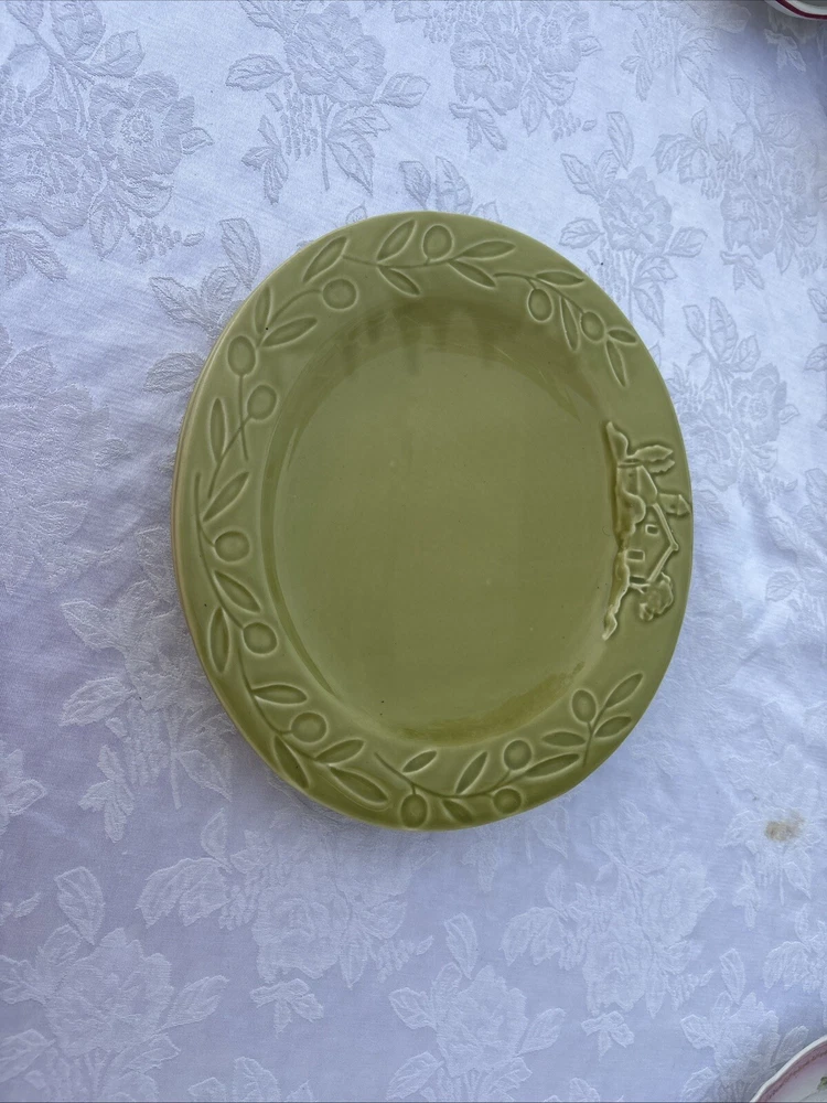 Add a touch of country charm to your dining table with these Barrarte Brand Salad Plates. The oval-shaped plates feature a decorative raised pattern and are made of glossy ceramic material. The plates are handmade and designed with a farmhouse olive branch ri pattern, making them perfect for all occasions. These two-piece plates were manufactured in Portugal in 2001 and are licensed reproductions. They are suitable for teens and adults and require hand wash only for care instructions. The plates are 8 inches in length and 1 1/2 inches in height, with an item weight of 2.8 lbs. They are perfect for serving salads and other dishes and are sure to add a touch of kitschy style to your dining experience. Returns accepted within 30 days; buyer pays return shipping