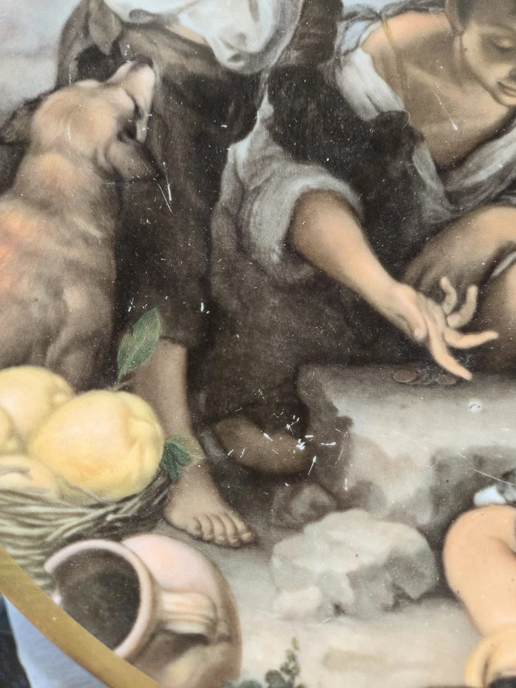 This vintage collector plate features two artworks by Bartolome Esteban Murillo, "The Pie Eaters" and "Beggar Boys Playing Dice". It is round, 7 inches in diameter, made of multicolor bone china, and part of the Street Urchin Series by Crown Staffordshire. Produced in Germany in the early 20th century (1930-1939), it showcases art pottery production techniques in a German cultural style.