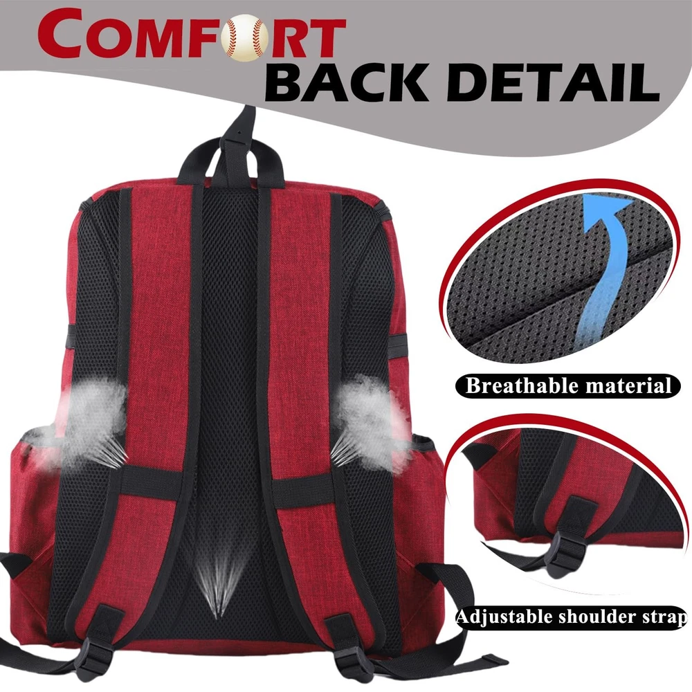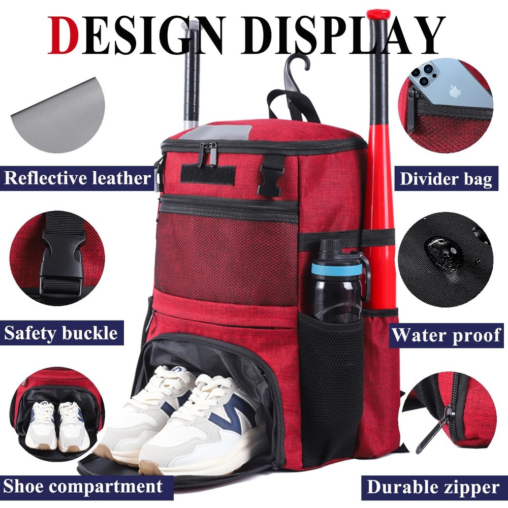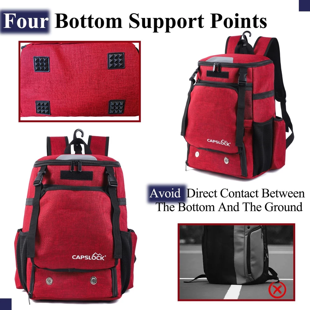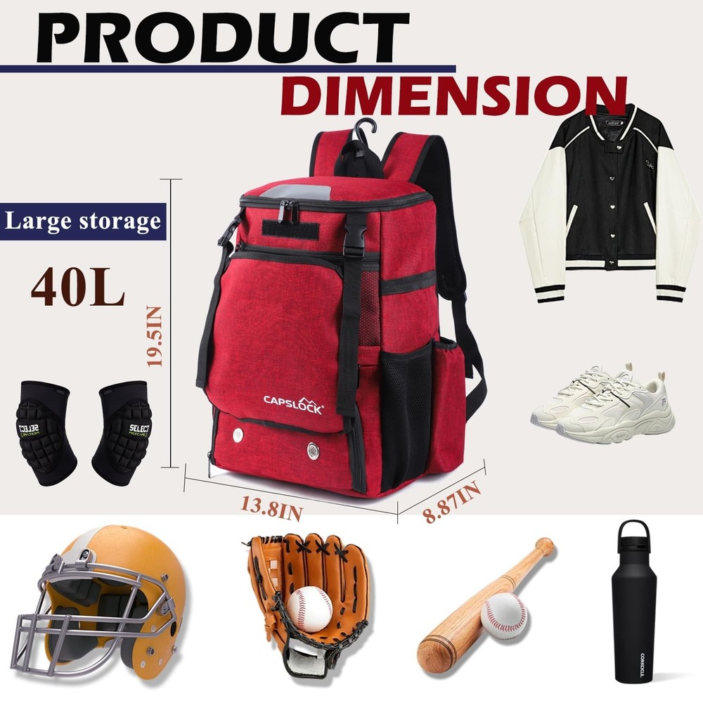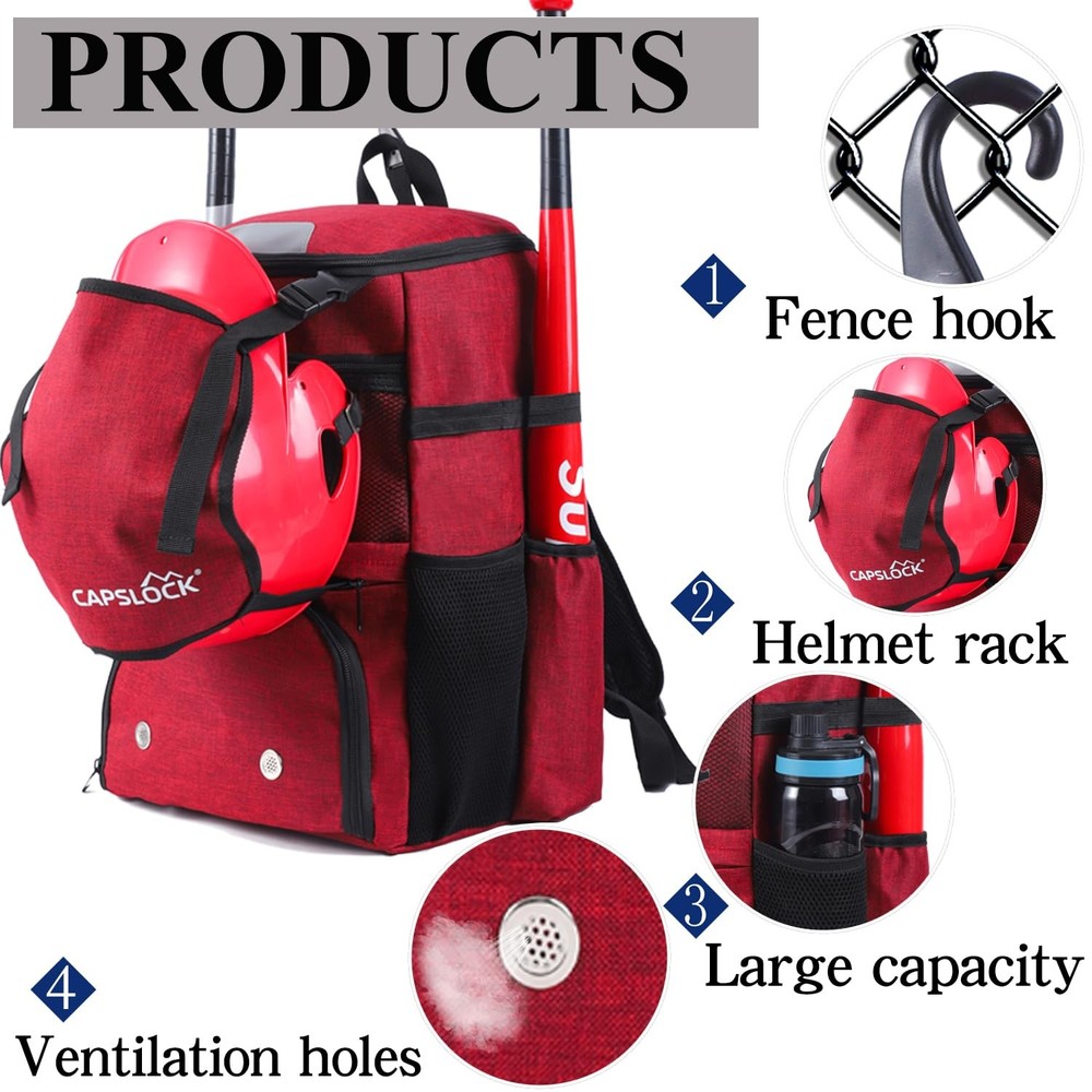 CAPSKLOCK Baseball Bag Youth or Adult Baseball Bag & Softball Separate Shoe Compartment Waterproof Fence Hook Multiple Colors Top Fence Hook:The fence hook allows users to easily hang the baseball bag on a fence or fence, keeping the bag and equipment off the ground and preventing them from getting dirty. The baseball bag hung on the fence allows users to easily access items such as bats and gloves at any time, especially suitable for frequent use during games or training. Independent shoe compartment: a specially designed shoe compartment to prevent sneakers from dirtying other equipment, keep the bag clean and have ventilation holes to keep air flowing Large capacity: It can hold four bats, two on each side, gloves, shoes, helmets and a change of clothes, suitable for carrying a full set of baseball equipment. There are also small pockets inside the bag for storing small items such as mobile phones, keys, wallets, etc., which are easy to access. Padded back and shoulder design: comfortable load-bearing experience, whether it is training, competition, or daily use, the baseball bag can provide a balanced sense of load, helping you to easily cope with long-term carrying. The shoulder strap of the baseball bag is designed to be adjustable, and the length can be adjusted according to different body shapes to ensure that the bag fits better when carried, providing the best comfortable experience. Quality Assurance: This sports baseball bag is made of nylon, which can withstand long-term use and friction. Compared with bags made of other materials, nylon is lighter and can reduce aging and fading caused by exposure to sunlight, giving the baseball bag a longer service life in outdoor environments.