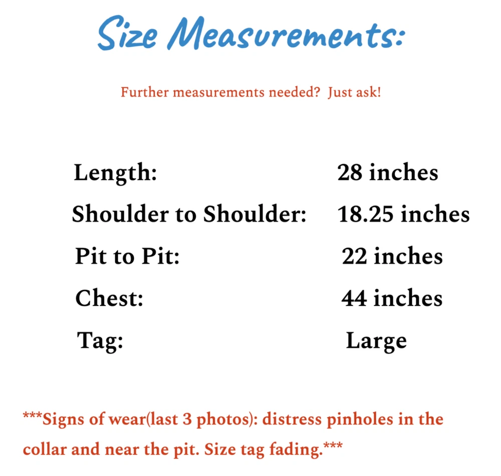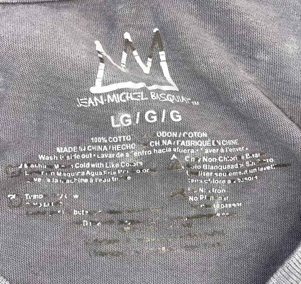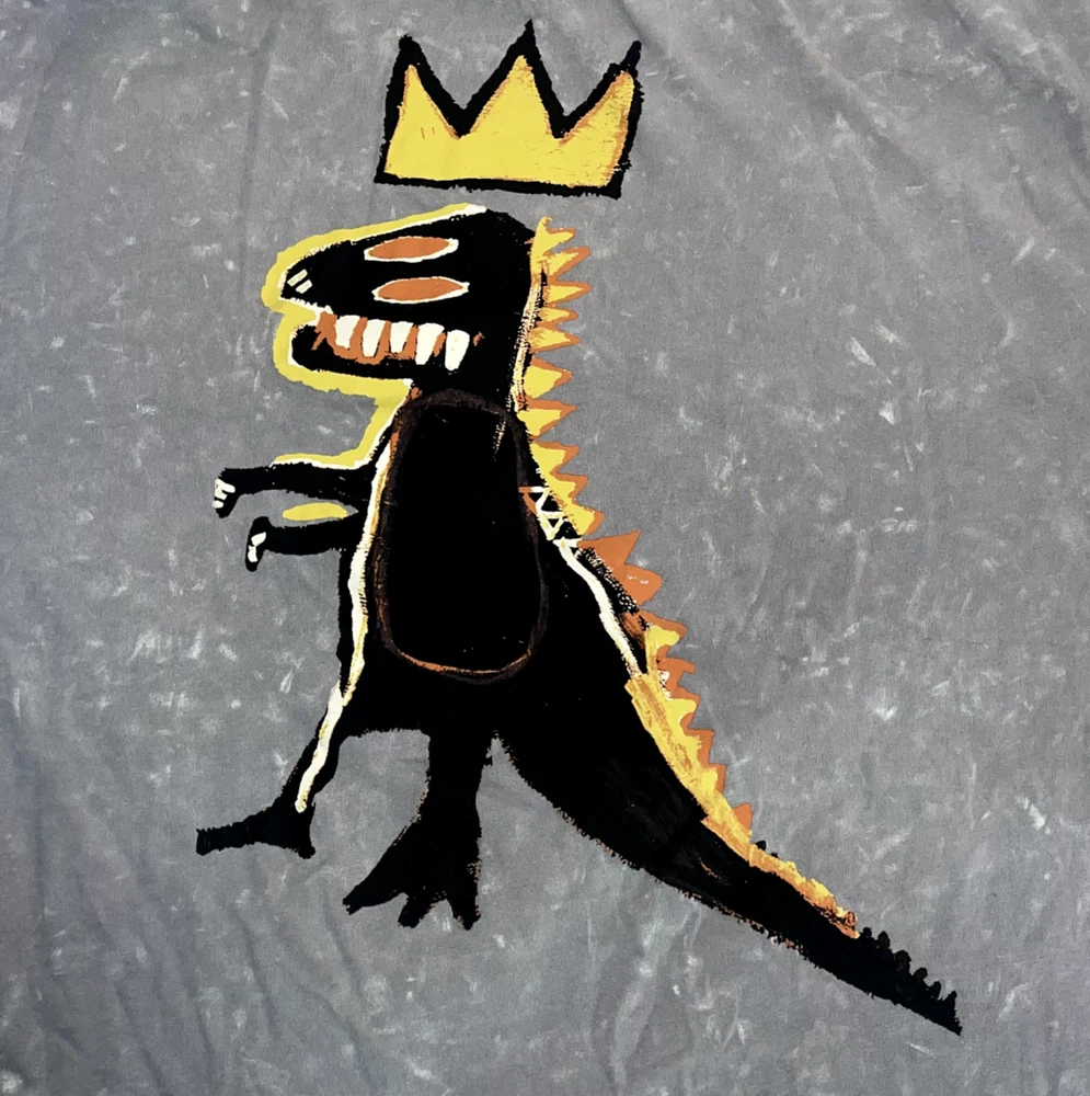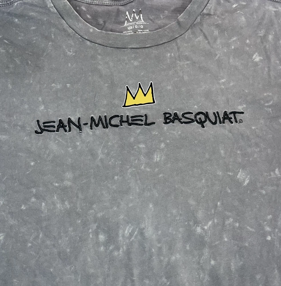 Basquiat Graffiti Dinosaur Shirt Gray Embroidered Jean Michel Basquiat Tee LG front name embroidered back dino graphic is printed Some small signs of wear, shown in photos--final 3 photos are close ups : *** distress pinholes in the collar and near the pit. Size tag fading.*** Otherwise, EUC. Please refer to photos for the most accurate measurements, description, and estimation of the item's condition. We’re happy to answer any questions or provide additional photos before purchase if requested! All items are sold as is and we try our very best to note any issues with condition in both our description and close up photos. Please remember that colors can look different across different devices and monitors. Condition: Please see photos for measurements. Any further measurements needed? Just ask! Some small signs of wear, shown in photos--final 3 photos are close ups : *** distress pinholes in the collar and near the pit. Size tag fading.*** Otherwise, EUC Pre-Owned: shows minimal to no signs of wear, as expected with typical well cared for use such as slight fading of colors with age. Please make sure to double check measurements for the best representation of fit, as brands can vary in sizing. Comes without sales tags, dust bag, or brand box. Will it Fit Check? Please reference the listed measurements (in photos and/or text) before purchasing. Fit check tip: Grab your favorite similar style item at home, lay the garment on a flat surface, and measure shoulder to shoulder, the width (armpit to armpit), and length (top to bottom). Then compare your measurements to those in our listing! If you need any further measurements not noted in the listing, please feel free to request, we will get back to you asap. FAST SHIPPING! Orders are usually shipped within 24 hours M-F Friday orders will ship Monday morning at the latest, unless there is a postal holiday. Feel free to send us a message before purchase if you?d like a certain delivery service or combined shipping offers. Still got Questions? Send us a message! We do our best to accurately and thoroughly represent each item in images and condition description, but, if there's any further information you'd like before purchasing or have a shipping request, please don't hesitate to ask and we'll get back to you asap. RETURN POLICY: Please reach out prior to purchase with any questions or shipping requests. Returns are accepted within 30 days, buyer pays return shipping. Refund issued upon receipt of item in original condition. Full refund (minus original shipping) will be issued once we receive the item assuming it is in the exact same condition as it was shipped.(Clean, unaltered, tags still attached if item was new with tags, etc.) We request that you select "Item does not fit" when returning an item that does not fit. Thank you for shopping small and supporting our lil' Rodeo!