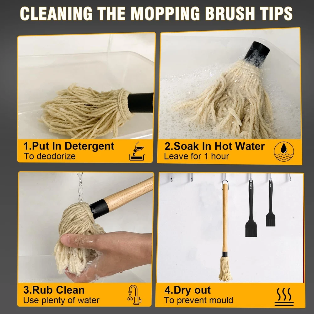 ABOUT The terrible experience you may meet when using nylon bristle brushes, paint brush type of brushes or detachable silicone brushes × Difficult to clean. × The handle separates from the brush. × Boar Bristles or Cotton come off in food. × Leftover liquids or food linger on the brush. × Mold,Bacterial Growing in it × Melt, Discolor or Shrink when Grilling or Basting silicone basting brushes have none of those disadvantages. Conversely, they have many advantage. √Food Grade, BPA Free and healthy for using. √Heat resistant up to 450°F. √Will never melt, discolored, or shrink. √One-piece design avoids falling off. √Easy to clean and dishwasher safe. √Dry fast with no residue. √Different colors for different tasks. √A set of 1, Superior Value Premium Set Give it a try! You will find it amazing! ★18INCH EXTRA LONG WOOD HANDLE: BBQ Basting Mop have extra long wood handle to keep your fingers from getting burnt while grilling, smoking steak, barbecue. The bbq mop solid wood handles are stronger and more durable, safe and environmentally friendly. ★COTTON REPLACEMENT HEADS: BBQ Mop Brushes replacement heads are soft and absorbent, the basting mop head able to absorb a large amount of sauce, spread on grilled steak, barbecue chicken, or pork to keep it moist and marinated barbecue meat more tender. ★3 EXTRA REPLACEMENT HEADS : Grilling Basting Mop have multiple replacement grill basting mop heads, make it easy to change when you need to brush different sauces on the grill, and you can easily and quickly coat large steaks, ribs, chicken, and pork chops, saving you time and effort. ★ PREMIUM SILICONE, HEAT RESISTANT UP TO 450°F - basting pastry silicone brush made of high-quality food grade silicone which is BPA free. Safe to use in Oven, Microwave, Dishwasher & Freezer. Will never melt,discolor or shrink when grilling, basting or cooking (unlike some plastic, nylon or wooden brushes). ★EASY CLEANING MOPPING BRUSH: For easy cleaning, bbq basting brush needs to be soaked in hot water for 1 hour, then scrubbed with plenty of water, and finally hung on a kitchen hook to dry, preventing the mopping brush from getting mouldy and making it easy to use for the next time. ★SATISFACTION SERVICES- Your purchase is safe and secure with the quality guarantee. If you have the slightest problem with our grill basting mop set,please feel free to give us a message and we will send you a hew one right away without any cost on your side or money back.We go out of our way to every customer is happy and satisfied with our product and service.Order now, safe and secure, with Amazon Prime!