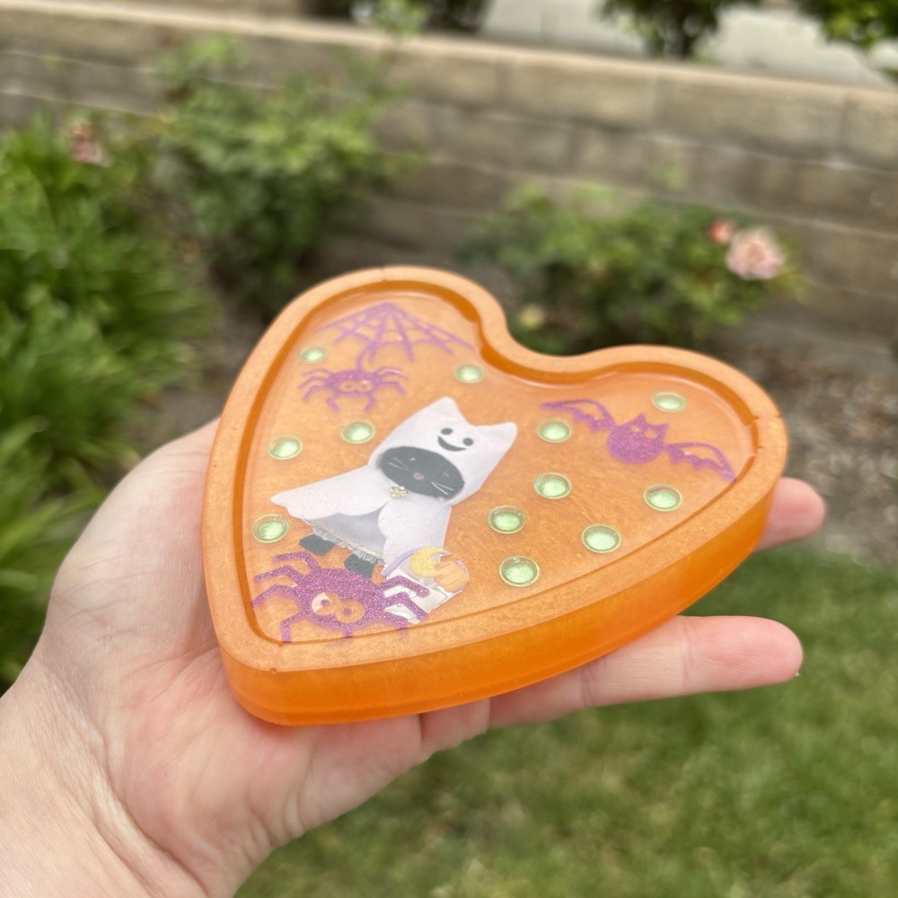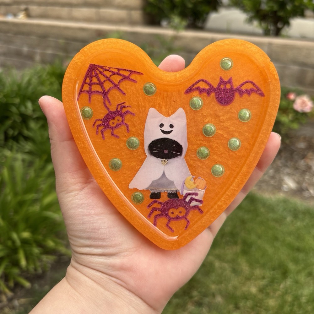 ‘Halloween Spirit’ Calico Critters Inspired Ghost Spider and Bat Halloween Colored Heart Shaped Resin Coaster Handmade by Shop EarthySmurf. *Please note, resin is an imperfect art. Craters, holes, sharp edges, bubbles and more may be present in your piece. Please examine all pictures*