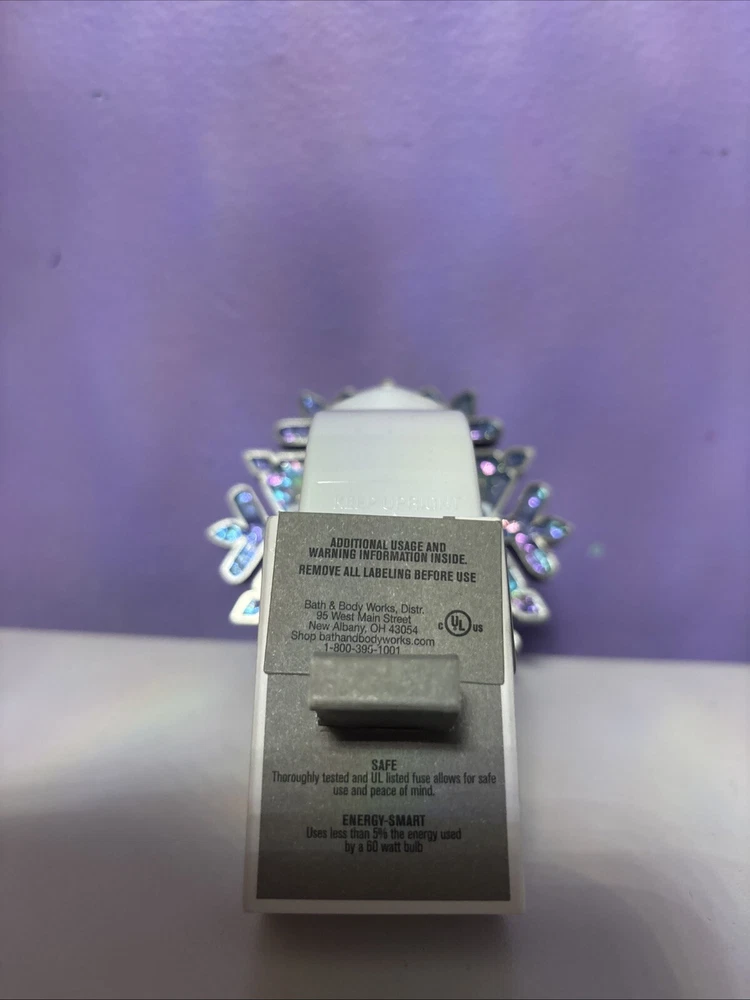 This Bath & Body Works Blue Snowflake Wallflower Plug In is a medium-sized wall plug-in fragrance diffuser featuring a traditional style with a blue plastic snowflake design. It is a single wallflower bulb plug that lights up 24/7, suitable for use in any room. Made in the United States, this plug-in is designed for adults and is branded by Bath & Body Works.