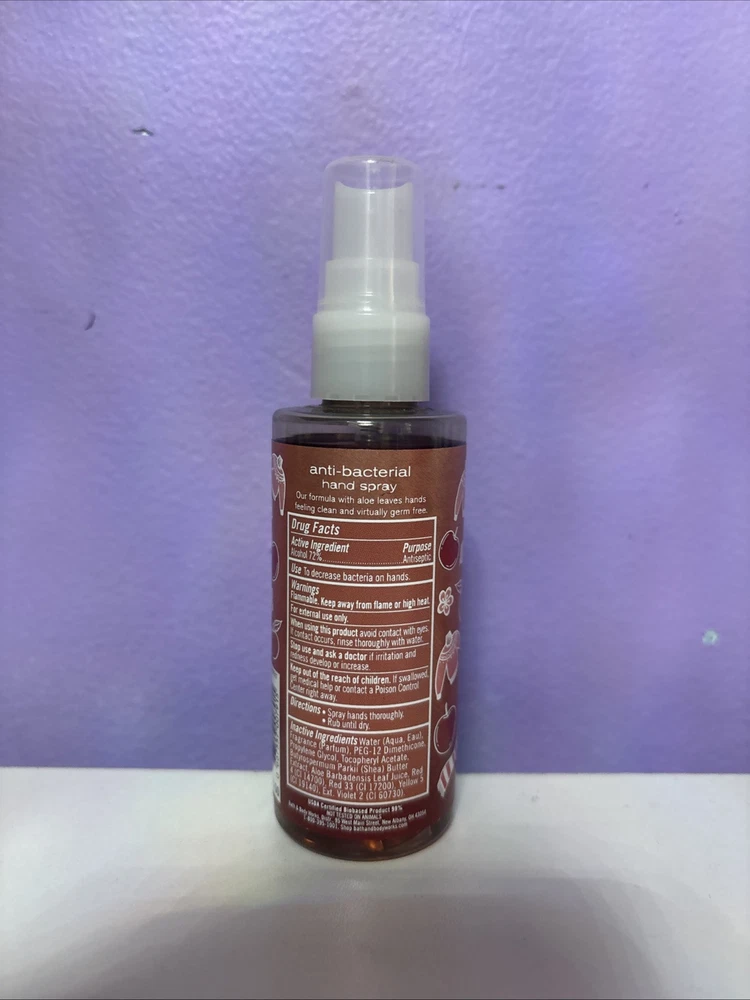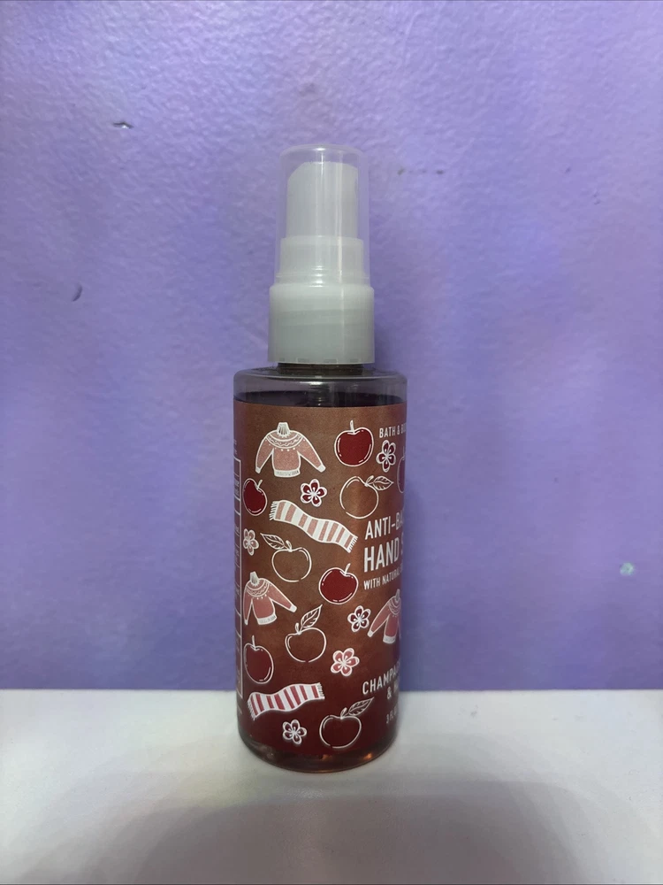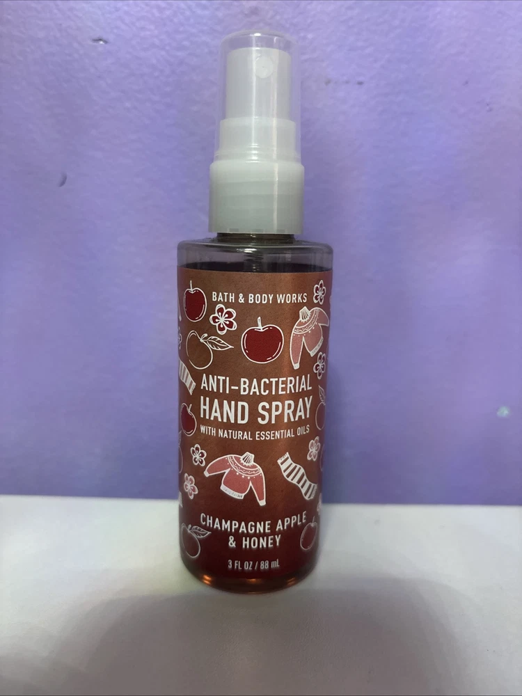 This is a Bath & Body Works Champagne Apple & Honey Anti-Bacterial Hand Spray in a 3 fl oz clear bottle. Made in the United States, this hand sanitizer features antibacterial properties to help keep hands clean and germ-free. Perfect for personal hygiene and health care, this hand spray combines a pleasant fragrance with effective sanitizing capabilities.