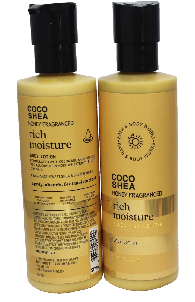 <div style="text-align:center"><img src="http://ti2.auctiva.com/sw/java.gif" border="0"><br><table align="center"><tr><td><a style="text-decoration:none" href="http://emporium.auctiva.com/Dimpl28" target="_blank"><img src="http://ti2.auctiva.com/sw/browse2.gif" border="0"></a></td><td height="21px" valign="middle" align="center"><font face="arial" size="2"><b><a href="http://emporium.auctiva.com/Dimpl28" target="_blank">Dimpl28</a> Store</b></font></td></tr></table></div> <img src="http://ti2.auctiva.com/web/aswCredit.gif" border="0"><br><a href="http://www.auctiva.com/?how=scLnk0" target="_blank"><img src="http://ti2.auctiva.com/images/sc1line0.gif" border="0"></a> Bath & Body Works Coco Shea Shea Honey Body Lotion 7.8 oz Rich Moisture Lot of 2 We have been selling on eBay since 2002 and have always had a good standing with eBay due to our integrity. All our products are 100% authentic. To sell anything other than that is illegal and immoral. We do not ship internationally unless it's to a military address, in which case, we are honored to do so. All orders are double checked before shipping out to avoid any mistakes. We are honest and upfront about items and the condition of items. Once an item is purchased, the address cannot be changed nor can the order be canceled. Our handling time is 2 days, unless we’re out of town and then it will be changed to reflect any delay. Our customers make this business possible and I truly appreciate each & every one of you! Thank you!