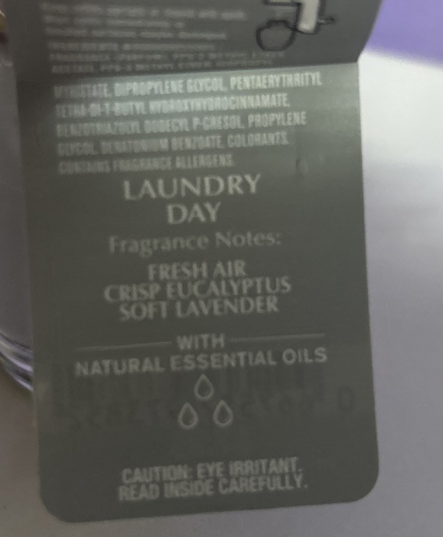 This Bath & Body Works Laundry Day Wallflower Refill is a 0.8 fl oz oil refill for a wall plug-in diffuser. It is made of glass and is eco-friendly, residue-free, and spill-proof. The scent is a motivation and positive energy blend designed for aromatherapy use in a bathroom. The refill is pet safe and acts as a deodorizer and odor eliminator, with a slow-burning formula for long-lasting fragrance.
