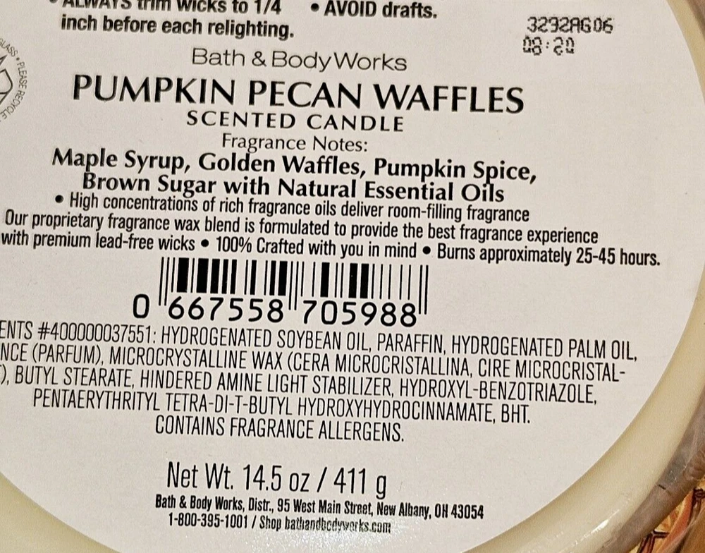 Bath and Body Works Pumpkin Pecan Waffles 3-Wick Scented Candle Large 14.5 oz. Candle has a silver decorative lid. Great Scent Shop early while they are in stock Bring the warmth and comfort of fall into your home with brand-new Bath & Body Works Pumpkin Pecan Waffles 3-Wick Scented Candles . Perfect for adding a sweet, cozy atmosphere during the holiday season. These candles are in pristine condition, unused, and still sealed in their original packaging.