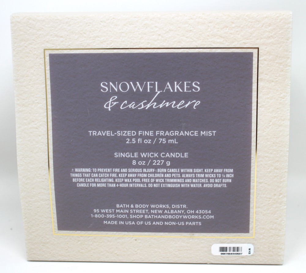 <div style="text-align:center"><img src="http://ti2.auctiva.com/sw/java.gif" border="0"><br><table align="center"><tr><td><a style="text-decoration:none" href="http://emporium.auctiva.com/Dimpl28" target="_blank"><img src="http://ti2.auctiva.com/sw/browse2.gif" border="0"></a></td><td height="21px" valign="middle" align="center"><font face="arial" size="2"><b><a href="http://emporium.auctiva.com/Dimpl28" target="_blank">Dimpl28</a> Store</b></font></td></tr></table></div> <img src="http://ti2.auctiva.com/web/aswCredit.gif" border="0"><br><a href="http://www.auctiva.com/?how=scLnk0" target="_blank"><img src="http://ti2.auctiva.com/images/sc1line0.gif" border="0"></a> Bath & Body Works Snowflakes & Cashmere Gift Set Candle 8 oz & Body Mist 2.5 oz We have been selling on eBay since 2002 and have always had a good standing with eBay due to our integrity. All our products are 100% authentic. To sell anything other than that is illegal and immoral. We do not ship internationally unless it's to a military address, in which case, we are honored to do so. All orders are double checked before shipping out to avoid any mistakes. We are honest and upfront about items and the condition of items. Once an item is purchased, the address cannot be changed nor can the order be canceled. Our handling time is 2 days, unless we’re out of town and then it will be changed to reflect any delay. Our customers make this business possible and I truly appreciate each & every one of you! Thank you!