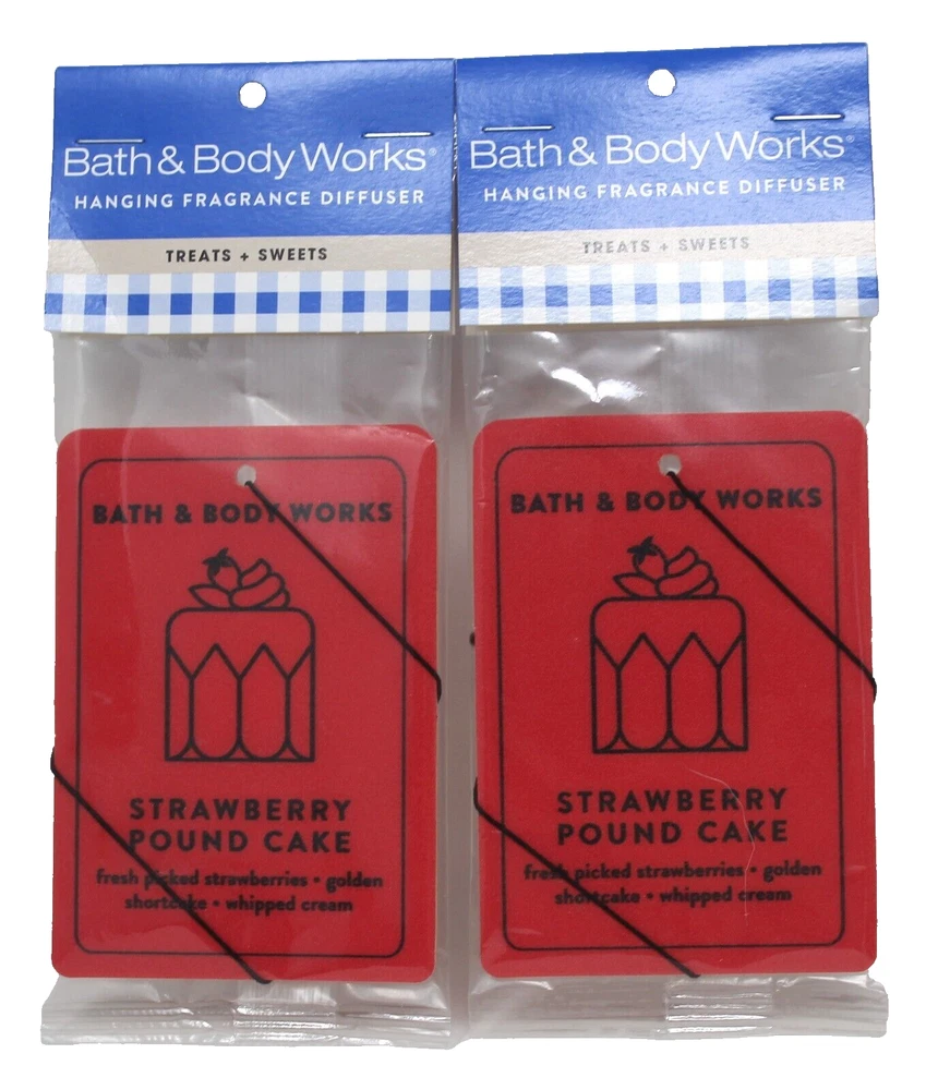 <div style="text-align:center"><img src="http://ti2.auctiva.com/sw/java.gif" border="0"><br><table align="center"><tr><td><a style="text-decoration:none" href="http://emporium.auctiva.com/Dimpl28" target="_blank"><img src="http://ti2.auctiva.com/sw/browse2.gif" border="0"></a></td><td height="21px" valign="middle" align="center"><font face="arial" size="2"><b><a href="http://emporium.auctiva.com/Dimpl28" target="_blank">Dimpl28</a> Store</b></font></td></tr></table></div> Bath & Body Works Strawberry Pound Cake Hanging Fragrance Diffuser Lot of 2 We have been selling on eBay since 2002 and have always had a good standing with eBay due to our integrity. All our products are 100% authentic. To sell anything other than that is illegal and immoral. We do not ship internationally unless it's to a military address, in which case, we are honored to do so. All orders are double checked before shipping out to avoid any mistakes. We are honest and upfront about items and the condition of items. Once an item is purchased, the address cannot be changed nor can the order be canceled. Our handling time is 2 days, unless we’re out of town and then it will be changed to reflect any delay. Our customers make this business possible and I truly appreciate each & every one of you! Thank you!