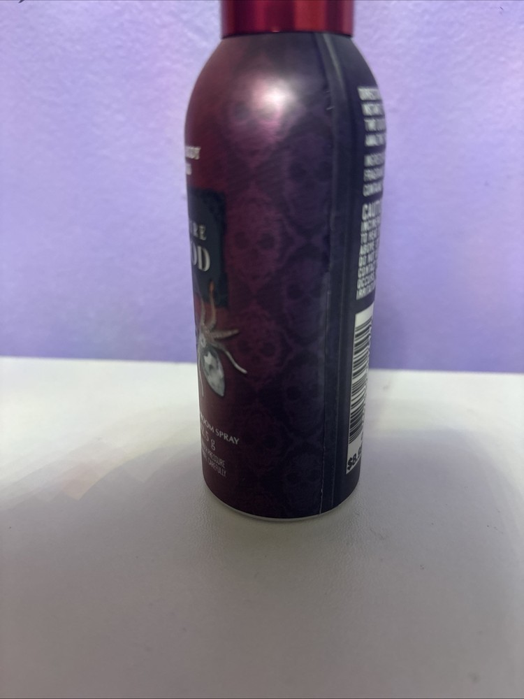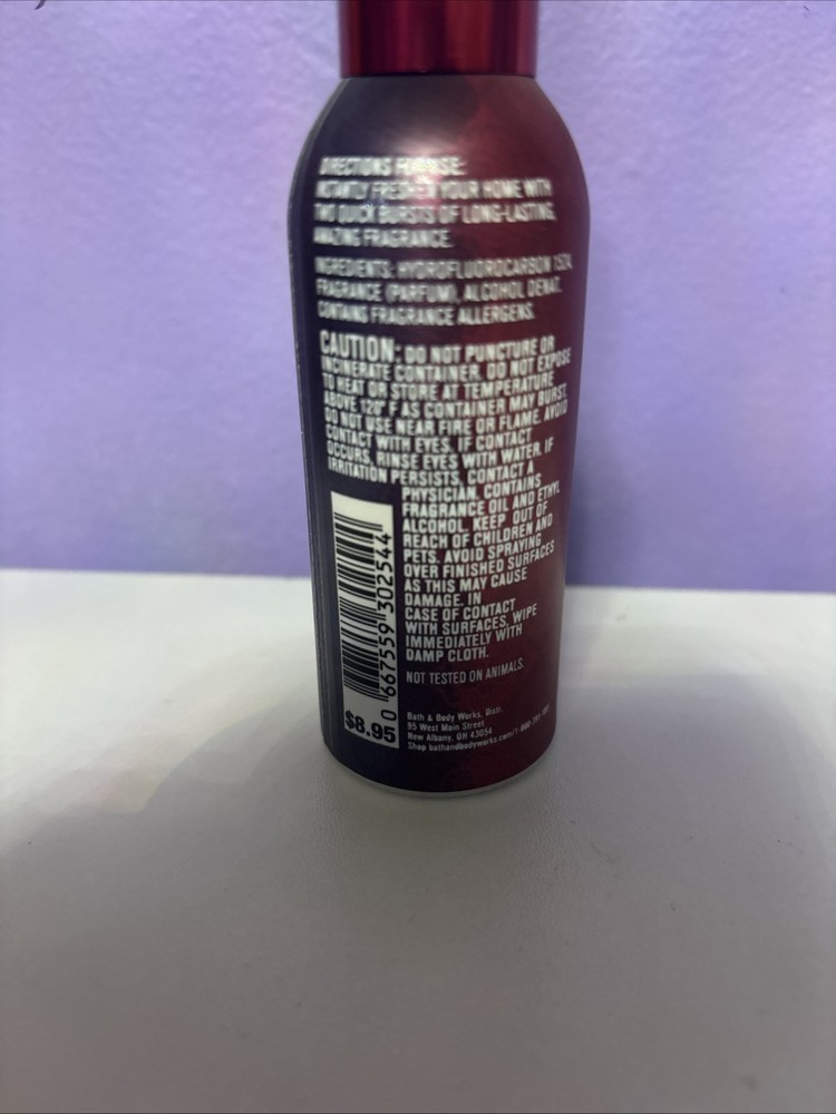 This is a Bath & Body Works Vampire Blood Room Spray in a 1.5 fl oz mist spray bottle. It is suitable for home use indoors, with a metal container and aerosol power source. The spray is 100% concentrated, featuring a deodorizing and odor-eliminating formula. The scent is Vampire Blood, made in the United States for use in any room.
