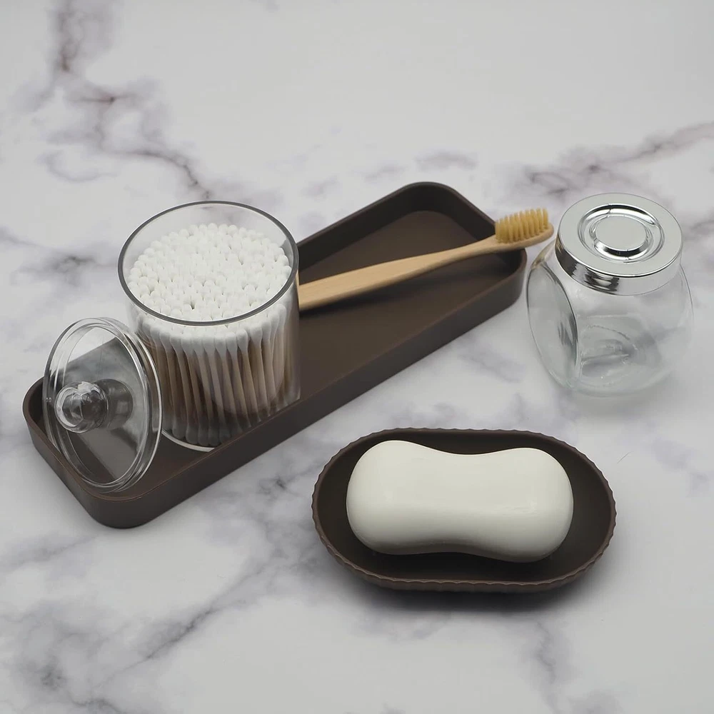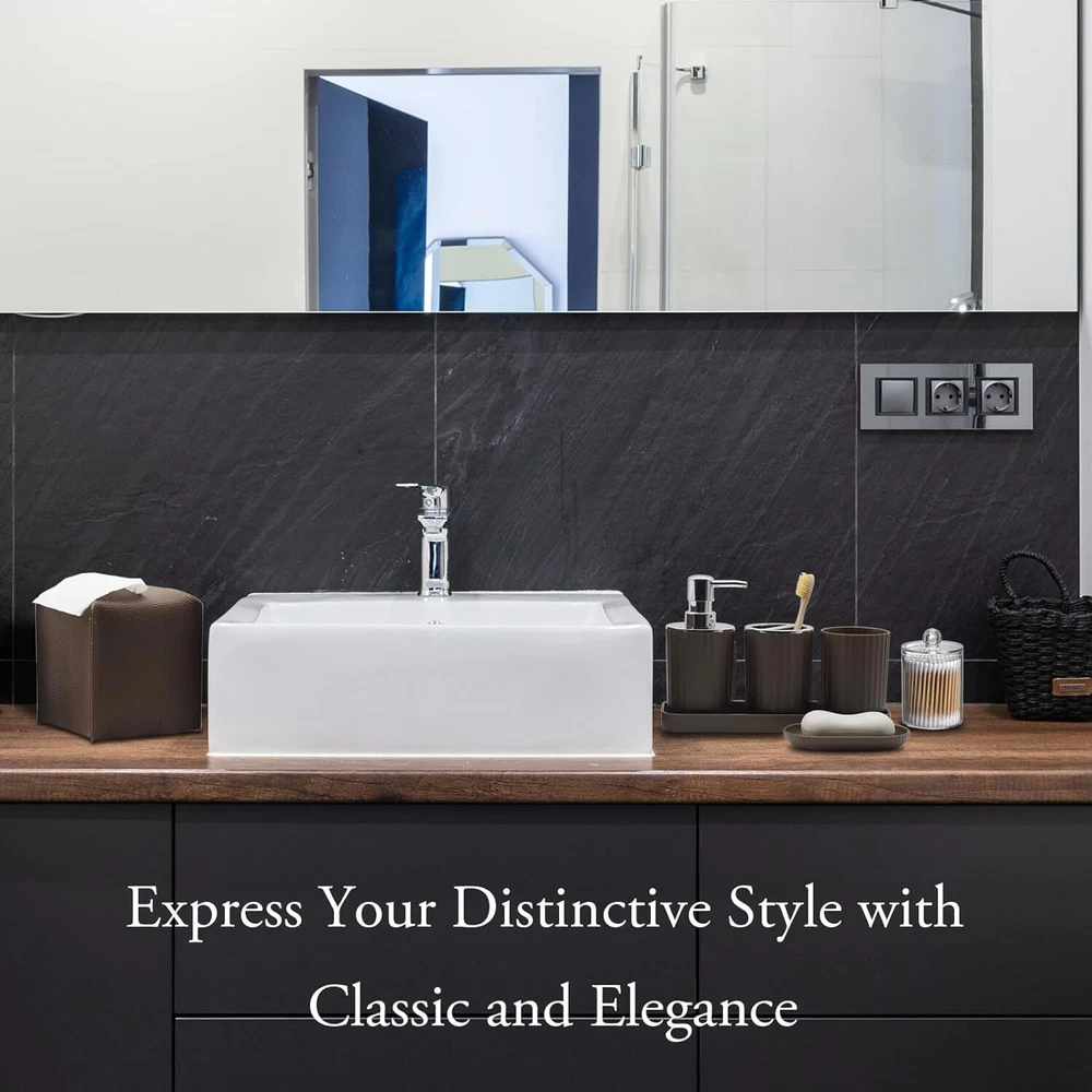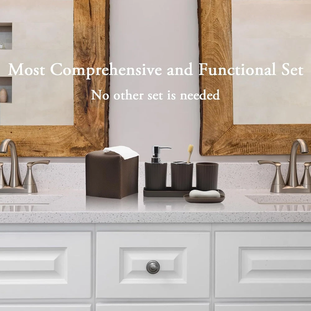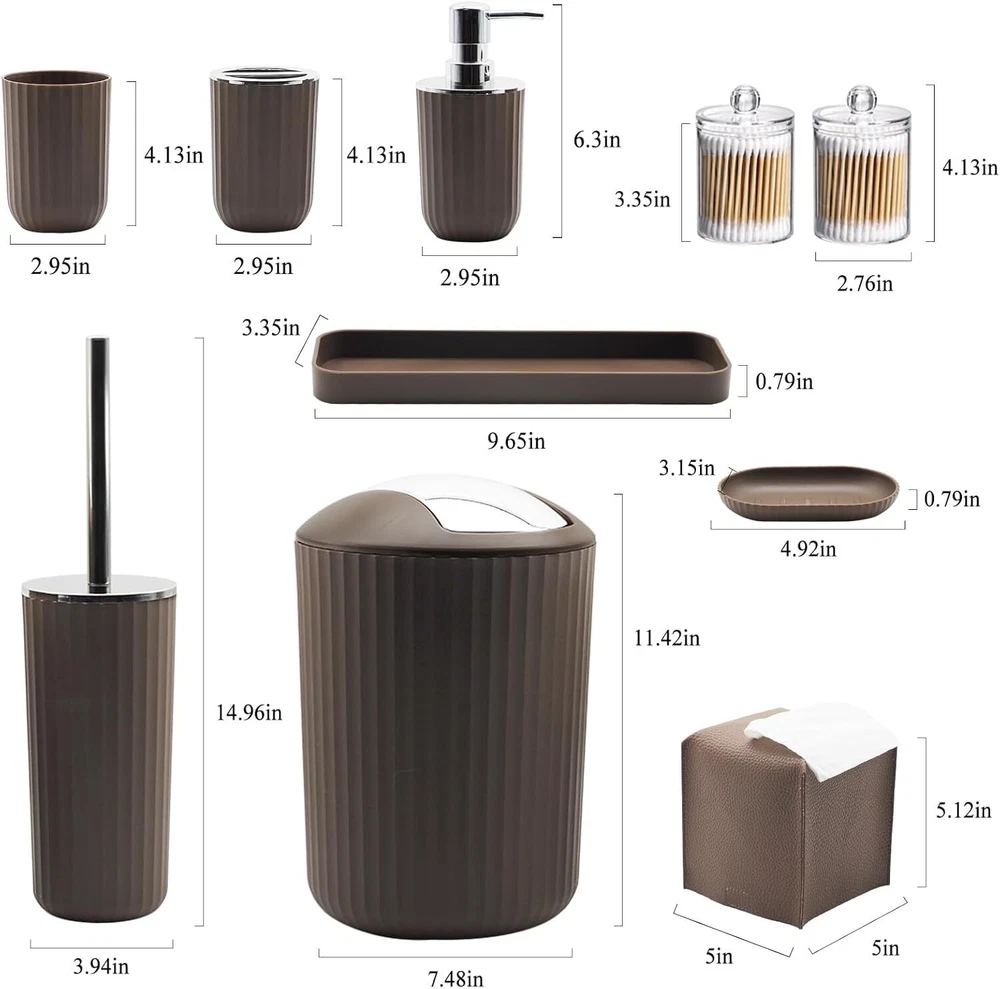 Bathroom Accessory Set - 10 Piece Brown Accessories with Product Details Package Dimensions: 11.42 x 8.07 x 7.64 inches Item Weight: 2.61 pounds Manufacturer: Bthenov Item model number: BN10P Fabric Type: Plastic Number of pieces: 10 Included Components: PU Leather Tissue Box Cover, Bathroom Vanity Tray, Trash Can, 2 Qtip Holders, Toothbrush Holder, Soap Dispenser, Toothbrush Cup, Toilet Brush and Holder, Soap Dish Plastic Bathroom Set 10 PCS - Bthenov bathroom accessory set includes 1 toothbrush holder, 1 toothbrush cup, 1 soap dispenser, 1 soap dish, 1 vanity tray, 1 trash can, 1 toilet brush and holder, 2 qtip holders, 1 leather tissue box cover. All the bathroom accessories you need for your bathroom are here. The Most Comprehensive Set - This bathroom accessories set is the last set you will ever need to purchase. With this brown bathroom set, you can organize almost everything in bathroom, making the most of your bathroom space and keeping it clean and tidy. Also suitable for living room, bedroom, kitchen, guest room, etc. Solid and Durable - The brown bathroom accessories set is made of high quality plastic, sturdy, non-friable, easy cleaning, more durable than glass or ceramic. And the 2 qtip holders made of thick clear smooth plastic are perfect organizer for small objects such as Q-tip, cotton ball, floss picks, etc. Classy and Chic Addition - The brown tissue box cover will add a touch of elegance to your bathroom, match perfectly with the rest of the brown bathroom accessories. Made of premium PU leather, easy cleaning with wet cloth. The bottom velcro belt keeps the tissue box securely and easy to replace. Perfect size (5" x 5" x 5.12") to hold most standard square tissue box. This square tissue box holder is the ideal addition to your bathroom. Attractive and Functional - Unique and minimalist look, both functional and decorative, this bathroom decor sets accessories is the finishing touch to your bathroom. The bathroom accessories sets complete will make your bathroom the place to be. Ideal for housewarming gifts, birthday gifts, wedding gifts, new house gifts, Christmas gifts, etc.