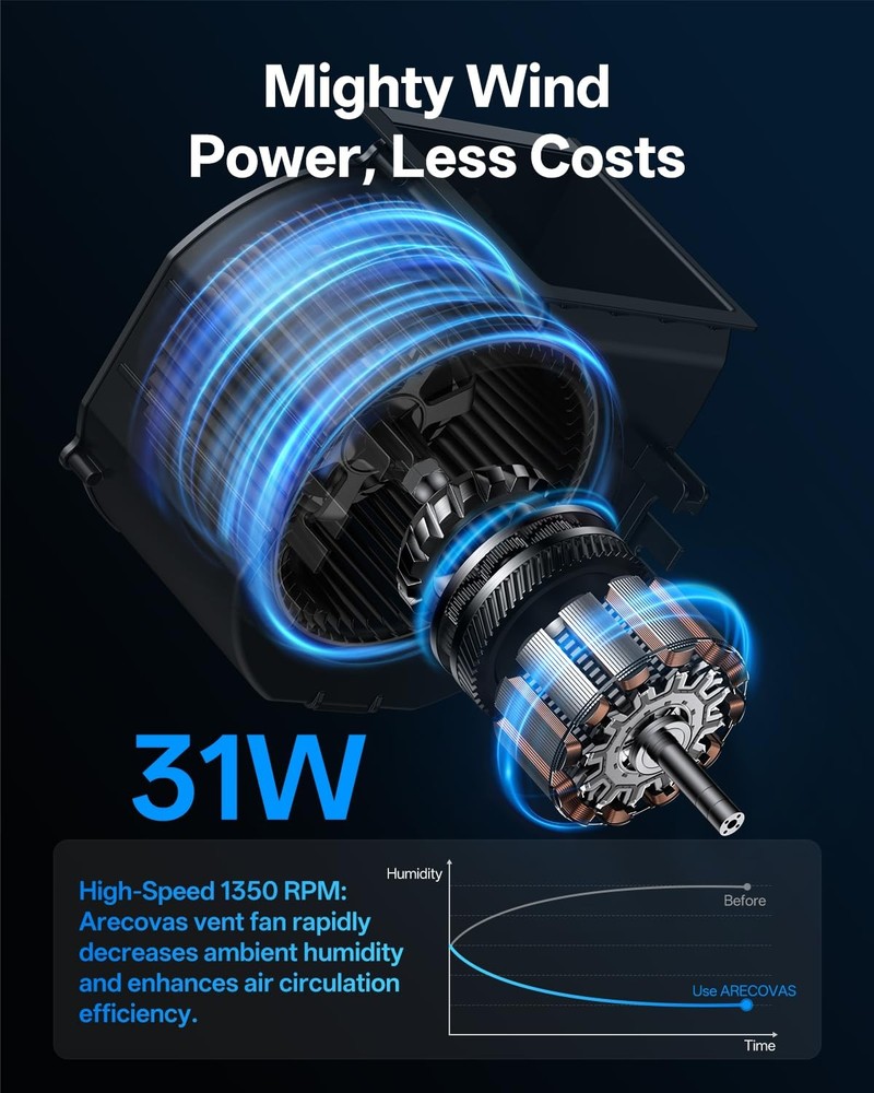 Before purchasing Arecovas exhaust fan, please confirm that the installation space has been divided into two wires and the corresponding double-switch control panel is left on the wall. Applicable area: Apartment - floor height is about 8ft, applicable area is 103ft²-154ft². Single-family house - floor height is about 9.2ft, applicable area is 90ft²-135ft² Powerful 110 CFM Airflow: Experience superior ventilation with a high-performance 110 CFM airflow, this bath exhaust fan effectively reduces humidity in bathrooms. And ensures you stay cozy while showering, bathing, makeup, skin care, shaving, etc. RGB Lighting: Personalize your bathroom ambiance with 4 stunning color options – Blue, Purple, Red, and Green. You can also choose the automatic cycle RGB mode to enjoy the colorful lighting experience. Lamp panel diameter 11.61inch, illumination 1200LM 3CCT Lighting with 5 Brightness Levels: Adjust the lighting to your preference with 3 color temperatures (Cool, Neutral, Warm) and 5 adjustable brightness levels. Whether you're applying makeup, soaking in the bath, taking a shower, or reading, it delivers perfect lighting tailored to every scenario. Supports light memory, no need to set it repeatedly Energy-Efficient Night Light Mode: 2700K soft warm light, energy consumption as low as 5W. Prevent slipping at night, get up at night to ensure safety, both meet the lighting requirements and do not stimulate the vision Applicable Area: Apartment - floor height is about 8ft, applicable area is 103ft²-154ft². Single-family house - floor height is about 9.2ft, applicable area is 90ft²-135ft² (The effect of use may vary slightly depending on the actual house height) Easy Installation & Low Noise Operation: With a noise level of only 1.0 Sones, this exhaust fan operates quietly. Dual Control Options: Enjoy effortless control with both wall control and remote control options. Easily manage the ventilation fan and lights for maximum convenience. NOTE: The double control switch is not included in the package