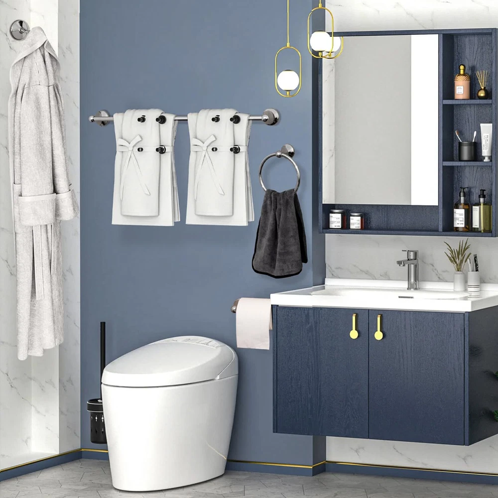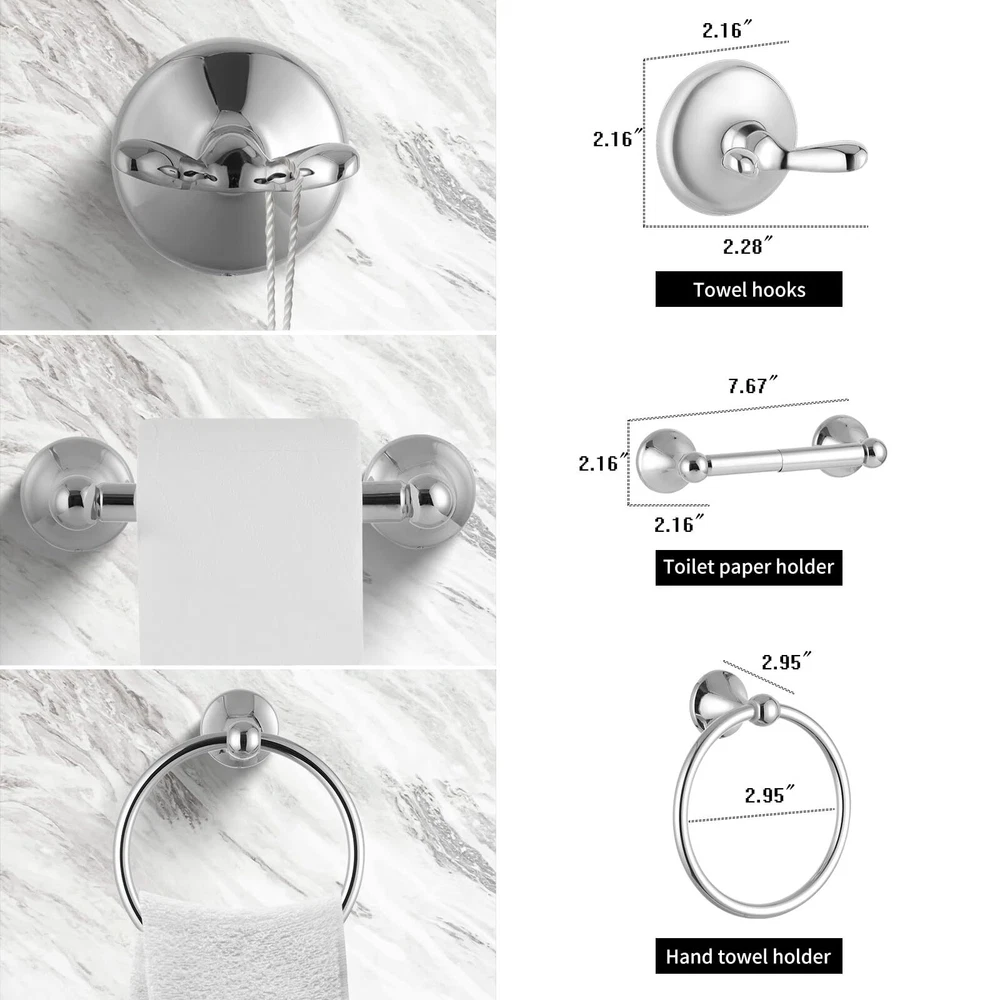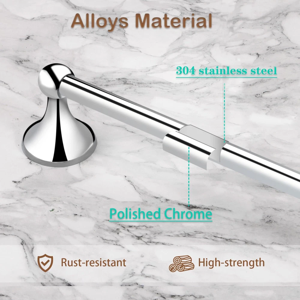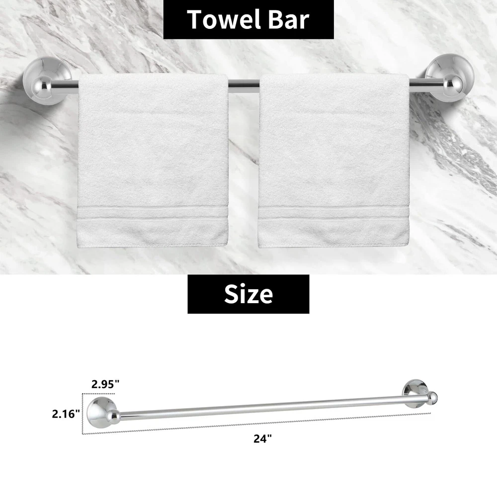 DELICATE APPEARANCE Smooth brushed surface, chamfer edges avoids scratching your body and clothing, Unique round shape and hidden mounting screws add more modern elements for your room decor VERSATILE APPLICATION You can use the towel bars and robe hook in your kitchen, bedroom, bathroom or closets. They are particularly strong and stable, making your home more tidy, beautiful and modern. PREMIUM CONSTRUCTION Enlarge bars and bases constructed of sturdy Zinc alloy, make the bars no easy to bend, which increase safety and firmness. Quality Plating coating ensure anti-corrosion, anti-rust and anti-tarnish. Easy to maintain, premium material and high quality ensures long-term service. DURABLE & SEAMLESS CONNECTION Concealed screw design makes the product look more beautiful and modern, hex screws are reinforced to prevent from rotation. Carefully polished, prevent nick and seamlessly connected between the columns. SPECIFICATIONS Material :Zinc alloy Installation Method : Wall-mounted Surface Finish : Polished Finish Package Includes 1 x 18" Towel Bar 1 x 24" Towel Bar 1 x Toilet paper holder 1 x Robe Towel Hooks 1 x Towel Ring 1 x English Instruction 【Chrome Bathroom Accessories】towel set of 4 included: 1x 24-inch polished chrome towel bar, 1x towel ring, 1x adjustable chrome toilet paper holder and 1x chrome towel hooks to keep your shower organized and tidy, ensuring towels, bathrobes and paper towel rolls are easily accessible Access and store properly. 【Polished chrome Towel Bar】towel hanger for bathroom are polished through multiple processes to make them seamless and smooth, protecting them from scratches during use. The smooth brushed surface features a classic design with a minimalist style with clean and graceful lines, giving your bathroom a stylish look. 【Metal Material】The rods of bathroom towel are made of thickened SUS304 stainless steel, durable, not easy to appear daily scratches, thickened diameter of the tube so that the towel bar is not easy to bend. Exquisite spray paint makes the bathroom towel holder set not easy to fade, the surface polished chrome alloy, make this bar more novel, bright colors. 【Easy to Install】We provide all the installation screw accessories needed for the wall towel rack in the package, and an installation instruction manual is also provided in the package, you don't need to worry about how to install it, and we will provide 24-hour online service 【Classic Design】Our bathroom fixtures has a minimalist style with clean and graceful lines, making it easy to match a variety of styles. A classic look like our towel holder for bathroom wall won't go out of style.