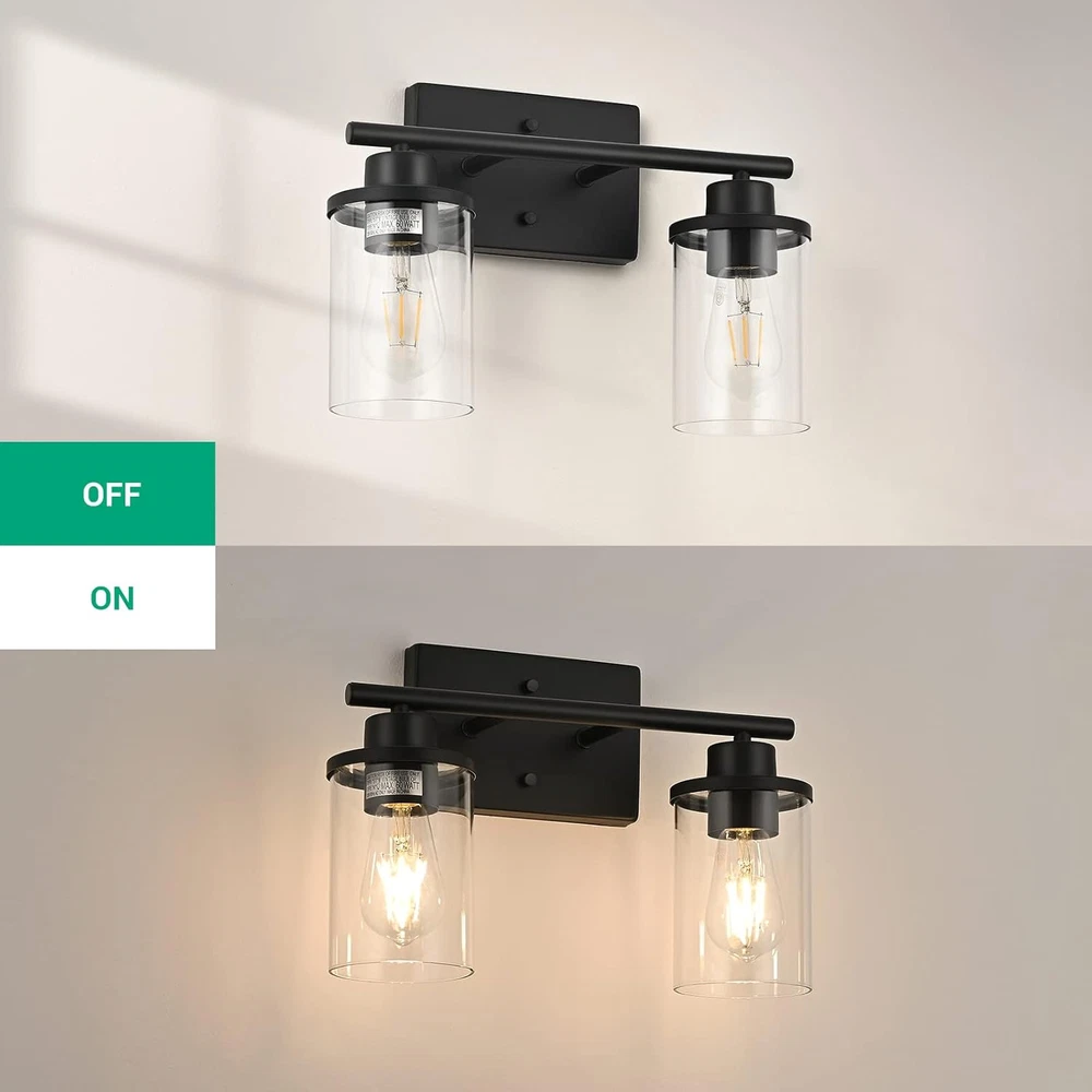 Lighting Method: LED, CFL, Incandescent Included Components: Mounting Hardware Batteries Required?: No Light Source Type: LED, Fluorescent, Incandescent Warranty Type: Limited Color: Black Specific Uses For Product: Home Finish Type: Matte Black Style: Classic Special Features: Dimmable Fixture Type: Non Removable Unit Count: 1.0 Count UPC: 313025637671 Bulb Base: E26 Specification Met: ETL Mounting Type: Wall Mount Installation Type: Semi Flush Mount Efficiency: uses energy-efficient LED bulbs Brightness: 800 lumen Model Name: Matte Black Bathroom Light Fixtures Shape: Rectangular prism or rectangular solid Special Feature: Dimmable Light Color: White Theme: Modern & Elegant Country of Origin: China Number of Items: 1 Assembly Required: No Room Type: Kitchen, Bathroom, Bedroom Item model number: HHVL01B Item Weight: 3.67 pounds gtin13: 313025637671 Wattage: 60 watts Number of Light Sources: 2 Brand: Does not apply Shade Color: Clear Power Source: Corded Electric Finish: Matte Black Control Method: Remote Switch Type: Push Button Material: Glass Voltage: 120 Volts Indoor/Outdoor Usage: Indoor Shade Material: Glass Controller Type: Push Button Type: Does not apply Light fixture form: Sconce Plug Format: A- US style