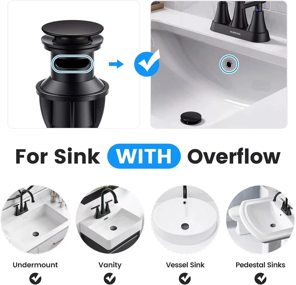 Bathroom Sink Drain with Overflow, Hurran Matte Black Universal Bathroom Sink St Universal Bathroom Sink Drain With Overflow: Fits Standard 1 3/4" Drain Hole Fits sink hole diameter of 1.65" -1.9"(Kindly measure your sink dimension and confirm the same.). Suitable for sink thickness varying from 0.8"-1.9". Ideal for undermount, vanity, vessel sink, pedestal sinks WITH OVERFLOW. Premium Pp Material, Never Peel& Rust: The bathroom sink drain pipe body is constructed of premium PP material, it's extremely tough, sturdy, anti-cracking and effectively prevents water leakage. Anti-fingerprint Matte Black finish, build to resist corrosion and tarnishing. There will be slight difference between the image and the original product. Quick Draining: Sloping drain outlet and modern large button design bathroom sink drain (2.2 inches, tennis ball size). Very easy to use, just press to stop water and press again to drain water. No More Clogged Drains, No Leaks: Built-in anti-clogging sink drain strainer basket hair catcher to collect hair and dirt neatly and prevent ring lost. The top cap of sink drain easily unscrews, so future cleaning is super easy. The design of the integrated bathroom sink drain pipe and double elastic gasket prevents the possibility of water leakage. ---Universal Bathroom Sink Drain With Overflow: Fits Standard 1 3/4" Drain Hole Fits sink hole diameter of 1.65" -1.9"(Kindly measure your sink dimension and confirm the same.). Suitable for sink thickness varying from 0.8"-1.9". Ideal for undermount, vanity, vessel sink, pedestal sinks WITH OVERFLOW. ---Premium Pp Material, Never Peel& Rust: The bathroom sink drain pipe body is constructed of premium PP material, it's extremely tough, sturdy, anti-cracking and effectively prevents water leakage. Anti-fingerprint Matte Black finish, build to resist corrosion and tarnishing. There will be slight difference between the image and the original product. ---Quick Draining: Sloping drain outlet and modern large button design bathroom sink drain (2.2 inches, tennis ball size). Very easy to use, just press to stop water and press again to drain water. ---No More Clogged Drains, No Leaks: Built-in anti-clogging sink drain strainer basket hair catcher to collect hair and dirt neatly and prevent ring lost. The top cap of sink drain easily unscrews, so future cleaning is super easy. The design of the integrated bathroom sink drain pipe and double elastic gasket prevents the possibility of water leakage. Bathroom Sink Drain with Overflow, Hurran Matte Black Universal Bathroom Sink St Universal Bathroom Sink Drain With Overflow: Fits Standard 1 3/4" Drain Hole Fits sink hole diameter of 1.65" -1.9"(Kindly measure your sink dimension and confirm the same.). Suitable for sink thickness varying from 0.8"-1.9". Ideal for undermount, vanity, vessel sink, pedestal sinks WITH OVERFLOW. Premium Pp Material, Never Peel& Rust: The bathroom sink drain pipe body is constructed of premium PP material, it's extremely tough, sturdy, anti-cracking and effectively prevents water leakage. Anti-fingerprint Matte Black finish, build to resist corrosion and tarnishing. There will be slight difference between the image and the original product. Quick Draining: Sloping drain outlet and modern large button design bathroom sink drain (2.2 inches, tennis ball size). Very easy to use, just press to stop water and press again to drain water. No More Clogged Drains, No Leaks: Built-in anti-clogging sink drain strainer basket hair catcher to collect hair and dirt neatly and prevent ring lost. The top cap of sink drain easily unscrews, so future cleaning is super easy. The design of the integrated bathroom sink drain pipe and double elastic gasket prevents the possibility of water leakage. Universal Bathroom Sink Drain With Overflow: Fits Standard 1 3/4" Drain Hole Fits sink hole diameter of 1.65" -1.9"(Kindly measure your sink dimension and confirm the same.). Suitable for sink thickness varying from 0.8"-1.9". Ideal for undermount, vanity, vessel sink, pedestal sinks WITH OVERFLOW. Premium Pp Material, Never Peel& Rust: The bathroom sink drain pipe body is constructed of premium PP material, it's extremely tough, sturdy, anti-cracking and effectively prevents water leakage. Anti-fingerprint Matte Black finish, build to resist corrosion and tarnishing. There will be slight difference between the image and the original product. Quick Draining: Sloping drain outlet and modern large button design bathroom sink drain (2.2 inches, tennis ball size). Very easy to use, just press to stop water and press again to drain water. No More Clogged Drains, No Leaks: Built-in anti-clogging sink drain strainer basket hair catcher to collect hair and dirt neatly and prevent ring lost. The top cap of sink drain easily unscrews, so future cleaning is super easy. The design of the integrated bathroom sink drain pipe and double elastic gasket prevents the possibility of water leakage.