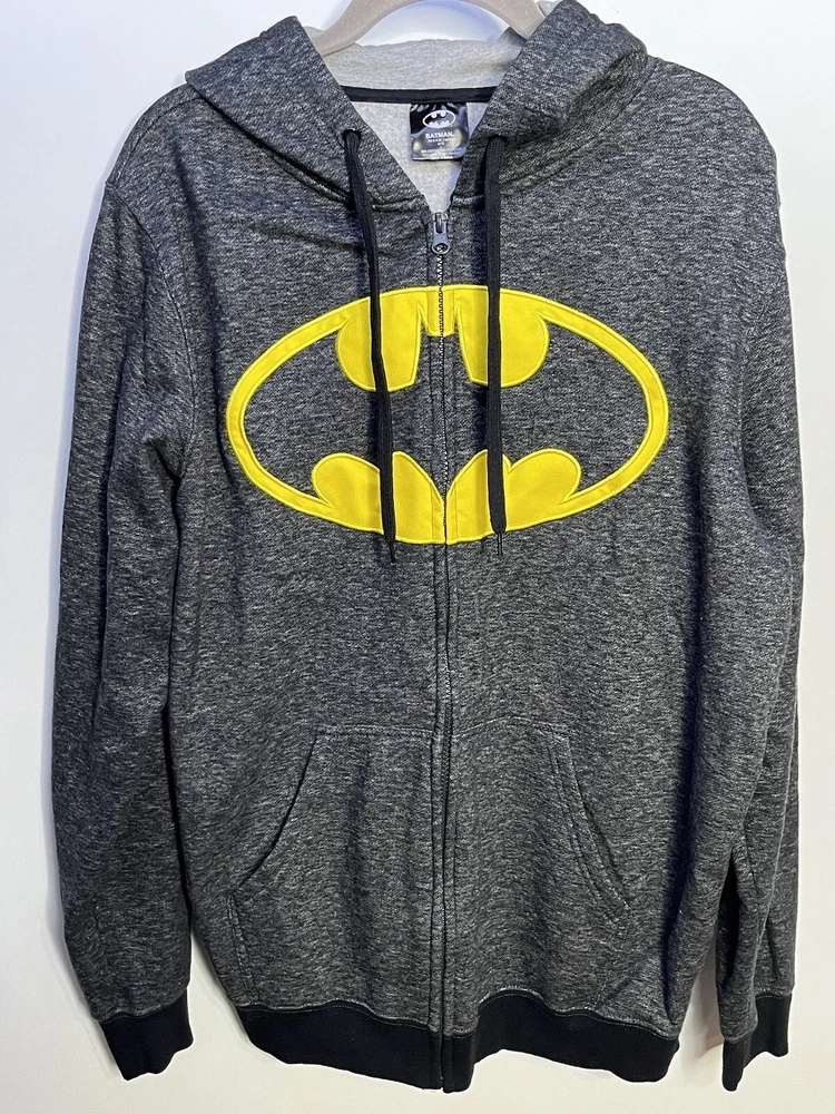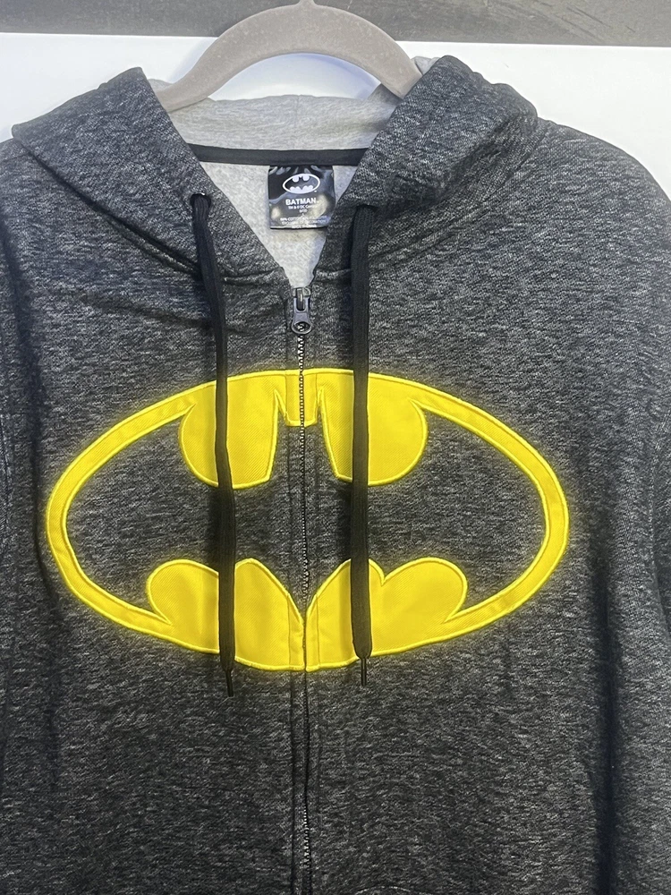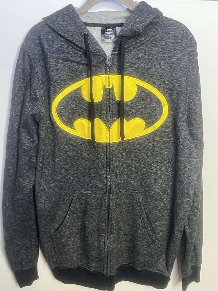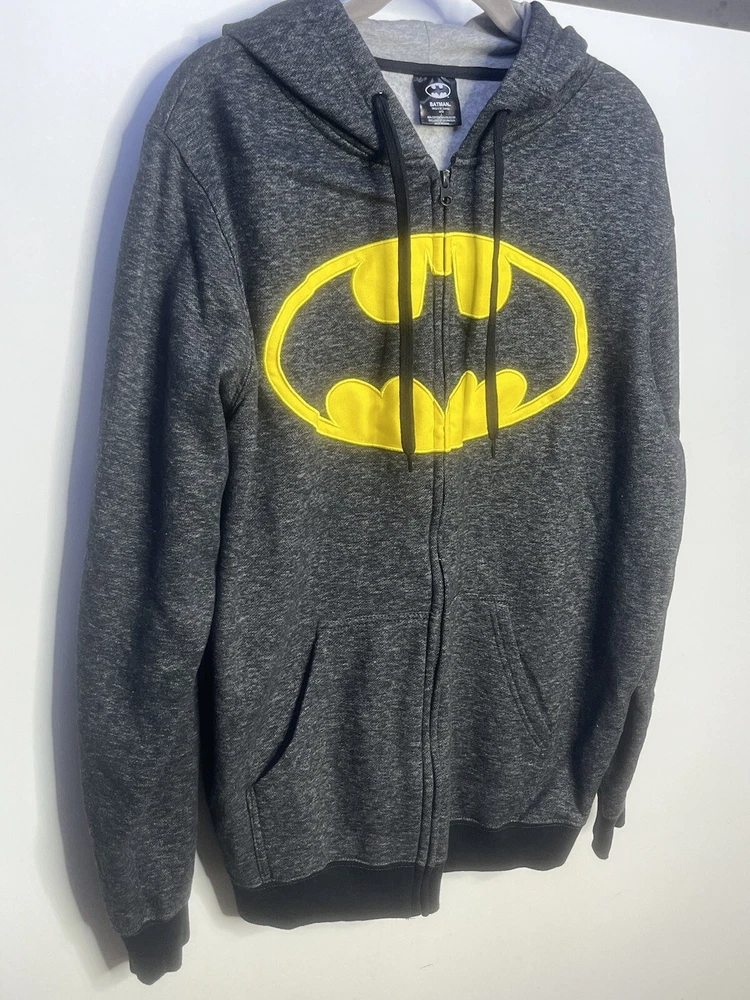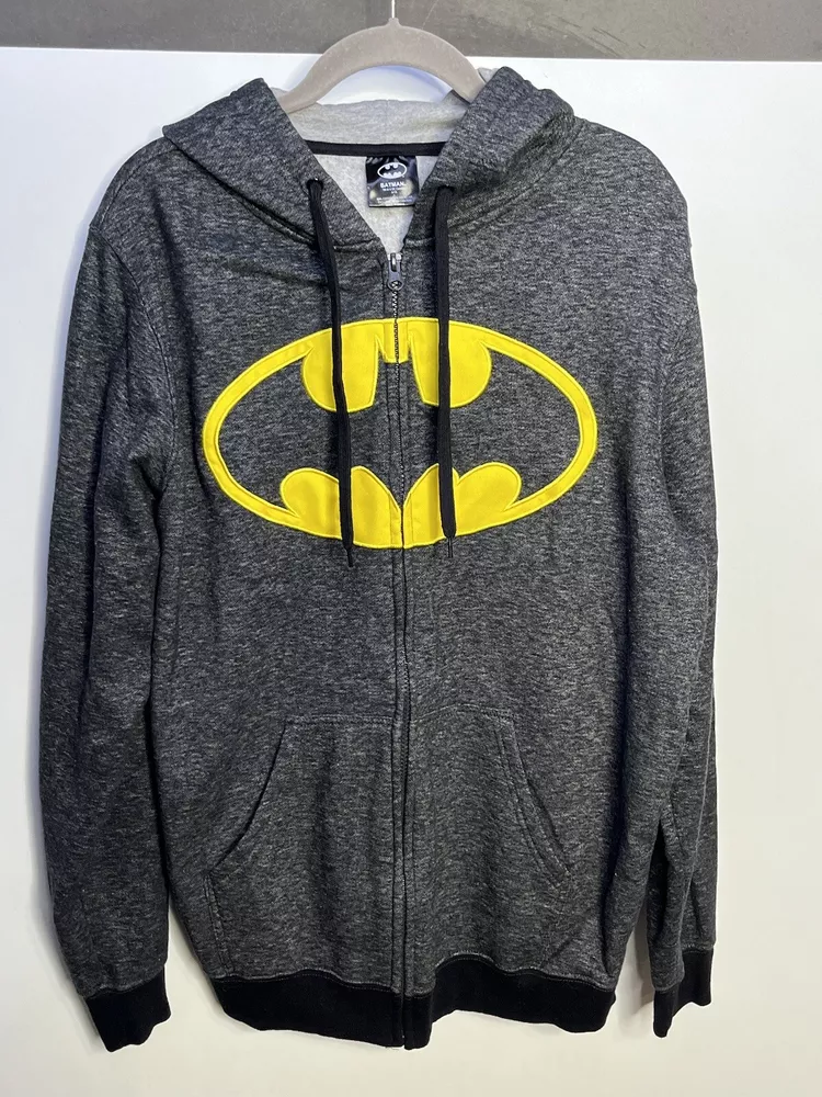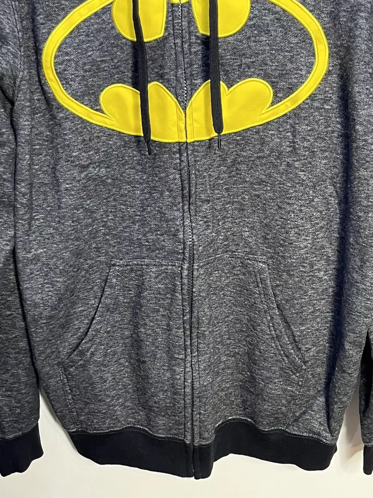 Batman hoodie jacket Men’s L Gray patch yello embroidered kangaroo pockets logo Full Zip Hoodie Good pre owned condition, little to no signs of wear. Measurements are in the photos. I discount shipping for multi item purchases. Thank you for supporting my small business.