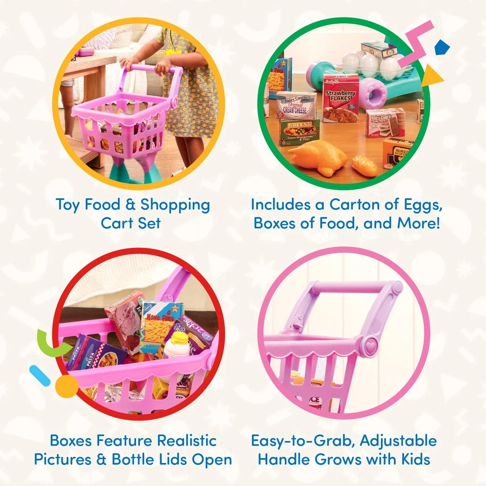 The Play Circle Shopping Day Grocery Cart is a 30-piece plastic shopping cart for kids that will have them running down the aisles of their imagination! Feed your child’s passion for playtime with the unlimited discovery possibilities that this adorable mini shopping cart and pretend food set can offer. Inside this children’s shopping cart you’ll find a variety of lifelike boxed food items, realistic miniature canned foods, and plastic “fresh” foods that will provide hours of fun. A fantastic gift that provides different role-play and learning opportunities at a variety of ages and developmental stages, this play set is great when combined with other imaginary-play items like the Princess Birthday Party, the Cha-Ching Cash Register, and the Dishes Wishes dish and utensil set. Help your child stock their cupboards with memories and creativity! Shopping Cart And Play Food Set Sized Perfectly For Small Hands And Bigger Imaginations Adjustable Handle Is Easy To Grab And Great For Various Heights, And The Durable Plastic Wheels (That Won’T Leave Scratches) Are Easy To Push On Carpets Or Hard Floors Realistic Details Like “Nutrition Information, ” Lids That Open, And Detailed Fruits And Vegetables (In Funny Sizes For More Giggles) Includes: (1) Pink Shopping Cart, (15) Food Boxes, (1) Mineral Water Bottle, (1) Milk Bottle, (1) Pear Juice Can, (1) Chicken Noodle Soup Can, (1) Loaf Of Bread, (1) Chicken, (6) Eggs, (1) Plastic Egg Carton, And (1) Banana