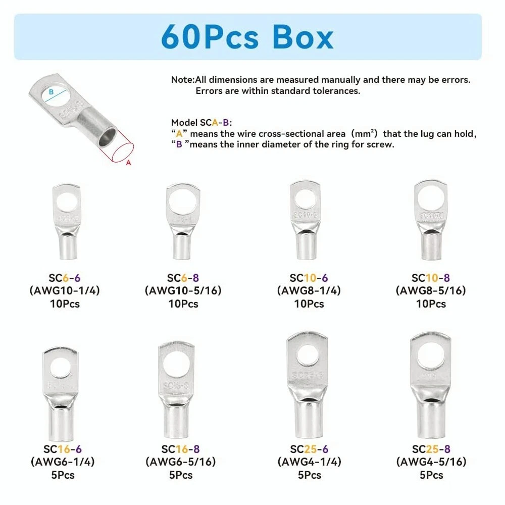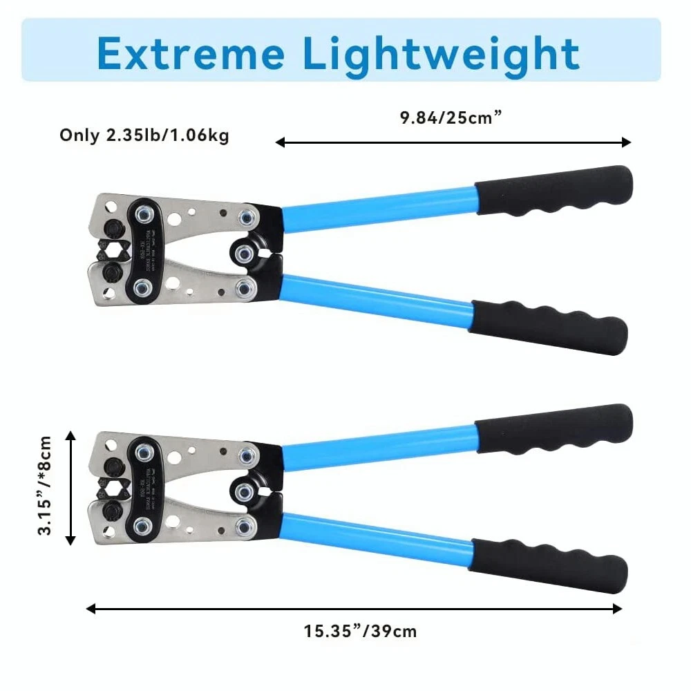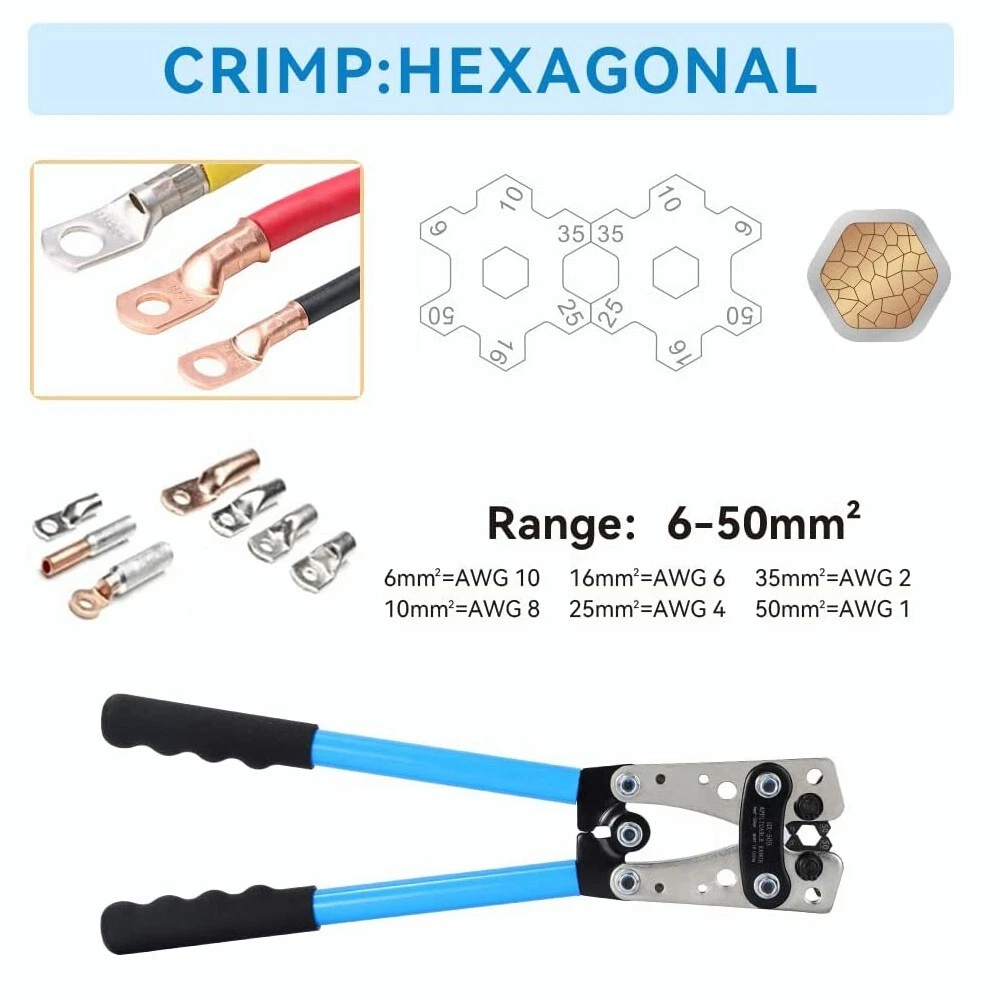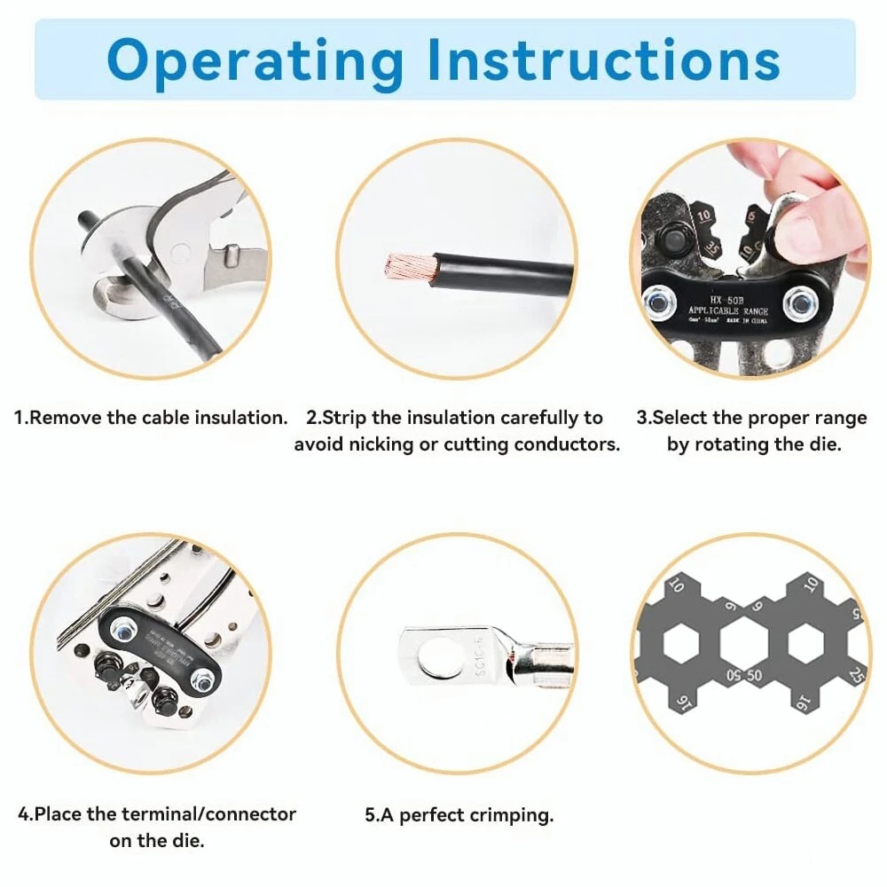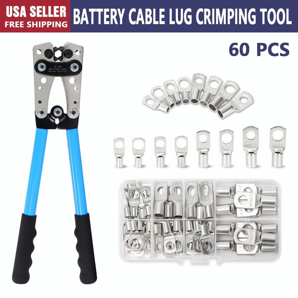 brightfai99 无标题文档 1 FEATURES: 【Lightweight】 The use of high-strength aluminum alloy handle, significantly reducing the weight of the product, the use of more labor-saving. (Approx. 2.35 lbs.) 【Rotatable Crimp Jaw】 Secured by spring-loaded locking pins, available in 6 crimp sizes - 10, 8, 6, 4, 2, 1 AWG - (6mm²/10mm²16mm²/25mm²/35mm²/50mm²). The non-slip rubber coated handle of this tool makes working more comfortable and effortless. 【Efficient】 The non-slip rubber coated handle of this tool makes working more comfortable and effortless. Press the screw, rotate the crimp to the size you need and simply make a good crimp on the cable lug. 【High Reliability】 The jaw is made by EDM wire cutting process for more durability and precision.The crimper body is made of high quality steel die-casting. They are subjected to strict quality inspection process before leaving the factory. 【Package Contents】 1 x HX-50B Crimper, 60 x Sc Ring Lugs. SPECIFICATION: 60Pcs Copper Wire Lugs - Battery Cable Ends - 8 Sizes Terminals AWG, Stud Size and Quantity: SC 6-6 10 Pcs Cable Diameter: 6mm² (10 AWG), Screw Hole Diameter: 6mm(1/4'') SC 6-8 10 Pcs Cable Diameter: 6mm² (10 AWG), Screw Hole Diameter: 8mm(5/16'') SC10-6 10 Pcs Cable Diameter: 10mm² (8 AWG), Screw Hole Diameter: 6mm(1/4'') SC10-8 10 Pcs Cable Diameter: 10mm² (8 AWG), Screw Hole Diameter: 8mm(5/16'') SC16-6 5 Pcs Cable Diameter: 16mm² (6 AWG), Screw Hole Diameter: 6mm(1/4'') SC16-8 5 Pcs Cable Diameter: 16mm² (6 AWG), Screw Hole Diameter: 8mm(5/16'') SC25-6 5 Pcs Cable Diameter: 25mm² (4 AWG), Screw Hole Diameter: 6mm(1/4'') SC25-8 5 Pcs Cable Diameter: 25mm² (4 AWG), Screw Hole Diameter: 8mm(5/16'') Buyers – Please Note Owing to the differences of light and screen setting,item’s color might be a little bit different from the pictures. Attention: If you receive item damaged,defective,not fit the description or wrong one,please send pictures to us via email within 72 hours,so that we can settle any problems better.The pictures need to contain that; 1.All labels with clear words on the package; 2.Different angles of the products and package to clearly show the problems ; 3.The real products you receive. USA shipping: Our warehouses are situated in City of Industry,California, United States. Items will be send via UPS ,Delivery Time is 2-8 Business Days. If you want USPS,you need to email us and increase the postage. No shipping on Saturdays and weekends. PAYMENT We only support PayPal. If buyers want to delay the patment due to financial problem,please contact us via the ebay message within 3 days. RETURNS In case the item is defective, please inform us within 30 days of receipt, we will arrange reship or refund. Buyers have to pay for the return cost and we will pay the cost for resend . If you are unsatisfied with our item or service, please contact us before leaving any feedback. We are committed to resolve all issues in a friendly and satisfactory manner. We always reply to messages within 2 business days (off-duty at weekend). If you do not get a response from us, then please check your junk or spam mailbox.