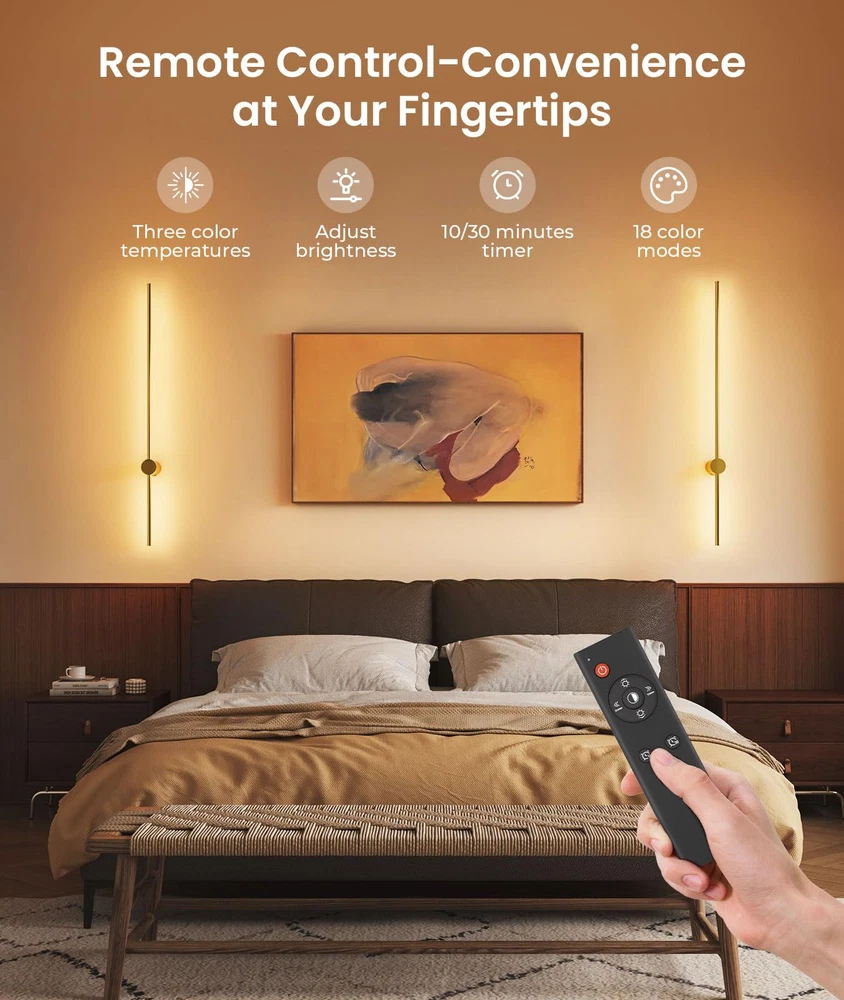 【High-capacity Battery】This battery operated wall sconce features a powerful 10,000mAh battery that charges in just 5 hours and offers an impressive usage time of 10 hours, making it perfect for many different scenes. 【Wireless & Easy to Install】Our rechargeable wall sconces redefine convenience with their hassle-free installation— no wiring or electrician needed, include all mounting hardware for quick and easy installation. The sleek, modern design effortlessly complements any indoor space, providing both practical lighting and stylish appeal. 【Dimmable & Remote Control】Customize your lighting experience with 3 adjustable color temperatures from 3000K to 6000K and five brightness levels (10%-100%), plus 15 RGB colors—all easily controlled via remote. Free your hands.(Note: Batteries are not included in the remote control.) 【Timer & Memory Function】This wireless wall sconces set of two include a 10-minute and 30-minute timer to help you save battery and reduce power use. It also has a memory function that retains your last color and brightness settings, so you don’t need to reset them after powering on again. 【Distinctive Design & Versatile Use】This wall sconce features a unique design and versatile functionality, with a streamlined aluminum body and an elegant matte black finish. Its minimalist yet sophisticated appearance seamlessly integrates with various interior styles. Ideal for enhancing the ambiance of living rooms, bedrooms, stairs, hallway and more. It combines modern aesthetics with practical lighting, making it a stylish and functional choice for any space. 【Service Starts Here】We stand behind our wall sconces with a full 12-month replacement service. If you encounter any issues or defects within this period, we offer a hassle-free replacement. Our dedicated after-sales service ensures that any questions or problems will be addressed within 12 hours. We are committed to providing top-notch support for your purchase.