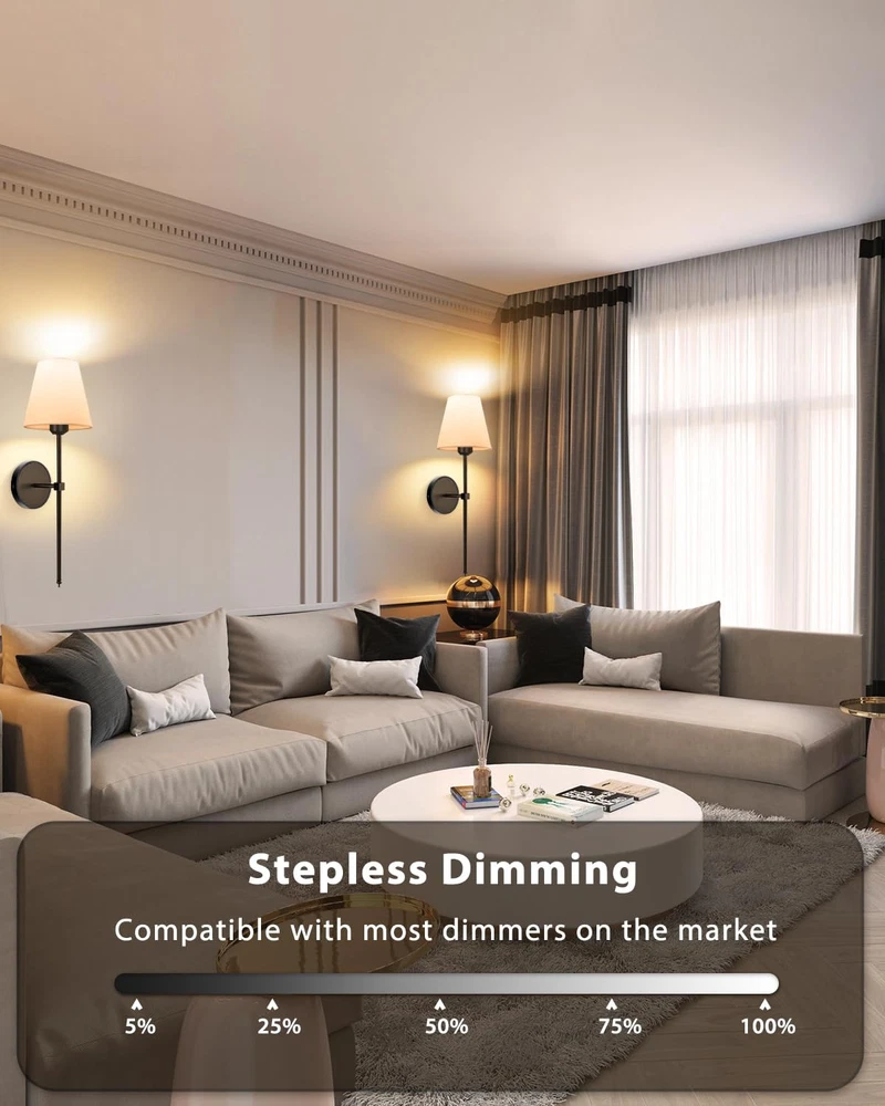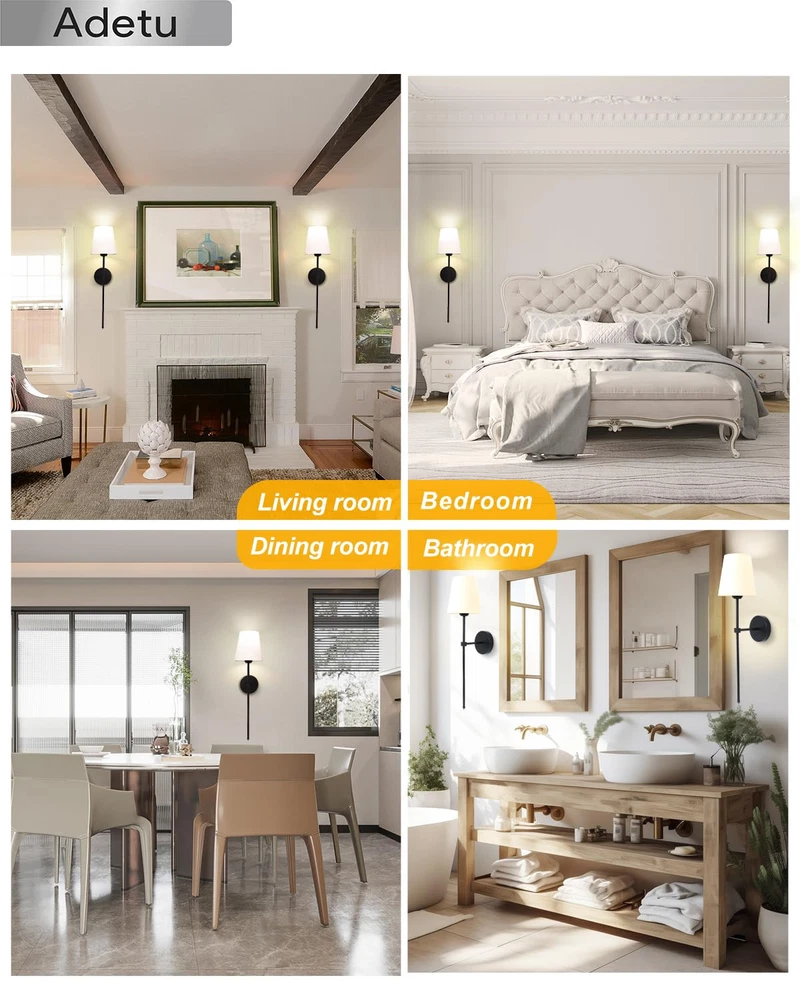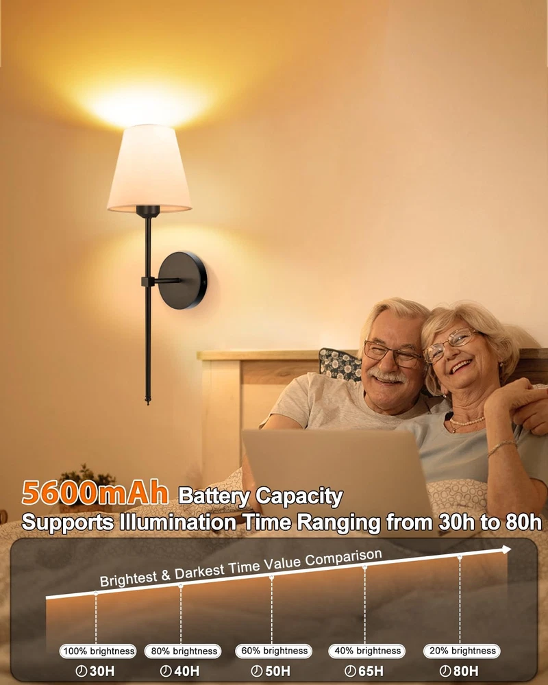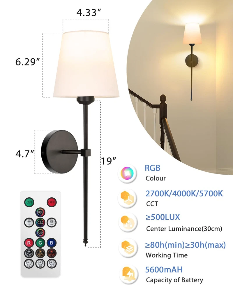🏠Unique Design & High Capacity : wall sconces set of two comes with two firm long - post stand arms, white fabric shades, and two 5600 mAh rechargeable battery - operated light bulbs. It can also work for 30 hours at the highest brightness and 80 hours at the lowest brightness. It will enhance the wall decor of your bedroom, living room, dining room, or hallway. 💡Dimmable & 10 RGB Colors: The rechargeable wall sconce provide three color temperatures—2700K warm, 4000K natural, and 5700K cool white. It can adjust the brightness from 25% to 100% and use the remote to experience 10 RGB light colors, which unique and exquisite design will give you a comfortable and relaxing atmosphere. 🏠Wireless & Remote Control: Wall sconces set of two battery operated comes with the remote control, you can use it anywhere. Whether you are staying in the living room, sleeping in bed, making up in the bathroom, being busy in the kitchen or walking in the corridor, just press or touch the remote control, and you can adjust the battery wall sconce colors you want, making your home full of warmth. 🏠Wall Lights Wide Usages: Battery wall sconces set of two is a good decoration choice for bedroom wall lamp, bedside lamps, battery powered wall sconce, living room wall lamp and dining room wall scones. These battery - operated wall sconces can also be used in closets, above bathroom vanities, on dressing tables, and in the kitchens. 💡Easy Installation: Our set of 2 wireless sconces is easy to install: (1. Install the lampshade and bulb. The bulb can be easily charged and taken out. 2. Use the included screws to mount the sconce light on the wall. 3. Click and use the remote to experience 10 RGB light colors.) 💌After-sell Service & Warranty: Wireless wall sconces set of two included ( 2 * lampshades, 2 * remote control ,2 * Typ-C Cables, 2 * bulbs and 1 * manual ). If you have any questions please contact us through Amazon, will solve all your problems within 12hrs. Click 𝗕𝗨𝗬𝗡𝗢𝗪 and you can buy the battery operated wall sconce set of 2 you want today to make your home bright and cozy.