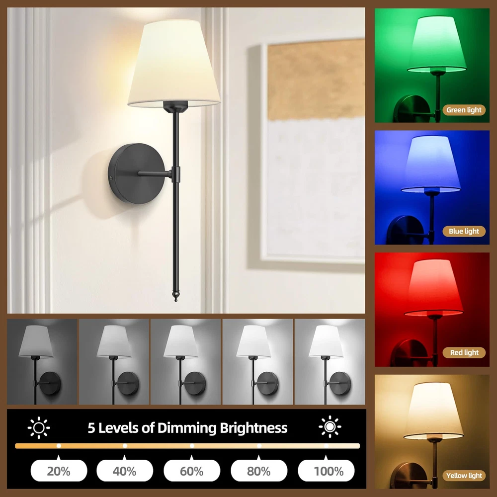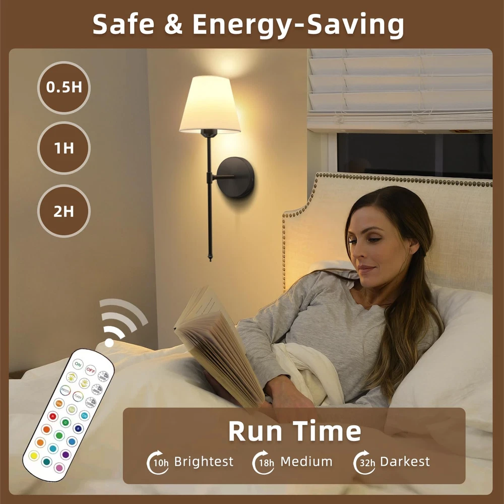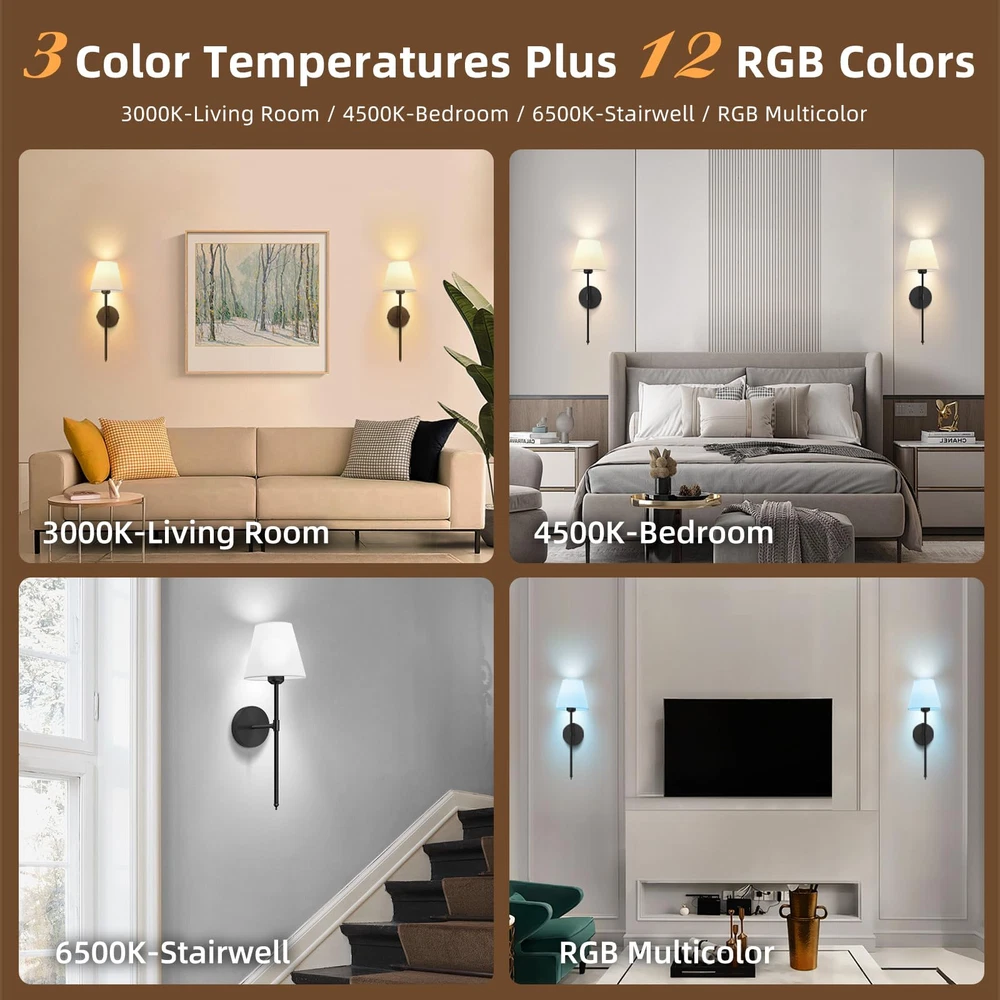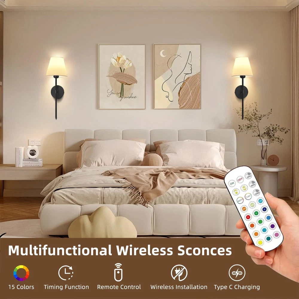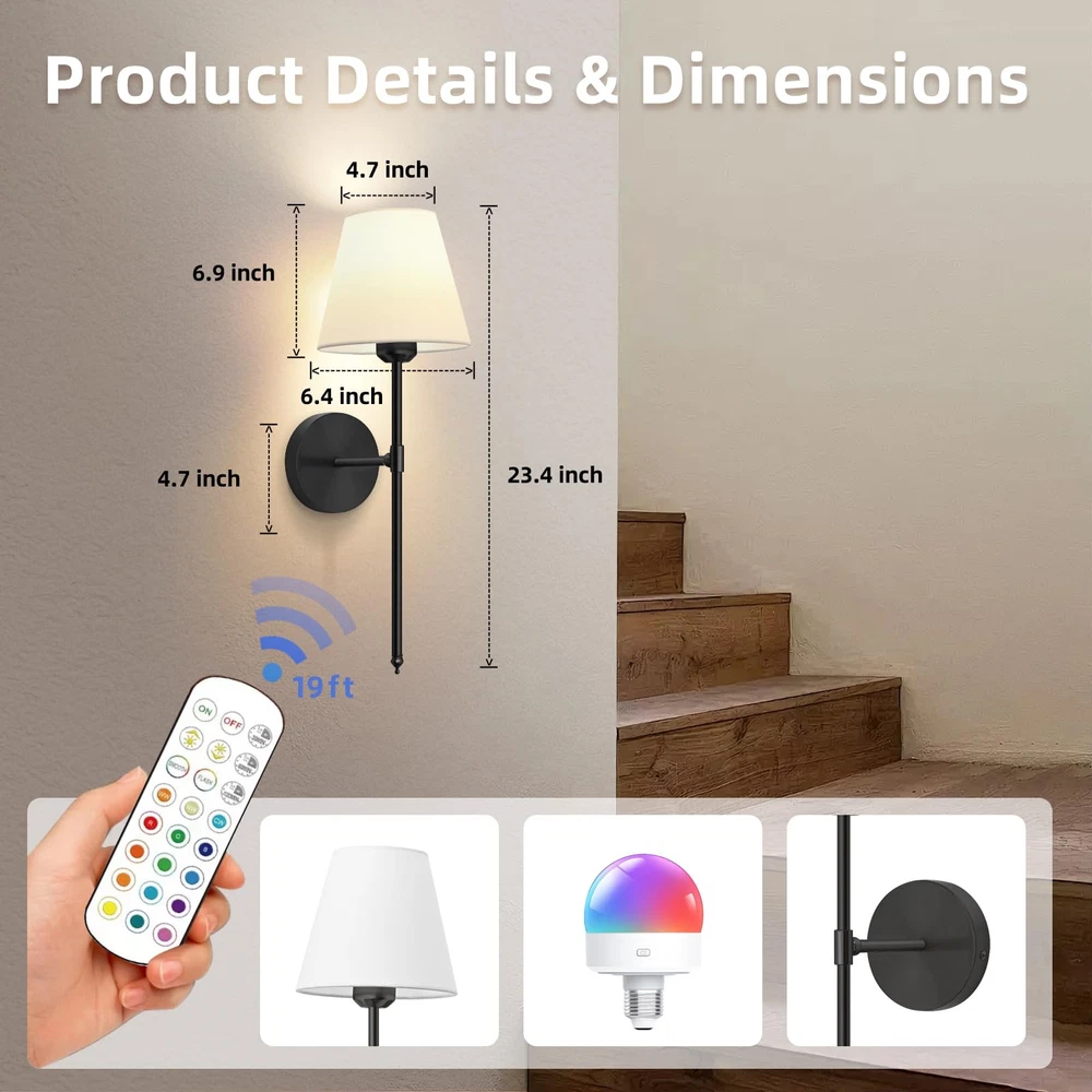 【Battery Operated Wall Sconce Set of 2】Unlike other wireless wall sconces with short battery life that often fail to work properly, ours have long battery life detachable bulb, which can be fully charged within 3 hours with our own Type-C charging cable.They can work continuously for more than 18 hours at medium brightness. Note: Do not use a fast charger over 5V to charge the bulb.What's more, these bulbs are soft, no dazzle, non-flickering, eye caring and longer lifespan.Ideal for creating a romantic ambiance on Valentine's Day and Christmas. 【Wireless Remote Customization: All Colors & Brightness】Choose 3 color temperature modes (3000K-4500K-6000K), 12 RGB colors, 5 brightness levels, 3 timing settings and night light mode through the remote control ensures you have the perfect light setting for any occasion, making it more energy-efficient. 【Easy to Install】 upgraded wall sconces features wireless design allows you safely install it anywhere without worrying about whether there is a socket or connection port. It minimizes damage to the wall and you can also replace it at any time. 【E26 Replaceable 15-Color RGB Bulbs Included】The wall lights come with 15-color RGB bulbs, allowing you to change the color to suit your mood or occasion. These bulbs have a lifespan of up to 40,000 hours, ensuring long-lasting and versatile lighting options. 【Perfect for Any Home Decor】These wall lamps are perfect for your living room, office, vanity, or even dark areas like hallways, closets, and corridors. We prioritize customer needs, providing high-quality products and excellent customer service. If you encounter any quality issues within 24 months, please contact us.