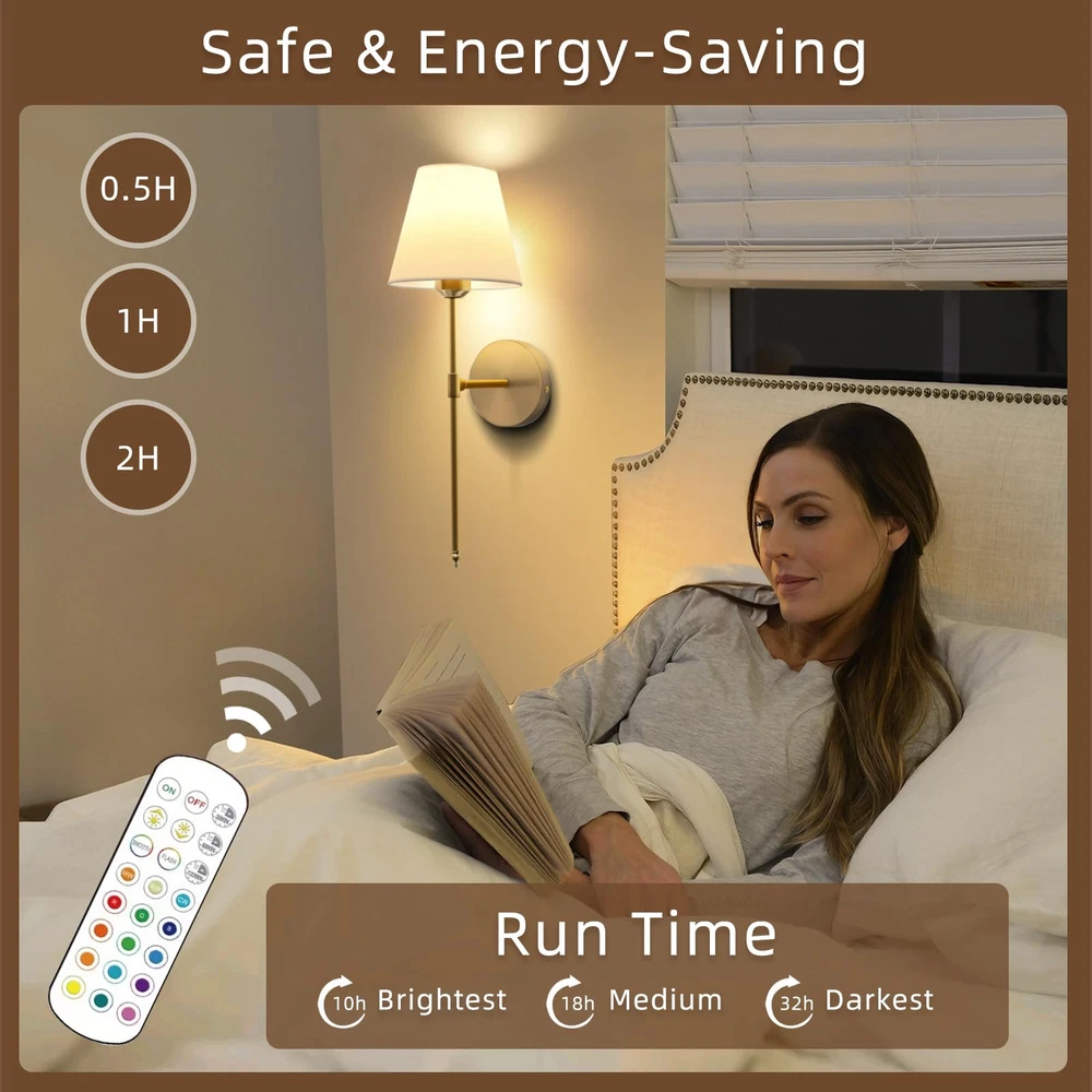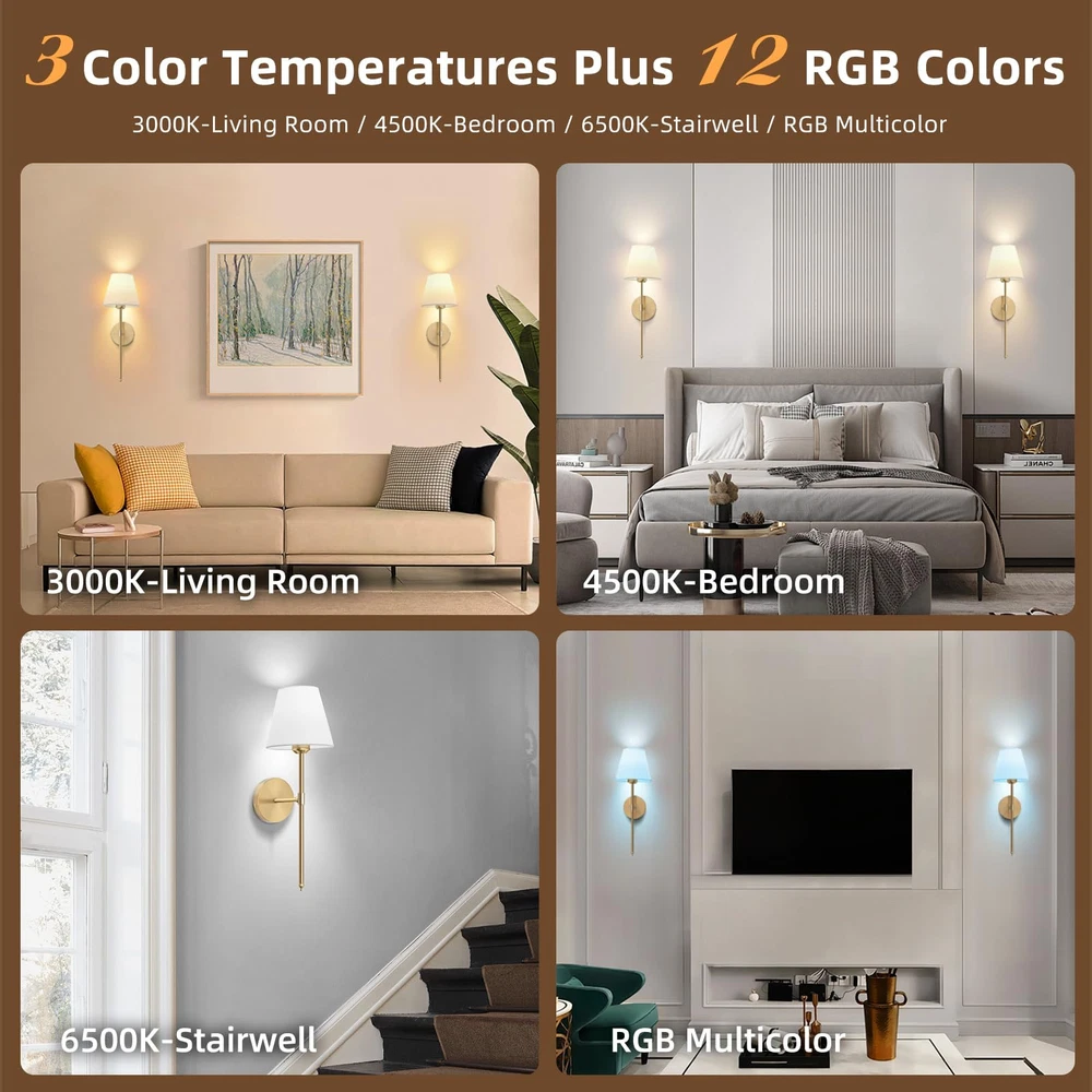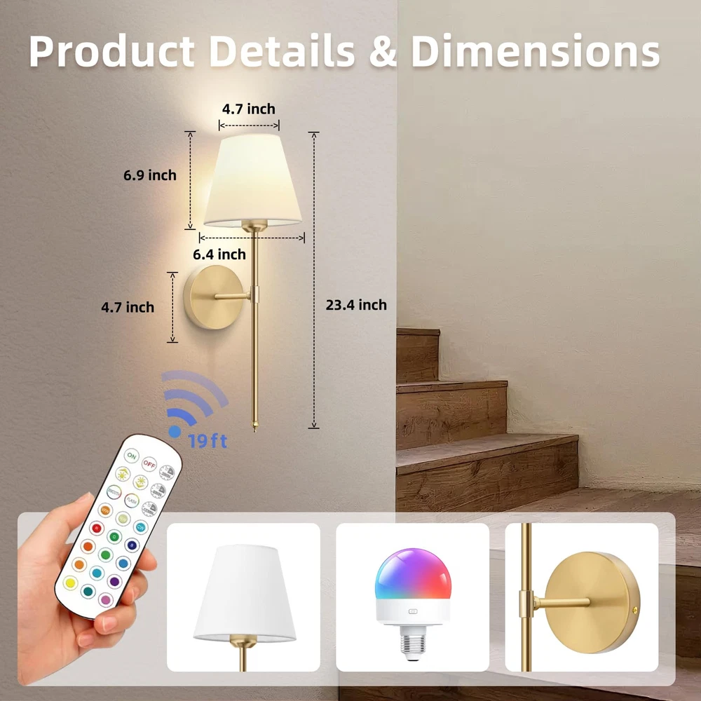 【Battery Operated Wall Sconce Set of 2】Unlike other wireless wall sconces with short battery life that often fail to work properly, ours have long battery life detachable bulb, which can be fully charged within 3 hours with our own Type-C charging cable.They can work continuously for more than 18 hours at medium brightness. Note: Do not use a fast charger over 5V to charge the bulb.What's more, these bulbs are soft, no dazzle, non-flickering, eye caring and longer lifespan.Ideal for creating a romantic ambiance on Valentine's Day and Christmas. 【Wireless Remote Customization: All Colors & Brightness】Choose 3 color temperature modes (3000K-4500K-6000K), 12 RGB colors, 5 brightness levels, 3 timing settings and night light mode through the remote control ensures you have the perfect light setting for any occasion, making it more energy-efficient. 【Easy to Install】 upgraded wall sconces features wireless design allows you safely install it anywhere without worrying about whether there is a socket or connection port. It minimizes damage to the wall and you can also replace it at any time. 【E26 Replaceable 15-Color RGB Bulbs Included】The wall lights come with 15-color RGB bulbs, allowing you to change the color to suit your mood or occasion. These bulbs have a lifespan of up to 40,000 hours, ensuring long-lasting and versatile lighting options. 【Perfect for Any Home Decor】These wall lamps are perfect for your living room, office, vanity, or even dark areas like hallways, closets, and corridors. We prioritize customer needs, providing high-quality products and excellent customer service. If you encounter any quality issues within 24 months, please contact us.