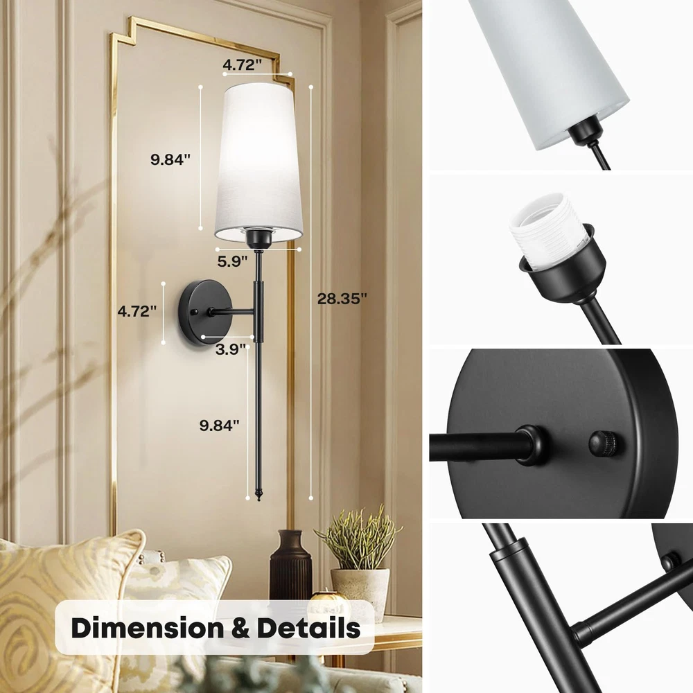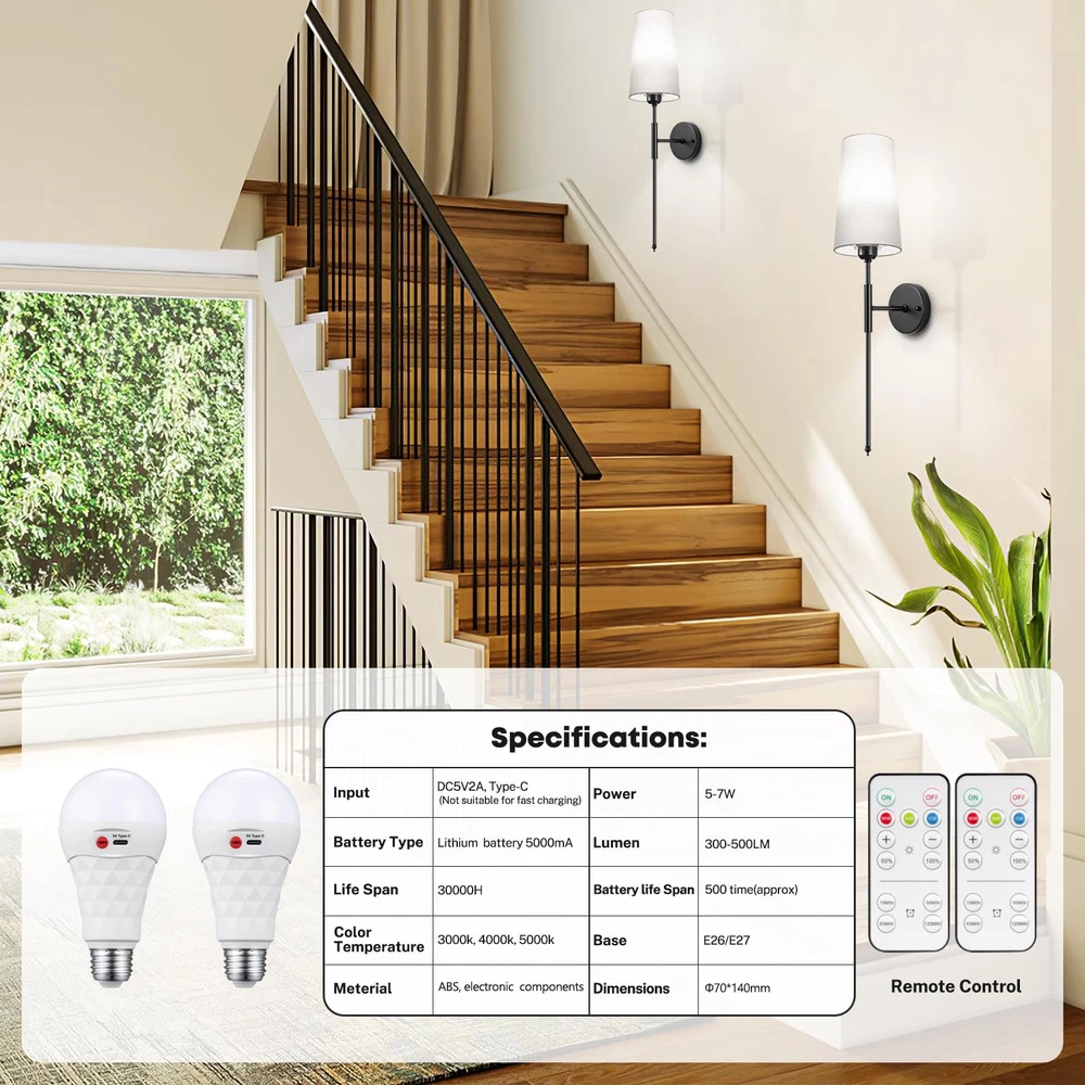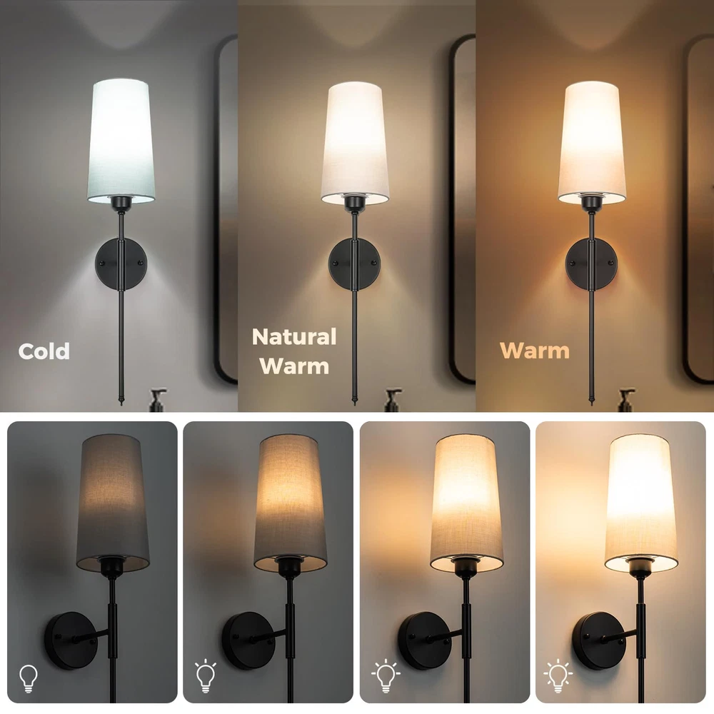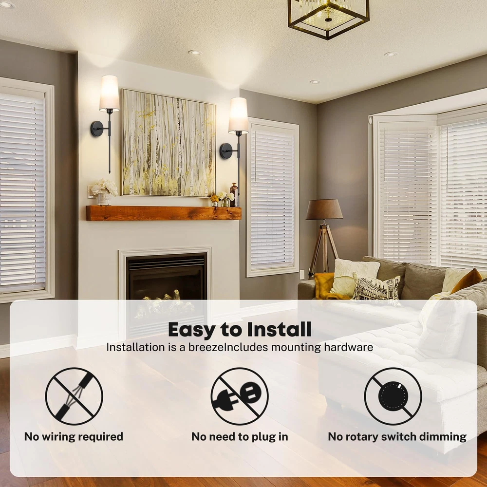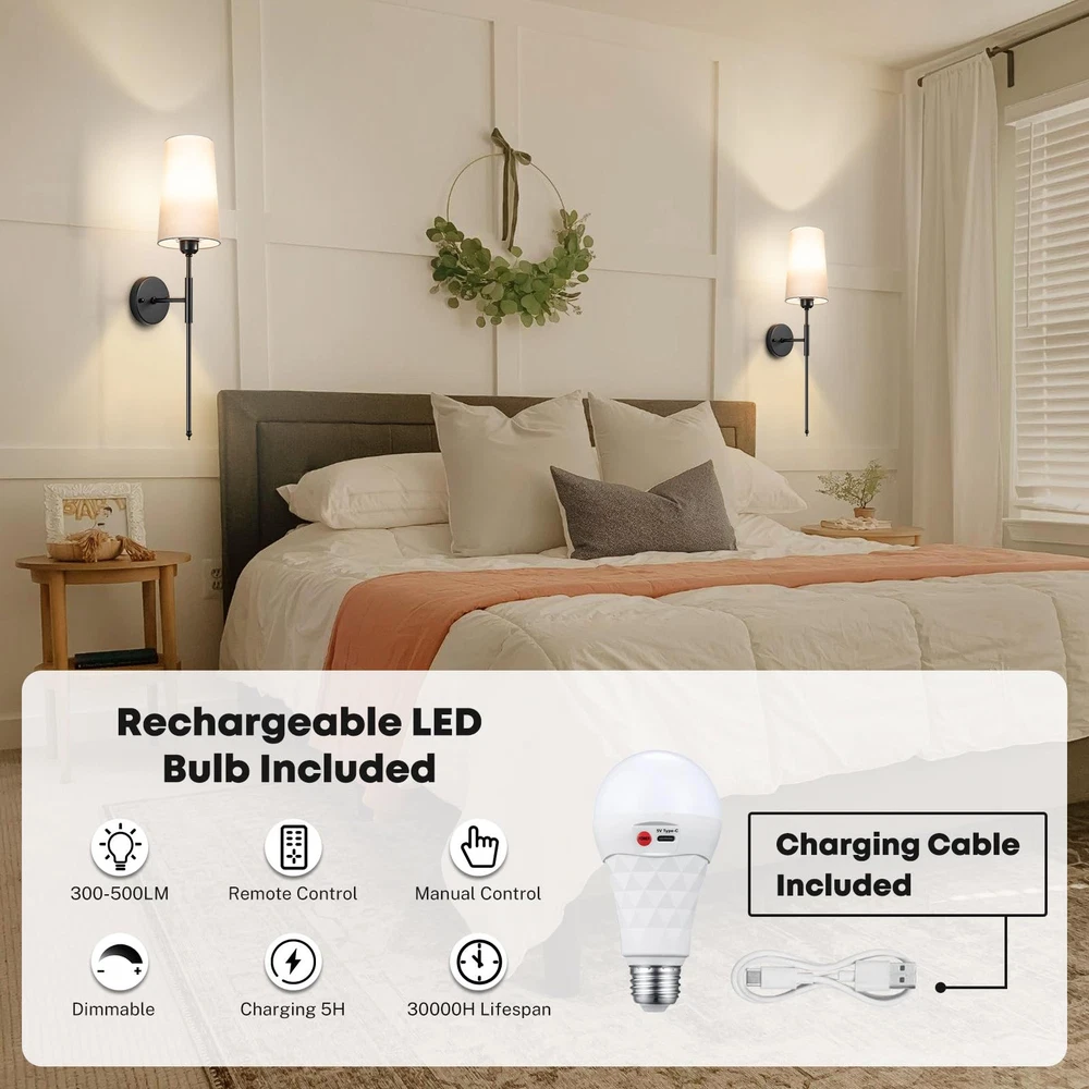Battery Operated Wall Sconce Light with Remote Control Dimmable Set of 2 White Fabric Shade Indoor Wireless Lamp For Bedroom Living Room, Bulb Included Battery Operated Wall Sconce Set of 2Wall Light Wireless Easy to Install Remote Control, Dimmable and Adjustable Sconces Wall Decor Rechargeable Wall Lamp Gold Premium Design: This pair of wireless sconces feature a stylish round metal plate and a soft, flared white fabric shade. This set of 2 battery-operated sconces is perfect for adding a touch of luxury to your bathroom, brightening up bedrooms, or illuminating hallways and living spaces.(Please charing 100% at the first time use, as the light power maybe run out of during transportation ) Easy to Intall: The wireless wall light fixture set up in no time with our easy 5-minute assembly process. No need for extra tools, complex wiring or the need to call an electrician. We provide a comprehensive manual and all the mounting accessories you'll need. Plus, these sconces are an essential backup during power outages. Flexible Control Methods: Manage your lights effortlessly without having to leave your comfortable sofa or cozy bed. Using the provided remote, you can control the wall lamp, switch the light temperature, and adjust the brightness within a range of 16ft/5m. Alternatively, manual control is always at your disposal. Tailored light brightness: The sconce included LED light bulb, 3 colors temperature 3000k/4000/5000K. You can also choose from 4 levels of brightness, Suitable for different scenes and moods, ensuring long usage times.USB Type-C charger is included for easy recharge. Multi-Scenario Application: The sleek and modern design of our battery-operated wall light fixture can adapt to a wide variety of interior styles, from modern and traditional to minimalist. These sconces allow you to adjust the lights to create different atmospheres, making them a great choice for bathrooms, dressing tables, mirror cabinets, bedrooms, corridors, entryways, living rooms, dining rooms, kitchens and more.