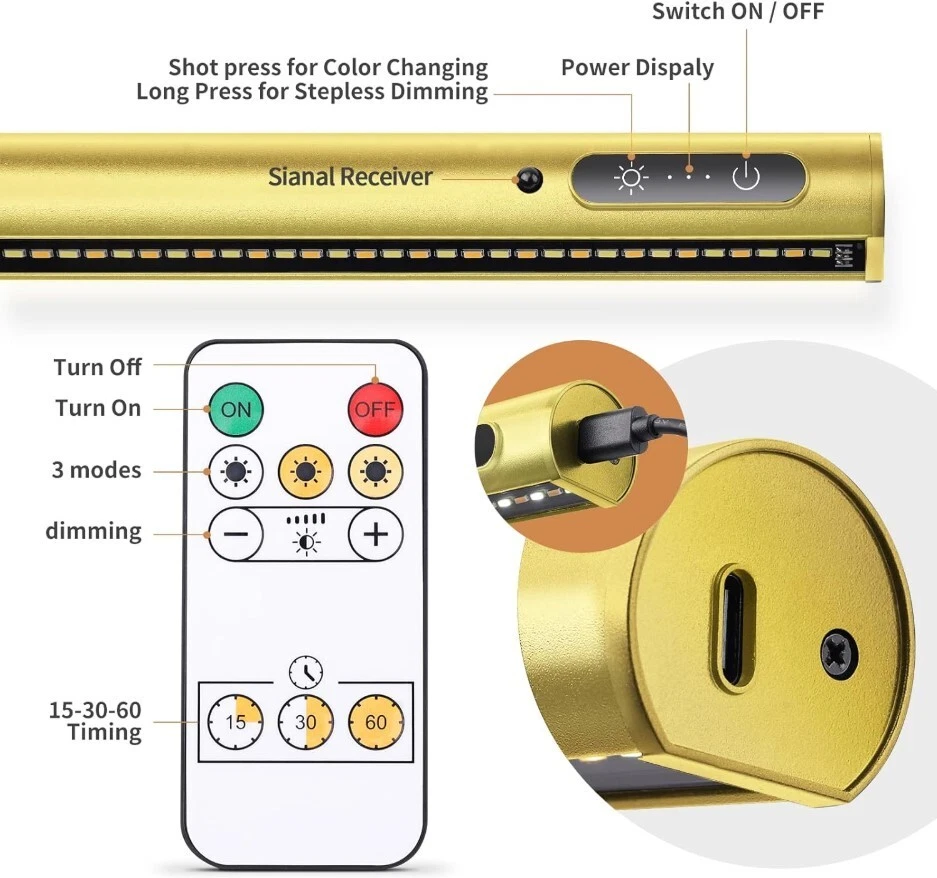 Free eBay listing template designed by dewiso.com Welcome to My Stores, Happy Shopping! ------------------ Battery Operated Wireless Picture Light,Rechargeable/Plugged in 31.5Inch Paintin About this item 【Modern Led Display Picture Lights】The wireless picture light come with (3000k warm light/4000k warm white light/6500k cool white light),enough for the brightness needed. Also the diamond art pictures light no need battery replacements, No wires. time switch. The integrated design makes it look more cool. 【Large Battery Operated Gallery Lights】Built-in 8000mAh rechargeable lithium battery, charging 5-6 hours and normal brightness can last for 16 hours. Magneted attached make easy to charging. wireless remote control, portable lighting your art. 【Easy Install&Easy Control Wall Picture Light】The picture light come with magnetic attach function, easy remove anytime. screwed in to make more secure, also it come with two simple control remote. 【Multifunctional Wall Light】We provide a 2.5 meter long charging cable that can be used as a plug-in light when powered on with a 5v2a adapter. Please note that we do not provide an adapter. Not just a picture light on wall but also can be mirror headlight、painting light、art light、dartboard light、portrait light etc. 【The Wall Sconce Included】1*picture light with 2pcs holder、2*control remote、1*TYPE-C charging cable (one meter)、1*TYPE-C charging cable(2.5 meter)、1*Manual、9pcs screws Product Description Finish Type Painted Bulb Base Wedge Product Dimensions 1.18"D x 31.5"W x 1.18"H Item Weight 15.52 ounces Shade Color White Switch Type Touch Style Modern Color Gold Special Feature Adjustable Color Temperature Light Source Type LED Material Aluminum Room Type Bedroom Power Source Battery Powered Shape Round Controller Type Remote Control Number of Light Sources 140 Connectivity Technology Bluetooth Included Components Remote Control Mounting Type Wall Mount Wattage 5 watts Number of Items 1 Lighting Method Adjustable Control Method Remote Indoor/Outdoor Usage Indoor Specific Uses For Product Home Water Resistance Level Not Water Resistant Installation Type Flush Mount Voltage 5 Volts (DC) Brightness 280 Lumen Part Number PC-80c Item Weight 15.5 ounces Batteries 1 Lithium Ion batteries required. (included) Finish types Painted Special Features Adjustable Color Temperature Shipping Tracking number: Available We use a selection of shipping services such as UPS, FedEx, USPS etc. We only ship to the lower 48 states, no APO/FPO addresses or PO Boxes allowed. Local pickups and combined shipping options are not provided at this time. Contact us We can be contacted at any time through eBay messages if you have any questions, comments or product requests. We will respond to you within 24 hours and do our best to help you out! We encourage our customers to contact us with any questions or concerns! We'd like to be sure you are completely satisfied with your purchase