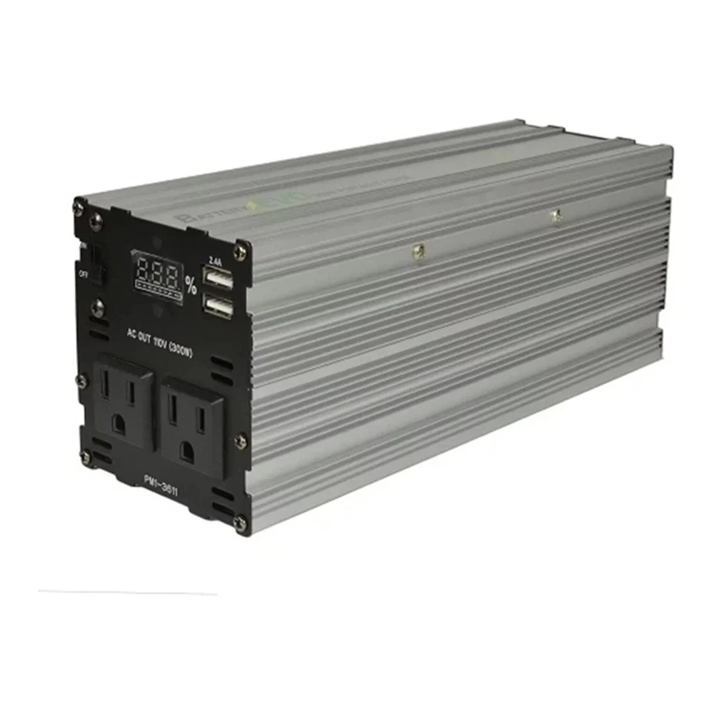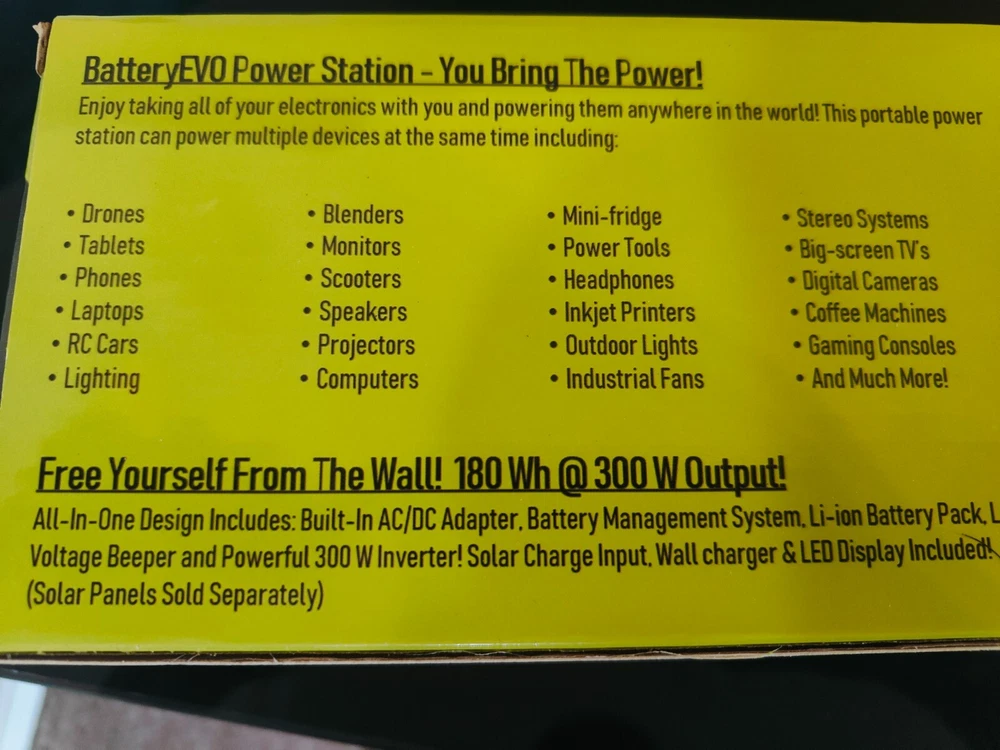 300W Lithium Portable Standard Dual-USB Port 110V AC Battery EVO Power Stations Energy storage doesn’t have to be fixed it can be portable 300W Portable Power Station is lightweight and portable with high energy density & quick recharge times in a robust aluminum casing, all at record-breaking value for your money. This highly portable power source features two standard 110V AC outlets, dual USB ports & a range of charging options & AC/DC/Solar Panels. Use it for uninterrupted power, when on the move, during emergencies, disasters, or during black/brownouts These portable power stations will power your phones, tablets, computers & routers keeping you online during an outage It will also provide your home or campsite with basic lighting, fans and connectivity Power your devices and small appliances anywhere at any time! Voltage: 36V Capacity: 160 Wh Configuration: 10S2P Output Voltage: 2x 110V AC, 60Hz, Modified Sine Wave, USB 2.0 Output: 2x 5V DC 2A Storage Temperature Range: -10°C to 55°C Operating Temperature Range: 0°C to 45°C Charging Temperature Range: 0°C to 45°C Output Power: 300W continuous output, 450W short term Self-Discharge: 90 hours with no load, power off Cooling Internal fan; autostart Display: Approximate indication of the state of charge Operating Modes: Discharge, Charge, UPS, charge/discharge, – 72W max Protective Shutdown: Temperature, Overload, Short circuit Internal Fuse: Not user-replaceable Audible Warnings: Battery discharged, Overload shutdown Battery Management System: Integrated Approximate Cycle Life by Depth of Discharge: 400 cycles @ 90% DOD, 800 cycles @ 60% DOD Certification: CE and UN/DOT compliant components AC Charging Input: 100-240V AC universal input – 80W DC Charging Input 42V – 1.9A max DC Solar Charging Input 42-60V – 2A max DC Solar Charging Input Connector: 5.5mm x 1.7mm male adapter, e.g. DC5517, Physical Specifications Exterior Case: Extruded aluminum Length: 10.47in