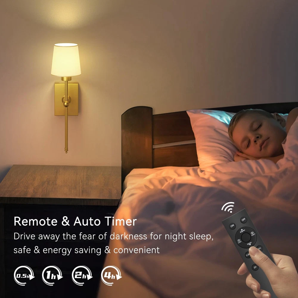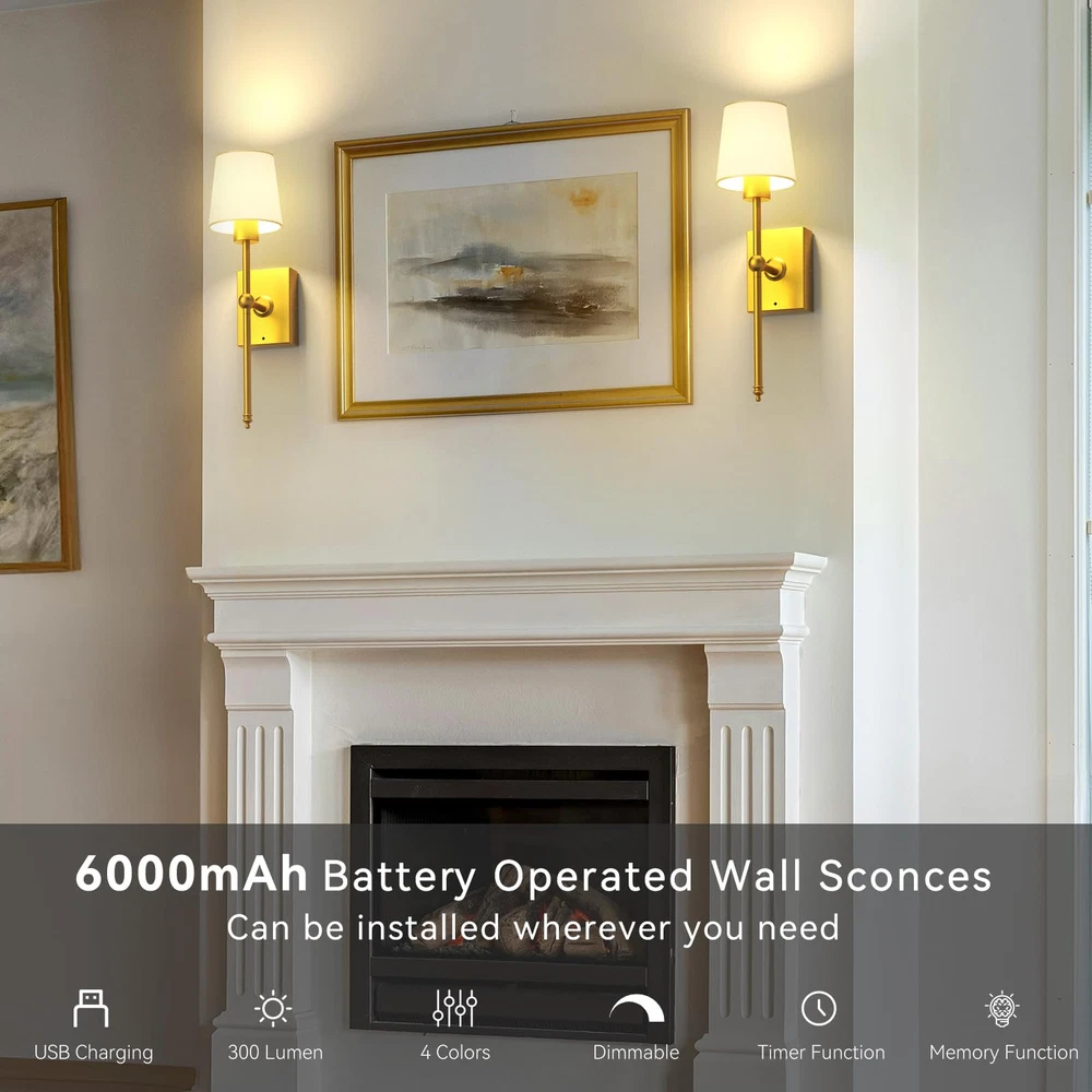 【Long Battery Life Wall Sconces】Our battery operated wall sconces set of 2 feature a 6000mAh rechargeable battery(larger capacity than most wall lamps on the market), after fully charged, The battery wall light can last for up to 25 hours at maximum brightness and 72 hours at the lowest setting. It will seamlessly fit into any indoor area, adding function and style while creating a pleasant ambiance with its wireless installation. Plus, you won't have to worry about power outages 【Wireless Sconces & Easy Installation】 NO Wiring Required! Our rechargeable wall sconces set of 2 are renter-friendly and incredibly easy to install: 1. Install the lampshade, bulb, and battery compartment( which is easier to take out and charge), 2. Use the included screws to mount the sconce light on the wall(Sorry, please do not use double-sided tape). Comprehensive instructions and video guides are provided. For any assistance, feel free to reach out to us anytime 【3 Color Temperatures & Brightness Adjustable】These battery wall sconces with remote control offer 4 color temperatures from 3000K-6000K. This cordless wall scone also enables you to adjust the brightness from 20% to 100%, allowing you to set the ideal ambiance for any event. With the ability to control multiple sconces simultaneously, eliminating confusion 【Timer & Memory Function】You can set a timer for the battery-powered wall sconces to automatically turn off after 0.5/1/2/4 hours through the remote control, which helps to preserve battery life and reduce unnecessary power consumption. Our battery sconces remember your last setting. When switched back on, it seamlessly resumes the mode you left it in, eliminating the need for repetitive adjustments and saving you precious time 【Versatile Indoor Wall Lights】The battery wall sconces set of 2 often combine practicality with aesthetics, this gold battery operated wall lamp exudes elegance and excellence, making it suitable for a variety of areas such as bedrooms, living rooms, hallways, kitchens, bathrooms, staircases, fireplaces, TV walls, pictures. our sconces wall decor is a perfect option to elevate the indoor lighting and decoration of your home 【Worry-free service】offers 2-year maintenance for these rechargeable wall sconces set of two. If you have any questions, please feel free to tell us (Log into your Amazon Account and find the order, then contact the seller and write a message, and problems will be addressed within 12 hours). Please rest assured to buy!
