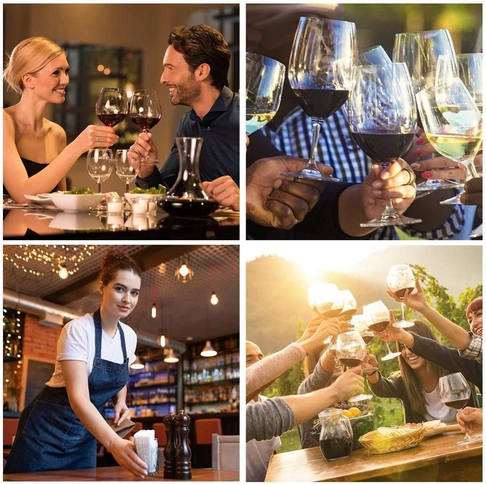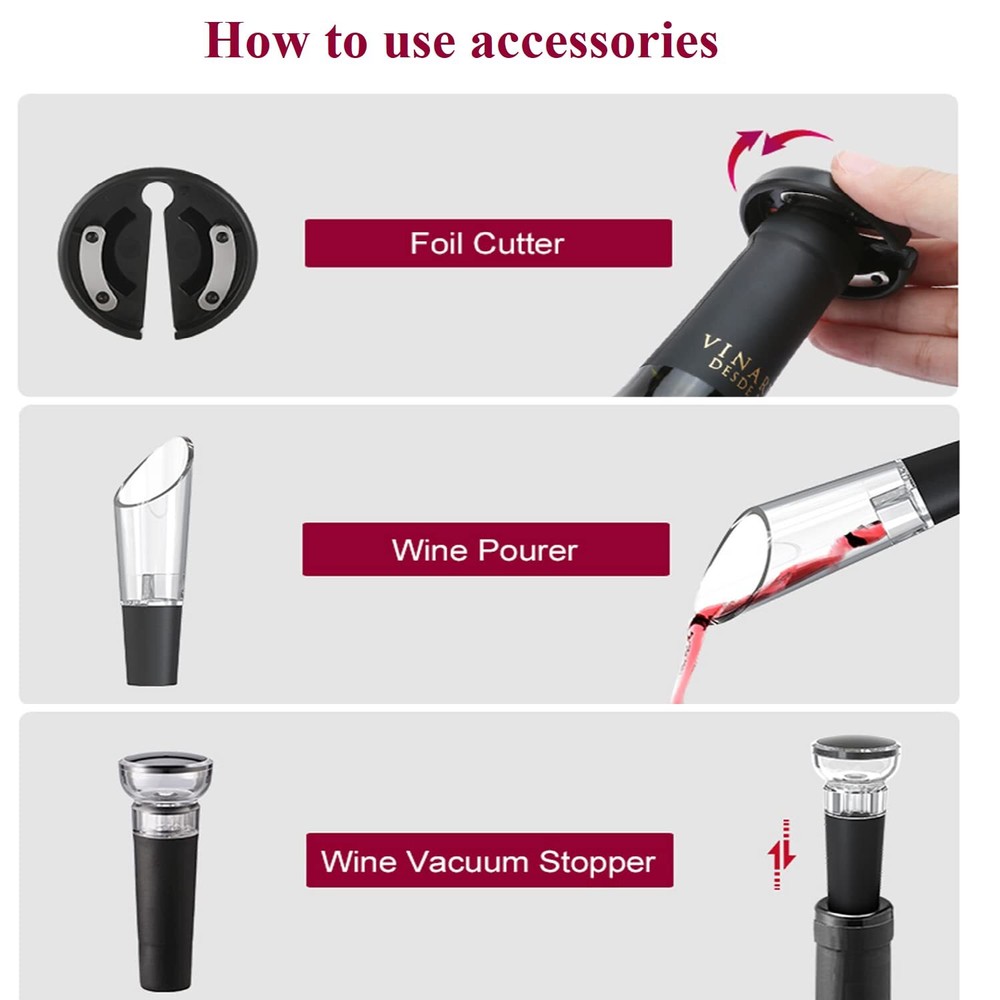 Electric wine 0pener set, step by step to ease your life The wine bottle opener automatic including foil cutter, wine aerator pourer and vacuum wine stopper. You can easily open, pour out, enjoy and save your favorite red, white or rose wines. We are a one-stop solution for wine opening, pouring and preserving. With foil cutter The foil cutter can easily cut the protective foil on the surface of the wine stopper. With it, you don't have to cut it open with your fingernails or a knife. Make opening wine an elegant affair. With wine pourer The bottle pourer spout to ensure that the wine is poured and drip-proof. The wine aerator pourer is made of food grade material and predictable flow-control every time, which can prevent staining. With vacuum wine stopper The food grade vacuum wine stopper extends wine’s freshness by removing air from open bottle, Improve vacuum, slow down the oxidation process. You can keep the unfinished wine better with the vacuum wine stopper. Wonderful 4-in-1 Gift Set Electric Wine Opener Electric wine opener set with the elegant design of the package is suitable for any occasion. Battery wine opener for home kitchen parties and bars can be a gift for any holiday, anniversaries and special days. Electric wine opener's dimensions: 1.89 x 8.97 inches (4.8 x 22.8 cm) 【All-in One Electric Wine Opener】What a professional one-stop solution for wine opening, pouring, and preserving, meet all your wine drinking needs, which including foil cutter, vacuum wine stoppers, wine aerator & pourer. 【Powerful and Durable】4 AA batteries are required but (not included) in the package, don’t need to worry the charging issue. Small size wine bottle opener measures 9 inches high and 1.8 inches wide. Small enough to store and place it when you not use it. Weight 228g light to carrying. 【Wonderful 4-in-1 Gift Set】Perfect present for wine lovers: electric wine opener set with the elegant design and smooth touching is suitable for any occasion. Battery operated wine bottle opener for home kitchen parties and bars can be a gift on Thanksgiving, Christmas, New Years, Valentine's Day, Mother's Day, Father's Day, Birthday, Anniversary, Wedding, Housewarming etc. 【Easy Operation and Fast Open】Simple push button easily remove corks in seconds. Use the foil cutter removing the seals easily, then hold the electric opener on the top of your wine bottle, just press the button, and your wine is open. Of course, the corks can also be removed from the electric wine opener by press the button in seconds. 【Vacuum Preserver Stopper】100% seal anti-leakage, keep wine tasting fresh. The food grade vacuum wine stopper extends wine’s freshness by removing air from open bottle.