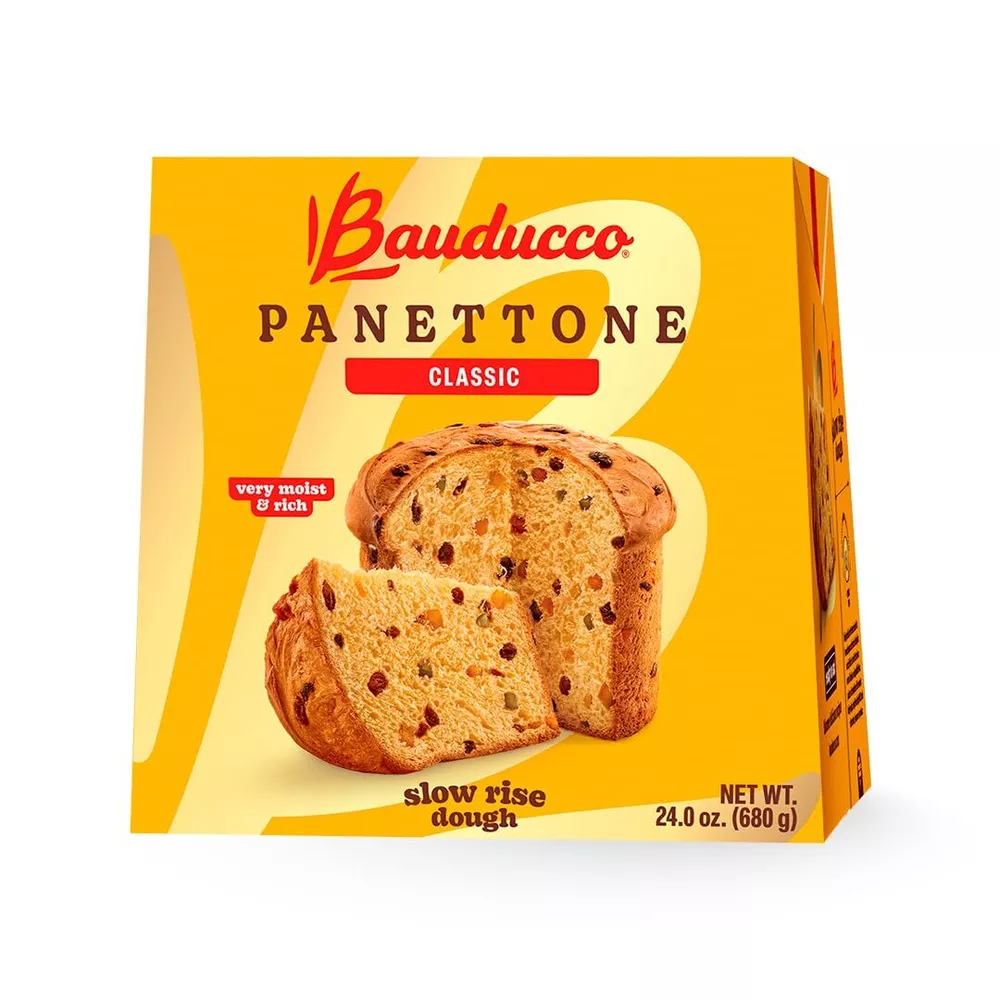 Panettone is a moist, soft & fresh cake made with candied fruits & raisins or chocolate chips - 24.0oz (Pack of 1). The secret ingredient that makes our panettone fluffy and delicious is the original mother dough, brought from Italy by Mr. Bauducco in the 1950s. In our traditional 52-hour process, a bit of this mother dough is saved each day to mix into tomorrow’s batch, giving our panettone its special flavor. OUR FAMILY TRADITION: Bauducco Classic Panettone is more than a delicious treat; it's a cherished family tradition. Passed down through generations, our Italian family recipe ensures the tradition lives on. Made with pride, we know you'll enjoy it as much as we do. FEATURES: ● Moist and Fresh Classic Panettone ● Traditional Italian Family Recipe ● Slow Rise Dough THE TRADITIONAL ITALIAN RECIPE IN YOUR HOME: When it comes to great meals, the value of tradition is undeniable. There's something special about sitting at a table full of dishes passed down through generations. It's a reminder of the past and a way to connect with our ancestors. FOR ANY OCCASION: The versatility of the Bauducco product line is endless. There are delicious options for any occasion and any moment. They can even be used as an ingredient! So, no matter your taste, there's a Bauducco product for you. A perfect delicious gift to your family and friends. Bauducco is known for the moist and fresh Panettone, but there's so much more to it. Enjoy light and crispy wafers in various flavors, and toasts baked to perfection to start your day right! Here, everything is made with love. Disclaimer: These statements have not been evaluated by the FDA. These products are not intended to diagnose, treat, cure, or prevent any disease. MOIST, FRESH, READY TO EAT: Bauducco Classic Panettone is known for its moist, fresh, and aromatic qualities, making it a delightful treat any time of year. GREAT GIFT OPTION: A delicious choice for sharing with family and friends, perfect for any occasion. ORIGINAL RECIPE: Crafted by the Bauducco Family since 1952, using the same authentic Italian recipe. SLOW RISE DOUGH: The dough undergoes a 52-hour process, ensuring the finest quality. VERSATILE INGREDIENT: Bauducco Classic Panettone can be used to make various recipes such as French Toast, Bread Pudding, Breakfast, and more. FUN IN THE KITCHEN: Get creative and have fun experimenting with different combinations, such as pairing with ice cream or simply with a hint of butter. #1 PANETTONE IN THE US: Made by the Bauducco family, now in its third generation, maintaining the tradition of excellence since 1952.