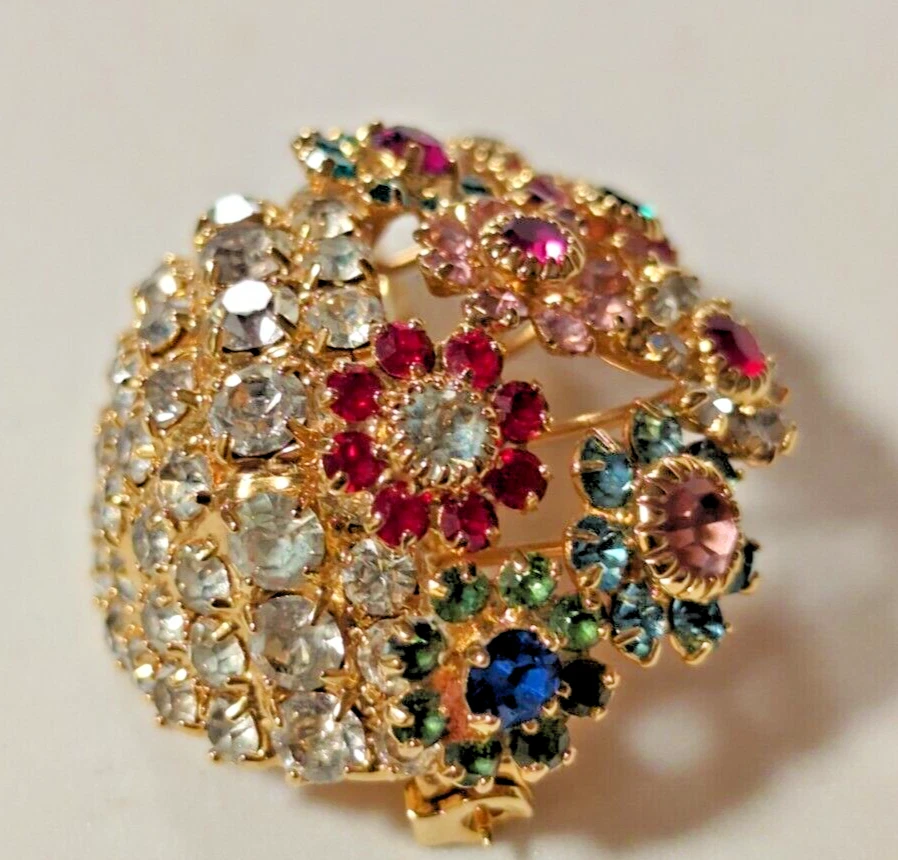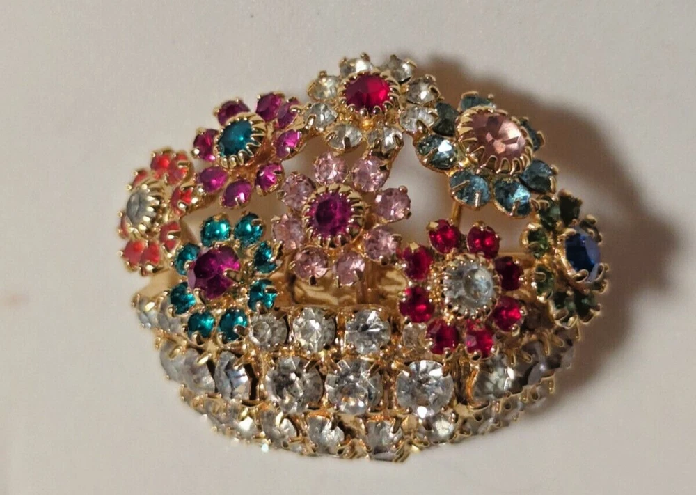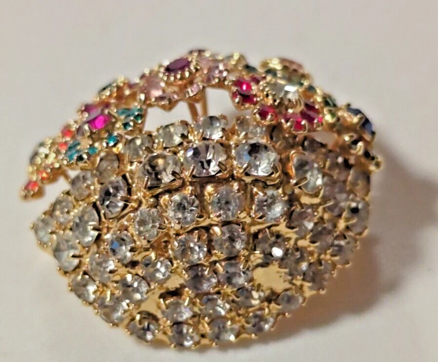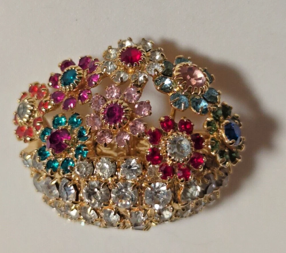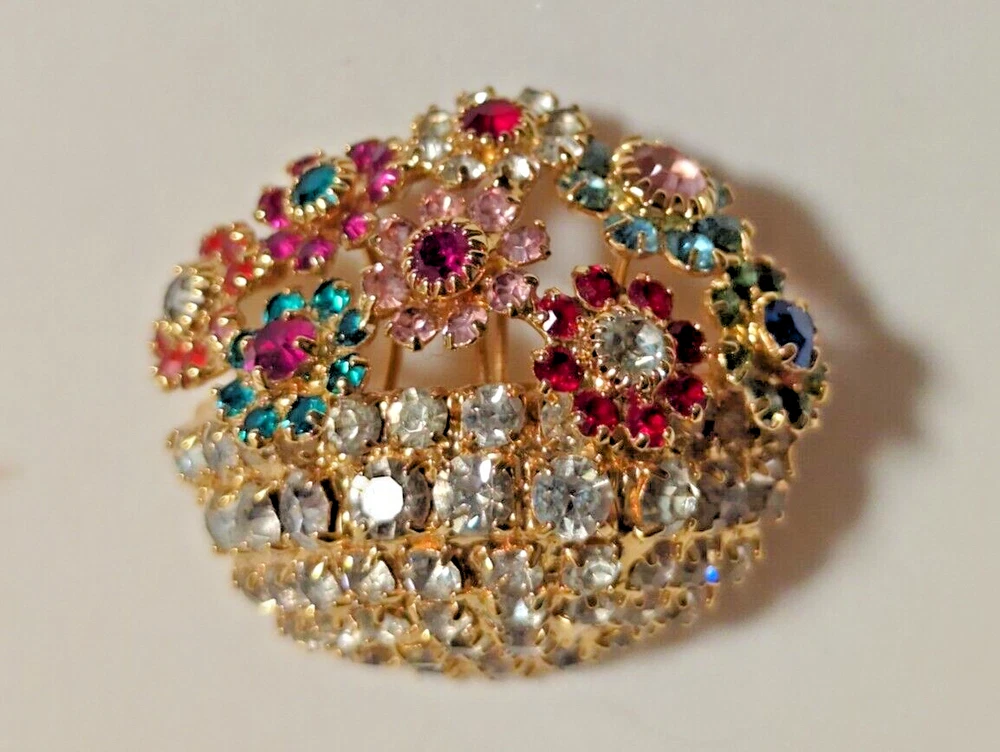 Bauer Flower Basket Pin/Brooch with Clear Rhinestones Basket Multi-Colored Flowers Prong Set Brooch by Dorothy Bauer. In good condition, Preowned and signed on the back. Display not included. **Please do not bid if your feedback is less than 10. ** I've had too many non-payments or receive notice from eBay about other issues. Before you purchase, please avoid anything that would warrant a transaction cancellation and make sure to put the correct shipping address at check out. I won't be able to change your address manually or ship to another address. LOOK AT ALL PHOTOS before bidding! Bid Responsibly. If you are unhappy when you receive the item, communicate with me before leaving negative feedback. The items are preowned or have come from an Estate even when NEW. That means someone never wore them and they have original tags. Please Note: I do not accept offers and do not end my auctions early for anyone. I do not clean any items; I leave that up to the new owner. PLEASE READ: Reminder when shipping first class, it will take longer to ship. The postal service is short staffed, and it takes longer to deliver the package. There is a tracking number. I have found that not all post offices will scan that number, so it may look like it's sitting in one place for a longer time. **If noted shipping USPS Priority mail, that is what I do ship on high priced items, due to cost of the item. **Please do not ask me to ship differently, I will not change shipping. I carefully place items in small box with padding place in a box then package in a priority box. Please email me with any questions