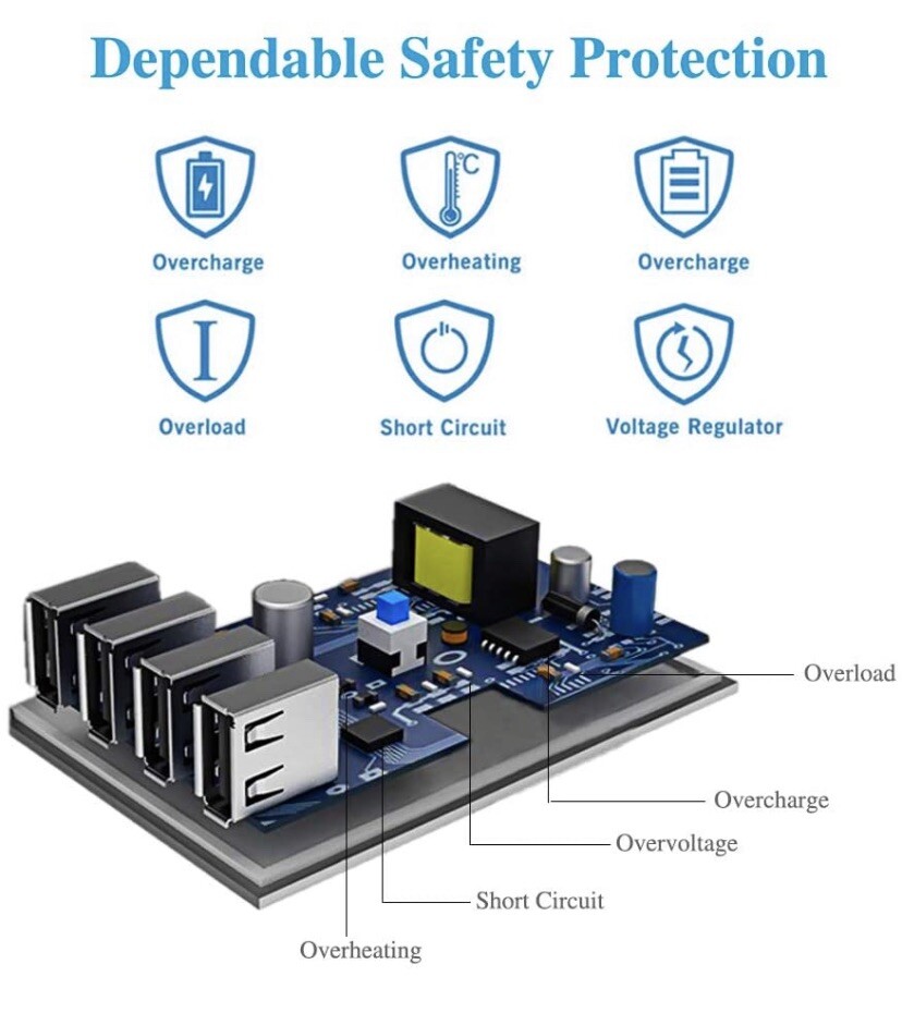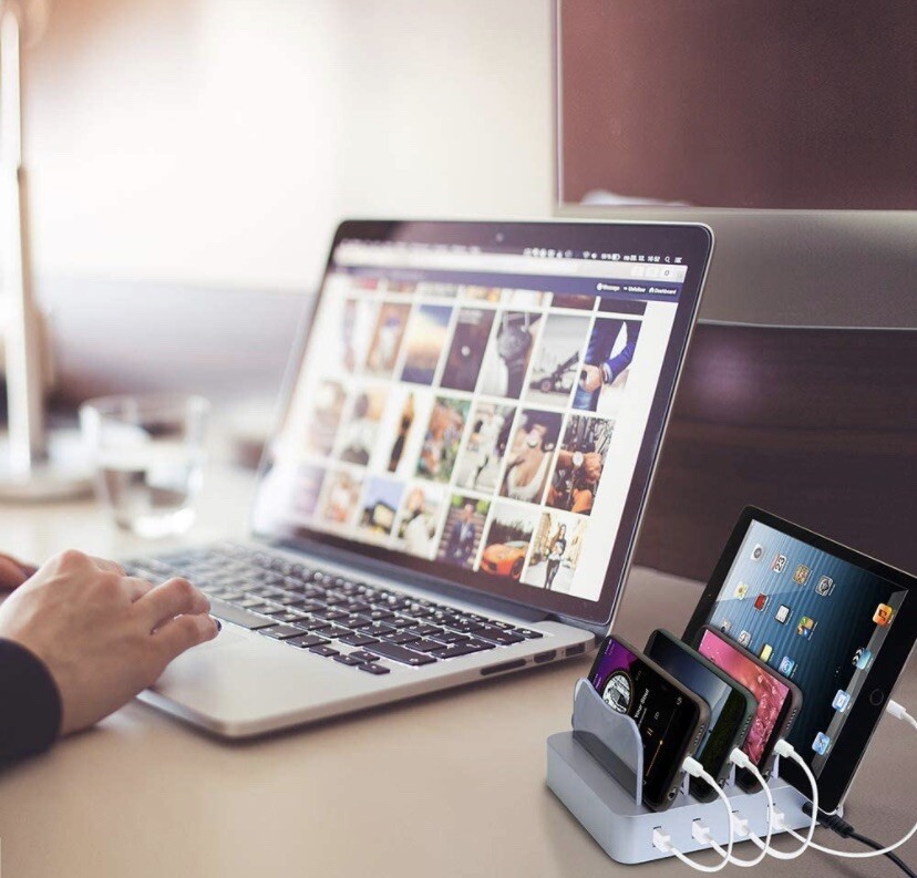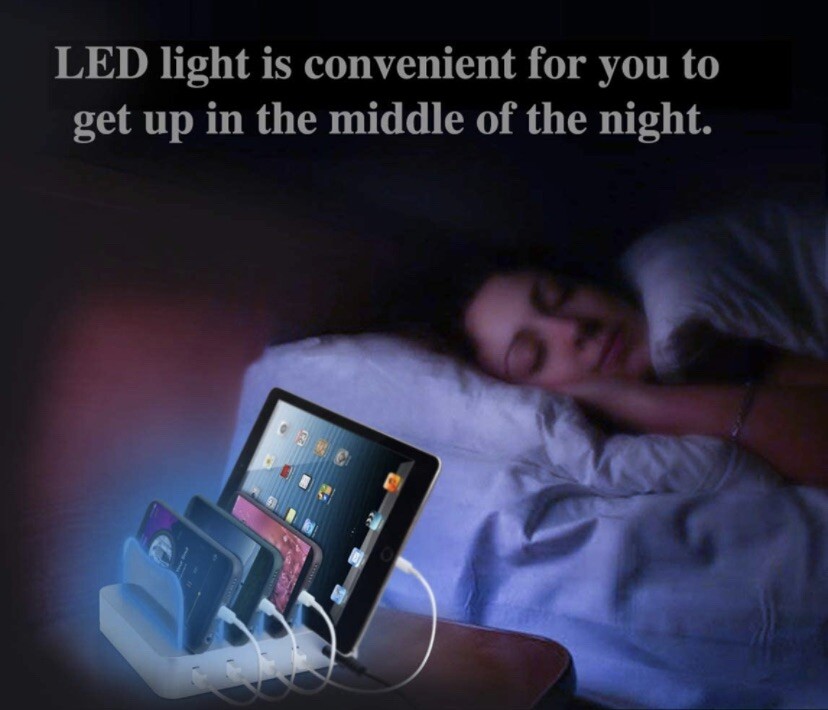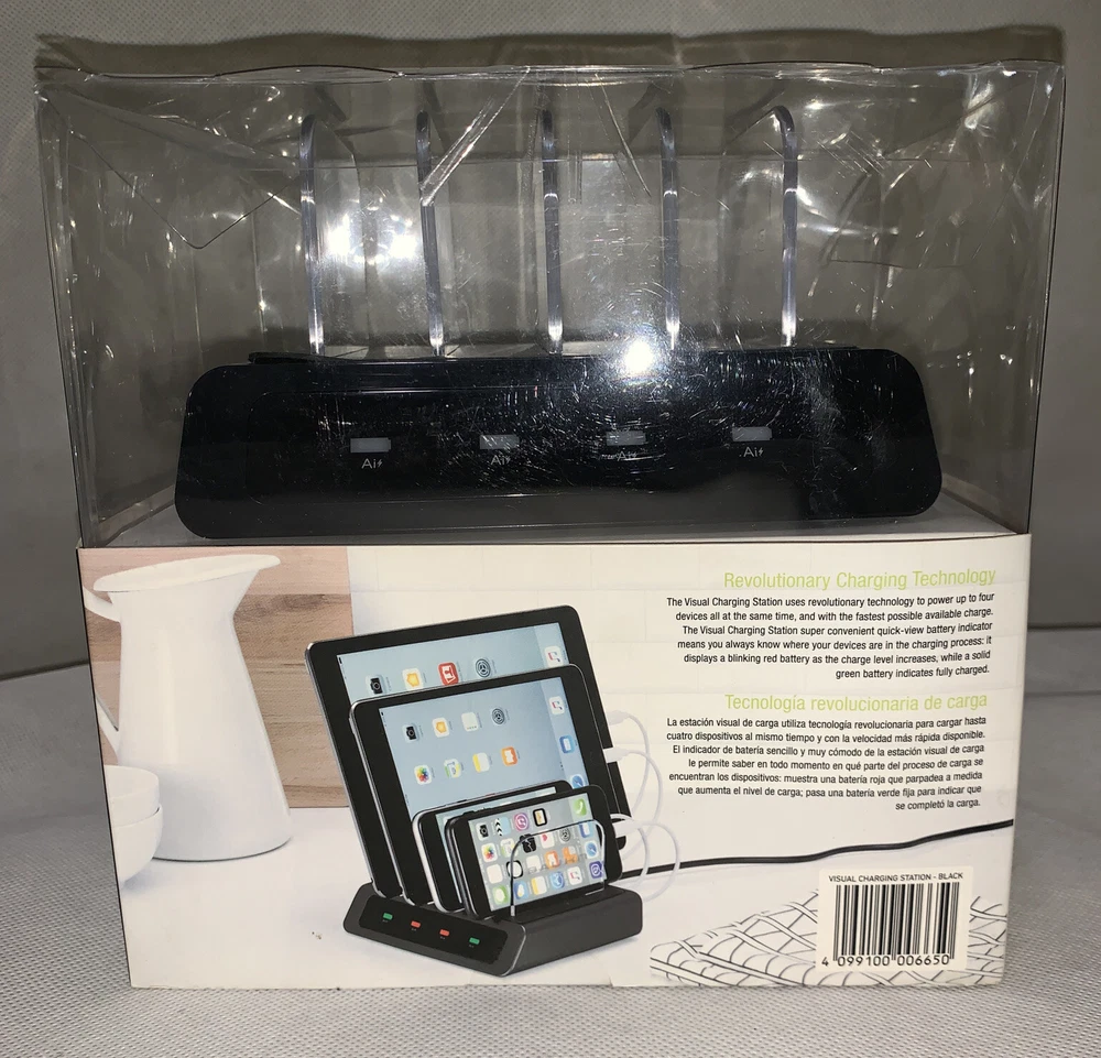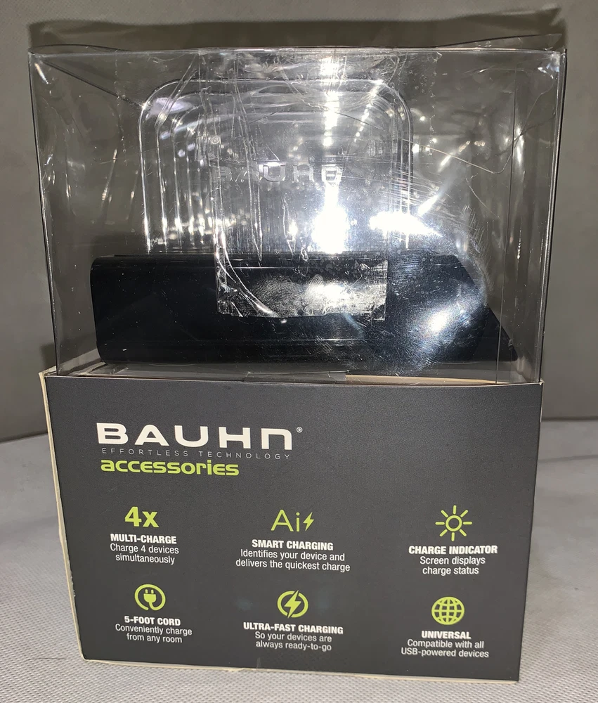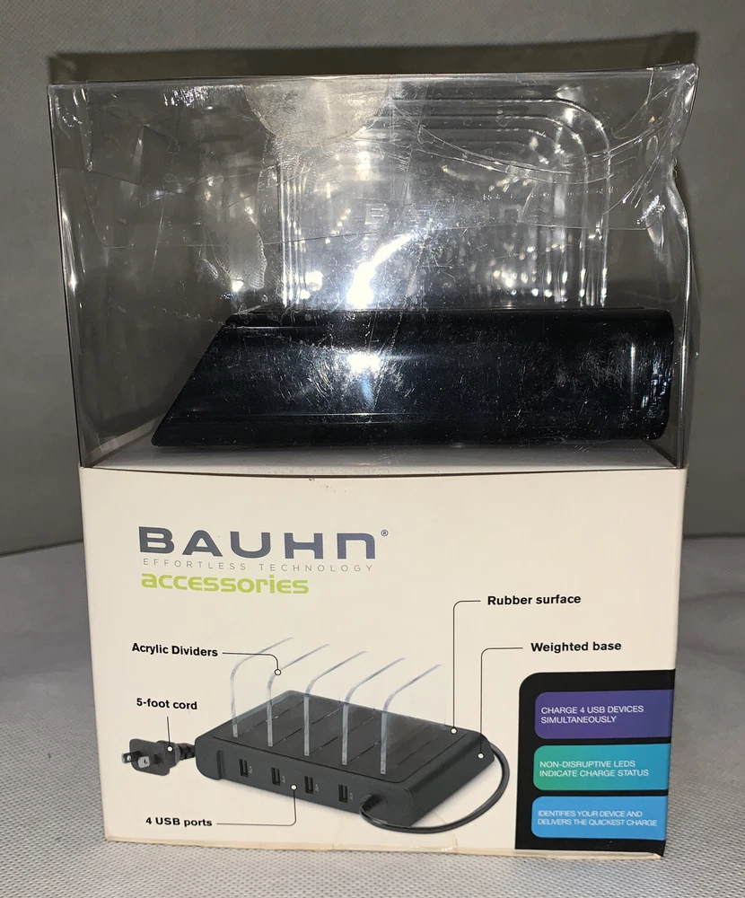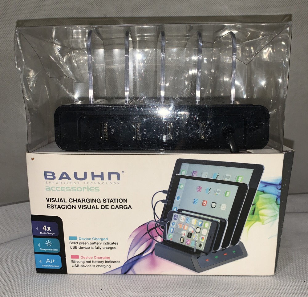 Bauhn Visual Charging Station For Four USB Devices-. New. However, box was repacked, as someone put something on top that deformed the plastic box. Everything inside the box is new.