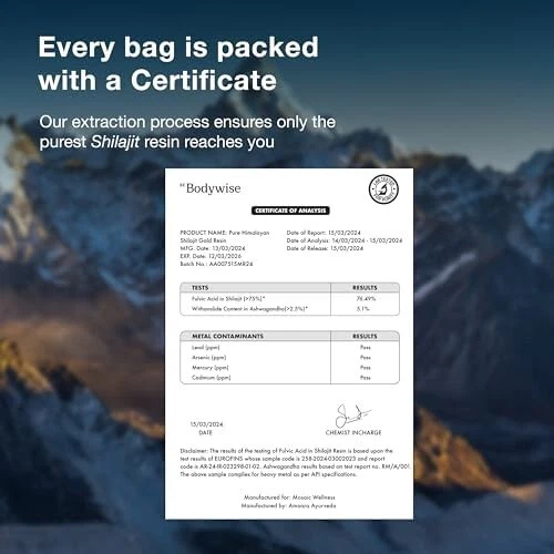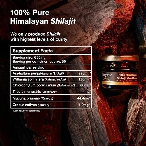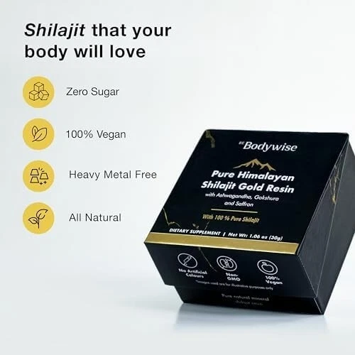 About this item SOURCED FROM HIMALAYAS: Harvested from pristine heights of Himalayan Mountain, our Pure Himalayan Shilajit Gold Resin is sourced from 18,000 ft above sea level. Especially prepared to help with transformational journey towards holistic wellness, higher energy and enhanced post workout recovery. LAB TESTED & PREMIUM QUALITY: Be Bodywise Pure Himalayan Shilajit Resin Gold is “Lab Tested” to be free from heavy metals, fillers, and harmful additives. Crafted in its most authentic form, our superior shilajit gold resin is tailored for people seeking natural wellness solutions. Scoop a pea-sized amount, stir into water, milk, or any beverage of your choice until dissolved. Use daily for 2-3 months for best results. NATURE’S POWERHOUSE: Infused with potent ingredients including Ashwagandha, Saffron, Safed Musli & Gokshura; our Pure Himalayan Shilajit Gold Resin packs a powerful punch of essential nutrients that are 100% natural and organic. Our Shilajit Gold Resin has “No Added Sugar”, comes free of heavy metal and chemical contaminants. Each pack comes with an “Individual Lab Certificate” that guarantees purity. STRENGHTEN & REVITALISE: Our Power packed, all-in-one supplement combines potent action herbs like Himalayan Shilajit Resin, Ashwagandha, Saffron, Gokshura and Safed Musli. Every serving delivers a powerful dose of Shilajit and Ashwagandha, ingredients that help with transformational journey towards holistic wellness, higher energy and enhanced post workout recovery.