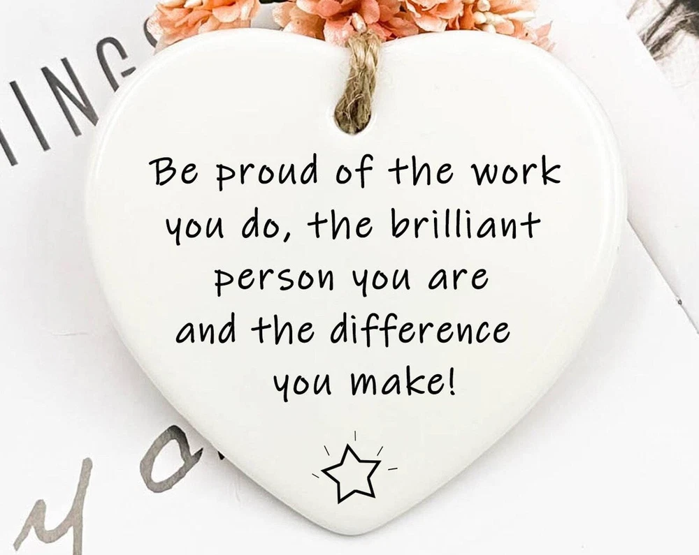 Be Proud Of The Work You Do Thank You Gift Leaving Gift New Job Gift Coworker Gift Employee Gift Social Worker Gift Christmas Gifts Material: Ceramic Color: White Shapes: Circle, star, heart and oval Can be printed on both sides Imprint full-color artwork, photos, or logos Hole for hanging string and hanging string included Printed in the USA