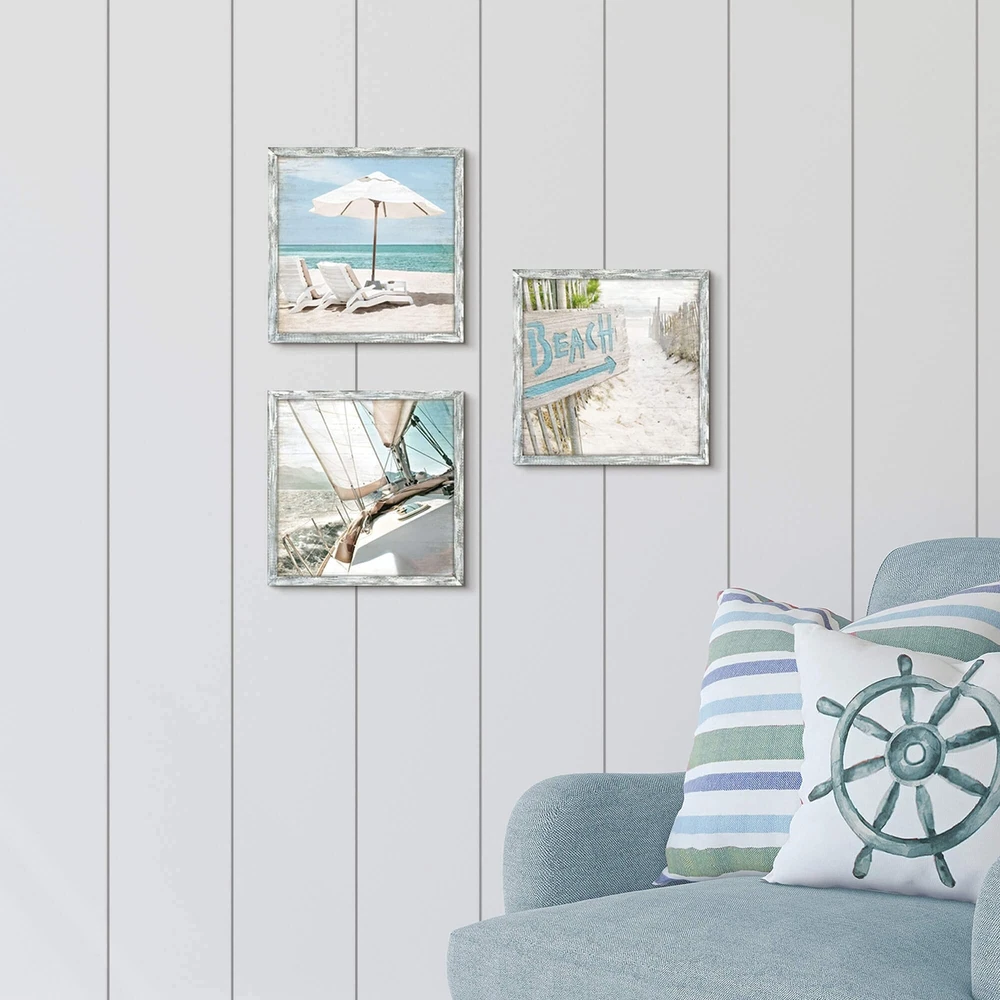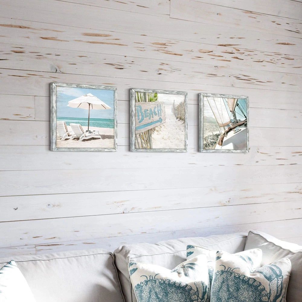 Beach Framed Wooden Wall Art: Ocean Pictures Coastal Art Prints Seaside Artwork Collection Set of 3 Seascape Decorations for Bedroom Product Details Color: White Beach Chair Boat Size: 12" x 12" Brand: Lazy Ocean MPN: Does not apply UPC: Does not apply EAN: Does not apply Item Weight: 2.31 Pounds Unit Count: 3 count Item Dimensions L x W: 12"L x 12"W Size: 12" x 12" Room Type: Bathroom,Bedroom,Dining Room,Kitchen,Living Room,Office Color Family: multi-color Pattern: Splash Wall Art Form: Painting Color: White Beach Chair Boat Style Name: Rustic Orientation: Landscape Item Shape: Square Theme: Seascape Paint Type: Acrylic Paper Finish: Matte Frame Material: Wood Finish Types: Unfinished Material Type: Engineered Wood, Wood Recommended Uses For Product: Home decoration, Interior design Manufacturer: Lazy Ocean Number of Items: 3 Brand: Lazy Ocean Mounting Type: Wall Mount Additional Features: Coastal Theme, Set of 3 Panels Frame Type: Framed Size: The size of this seaside pictures wall art is 12W x 12H x 3 panels, available in a selection of sizes to suit your space, arrange the order of placement freely according to your own preferences Feature: You don't have to live by the sea to enjoy all the fun the beach has to offer, this beach decoration set has three panels, which show the beach chairs under the sunshade, the signs of the "Beach" and the boats sailing on the sea. (Copyright licensed image with high resolution definition) Material: The beach picture wall art made of solid wood and treated with a rustic, using the high quality ink, enable the artwork to be vibrant and rich in color and detail. The strong solid wood frames help the artwork be away from distortion Usage: The hooks are ready and including suspension fittings rustic. The beach wall art will be a beautiful coastal style addition to your home, its a perfect wall decorations paintings for living room, bedroom, kitchen, office, hotel, dining room, bathroom, bar etc Packaging: Professional packaging design, the outer packing box with thickened corrugated paper, effectively let the decorative painting be transported in a good and sound way