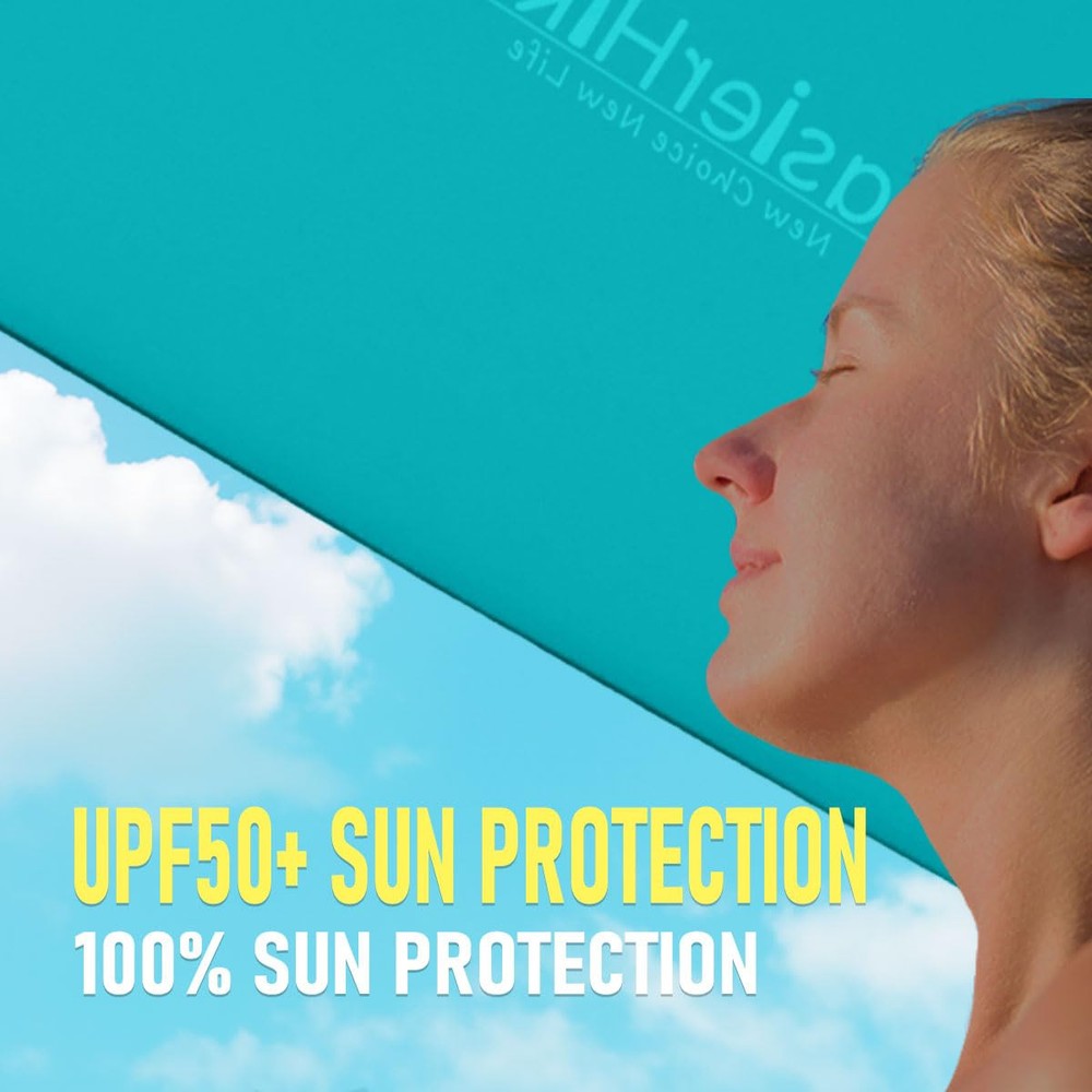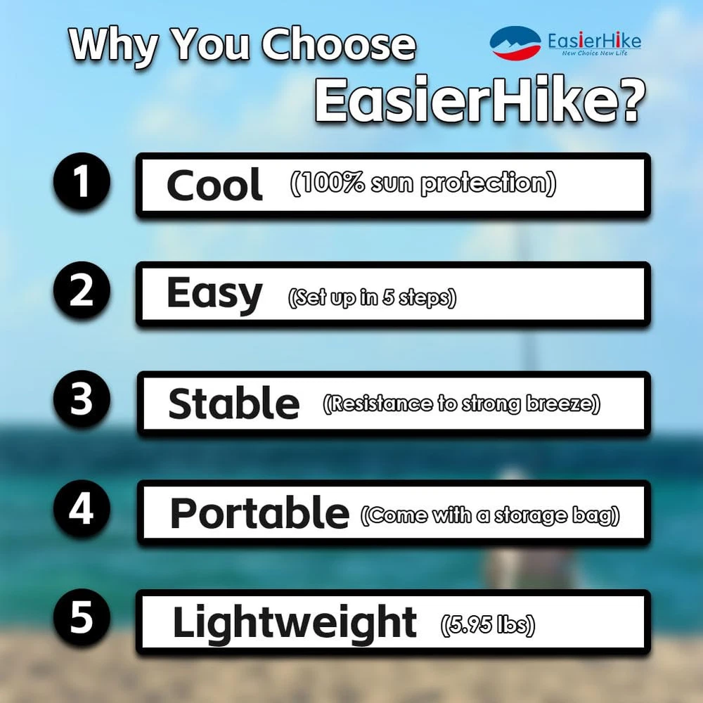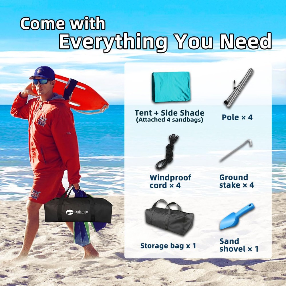 [ Patented Movable Side Shade Design ] - Superior to all beach shade tents of the same type, it provides additional side shade, and can be moved to provide the best shading experience as the angle of sunlight exposure changes throughout the day. [ Portable and Quick Assemble ] - We know it’s a pain to spend a lot of time on assembling and repackaging. So we pre assembled some accessories before shipment to allow you to quickly set up this beach shade tent or pack it up to the small storage bag for carrying. And the total weight only 10.95 lbs! [ Upgraded Sun Protection Fabric ] - True UPF50+ filters out up to 98% of UV rays. Compared to other so called UPF50+ sun shade tents, you can clearly feel a cooler shade by beach shade tent. [ Maintain Stability In Strong Breeze ] - Paired with 4 sandbags and 4 extra windproof cords, It can maintain stability under the wind speed of up to 26 mph (Beaufort: Strong Breeze). You won't have to worry about any unexpected gusts of wind spoiling your day. [ Not Just Beach Sun Shelter ] - Water resistant sun protection fabric, let you enjoy a leisure time whether it's sunny or rainy. Come with 4 ground stakes to replace 4 sand bags for installation the sun shade tent on grass.