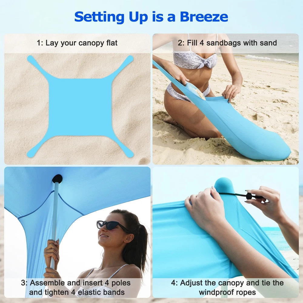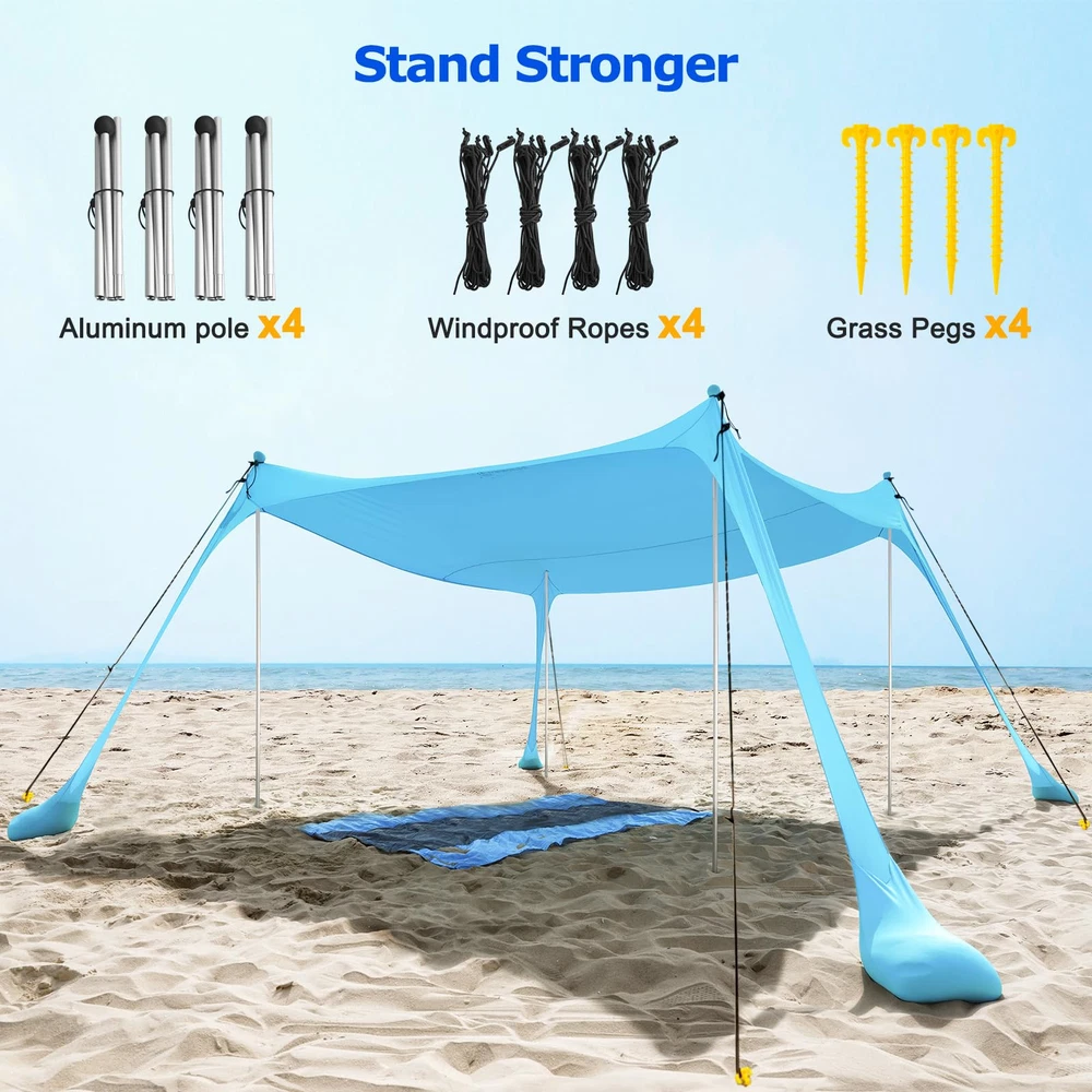 LARGE FAMILY POP UP BEACH TENT: beach sun shade tent is 10x 10 ft, with 4 aluminum poles up to 6.56ft in height, which greatly increasing its shadow area and providing spacious shelter for 6-8 person, ideal for families, friends, or small gatherings in the backyard, relaxing on the beach and traveling outdoors UPGRADED REINFORCEMENT FOR EXTRA STABILITY: This 4-poles beach shade is designed with 4 sandbags to improve stability. Rustproof poles attached with 4 elastic cords prevent shaking. In addition, 4 reinforced windproof ropes provide extra support and stability to keep the canopy stand firmly even in strong windy weather SUPERIOR MATERIAL&SUN PROTECTION: Our pop up shelter is constructed of sturdy and elastic polyester fabric coated with UPF 50+ protection that blocks 98% of harmful UV sun rays and has water-resistant functions, premium materials can effectively prevent stretching and tearing, providing all-day protection for your family on both sunny and rainy days. The thickened aluminum poles with a conical design at the bottom ensure insert deeper into the beach or grass, more stable and not easy to bend SET UP IN MINUTES: Just a few minutes, fill the sandbags, assemble and upright the poles, fix the ropes, you will get a large sunshade tent on the beaches, grassy areas, and even in rocky campsites. As the sun moves, flexibly adjust sandbags or the poles to change the angle of the shade, you and your family will be protected the whole time PORTABLE BEACH GEAR: sun tent for beach includes: 1x Beach Canopy Tent(10x10ft), 4x Ground Stakes, 4x Aluminum Poles, 4x Elastic Cords, 4x Windproof Ropes, 1x Sand Shovel, all in a waterproof portable bag, only 8lbs, which easily stored in your luggage and provides extra convenience for your outdoor travel