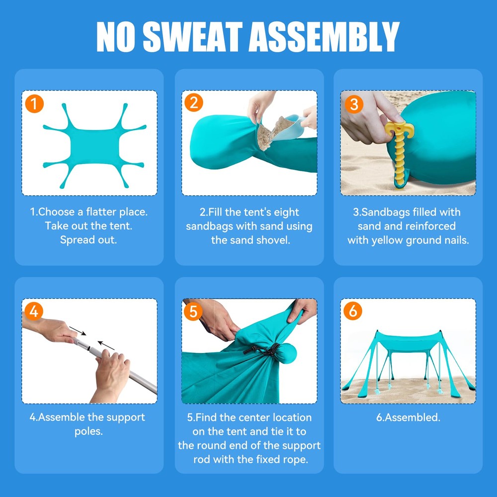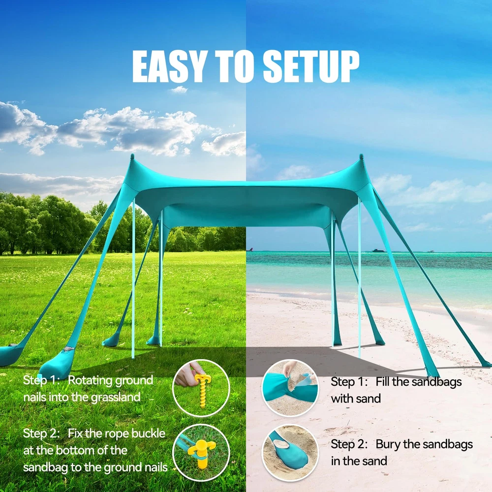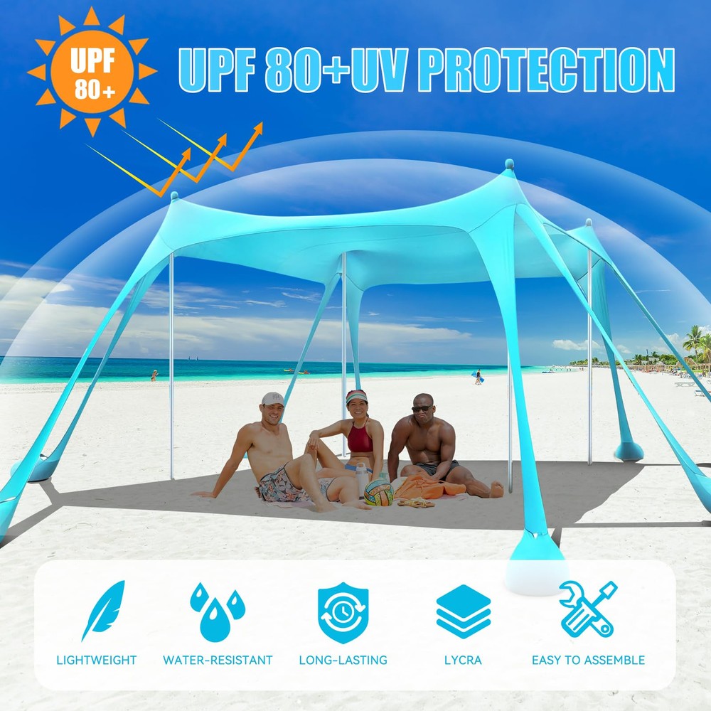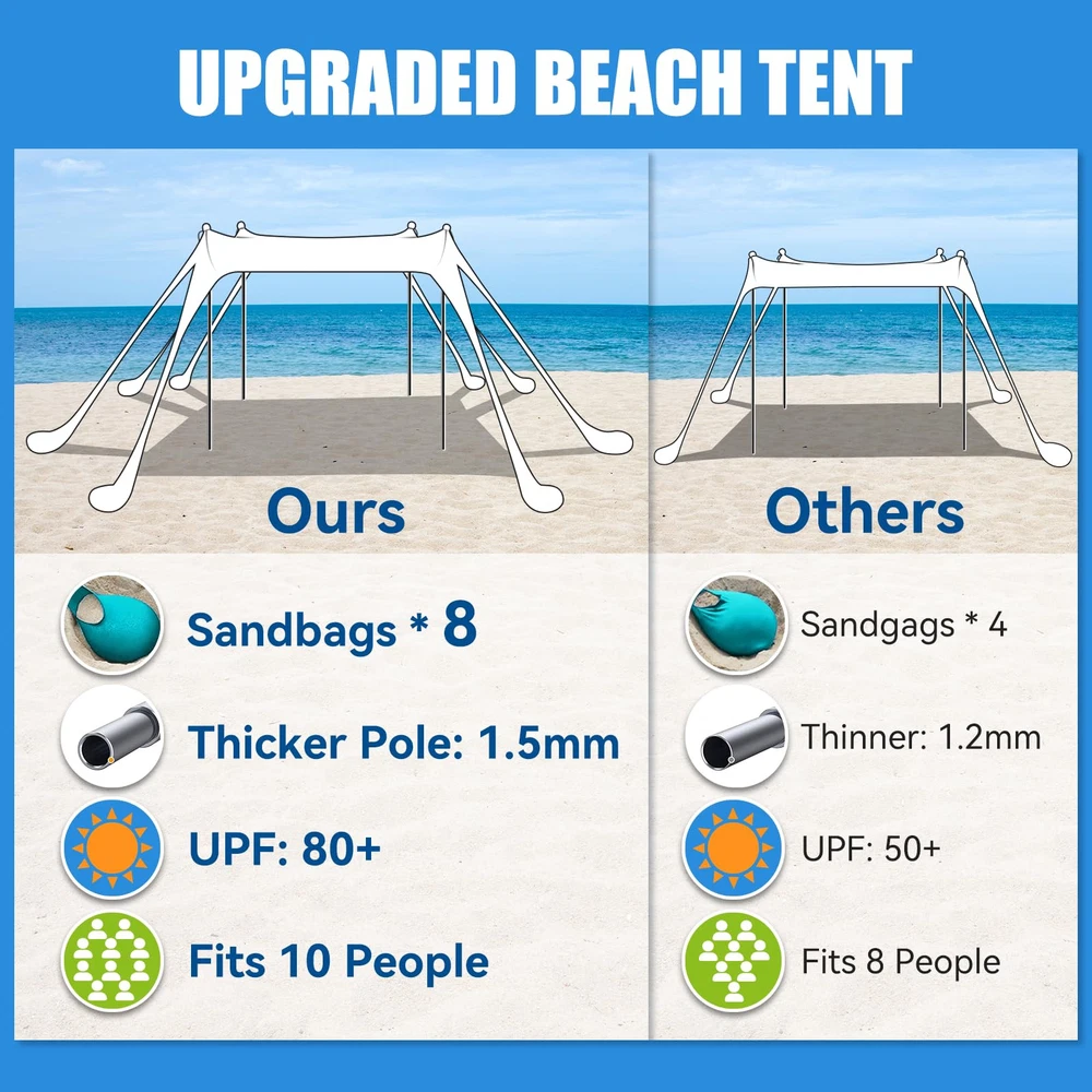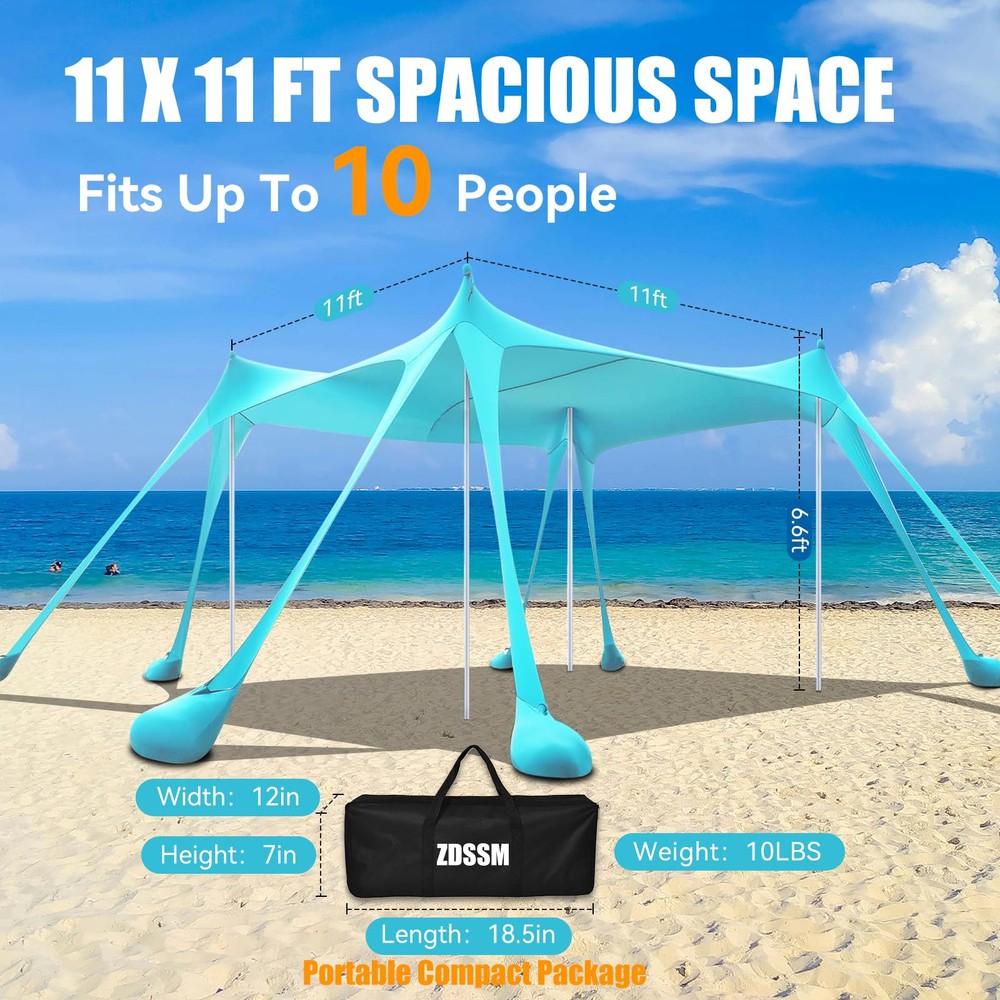 Sun Protection - This beach shade is made of high quality UPF 80+ water-resistant fabric.Can block out harmful UV rays to reduce sun burn or glare. Perfect for kids or adults for beach and outdoor use. Stble - The beach tent will come with 8 tear-resistant sandbags, 4 aluminum poles, sand shovel and ground pegs. More stable for you to use it over beaches or thick grassy areas. Easy to Setup - Our beach shade canopy is very easy to set up. You can complete it on your own in minites. Large Size & Portable - The pop up canopy 11x11 ft can hold up to 8 people for beach parties or outdoor picnics. Packaged with a travel bag to keep it all safe organized and portable. Use Anywhere - This beach canopy tent sun shade is great for friends or families to relax on the beach or enjoy some family time at the park. You can set it up almost anywhere.(Patent No: D980374S)