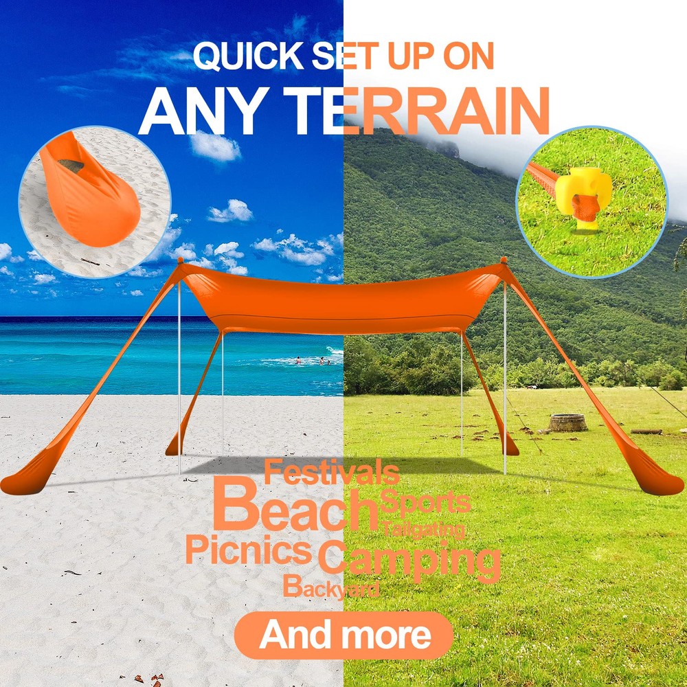 Advanced Sun Protection:The sun canopy is made of advanced stretch water-resistant Lycra fabric with great shape-no wrinkles, offering UPF 50+ sun coverage,block out harmful 98% UV rays. It can protect skin from harm by direct sunlight outdoors, and provide cool shadows,Thousands of families are using this beach sun shelter to keep their kids safe, happy and out of the sun! The Beach Tent will keep you protected on both sunny and rainy days. Sustain Stronger Wind Conditions:Did you tired of chasing blown away umbrellas and folding with clunky foldable tents? We adopted 4 sets of strength rust, bend-proof aluminum poles with a pointed stake at the bottom,unique 4 windproof ropes. Plus, the soft EVA ball at the top of each pole lets you fasten the rubber ball and shelter to hold everything even more securely. These provide a more rigid structure to the canopy, the shade is able to sustain stronger winds. Quick And Easy Outdoor Set Up: You won’t be in the sun for long time, just in minutes, you can fill the sandbags, assemble and upright the poles. At the same time, the open design on all sides allows air to flow freely under the tent, preventing uncomfortable stuffiness. And you can also enjoy the beautiful scenery on all the sides. Large Space& Adjustable: The beach sunshade tent are Large(10*10)ft can accommodate 6-8 person, Medium(7*7)ft 3-4 person. This high aluminum poles keep entire canopy area stays at full height that increasing the shaded area by 50% and accommodating more people. As the sun moves, simply move the sandbags or adjust the position of poles to change the angle of the shade for getting a perfect shadow and keep enjoying the outdoors. Super Portable&Widely Use: Comes with a portable and convenient free storage bag with a handle. you can easily fit our sun shade tent in your luggage, only 7lb, carry it anywhere without any hassle. This portable pop up beach tents sun shelter can become your go-to companion when going to the beach, park, picnic party, fishing, music festival, backyard barbecue or even in rocky camping spots.