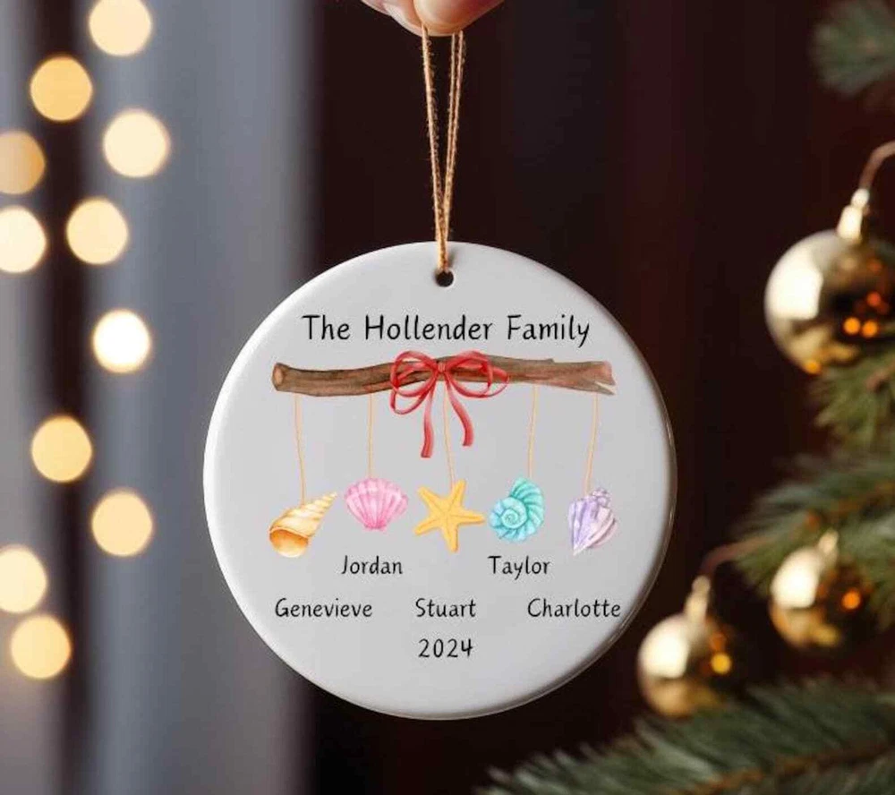 Beach Theme Personalized Family Christmas Ornament Holiday Custom Name Gift Christmas Tree Decor Custom Text Ornament Beach Design 5 Names Material: Ceramic Color: White Shapes: Circle, star, heart and oval Can be printed on both sides Imprint full-color artwork, photos, or logos Hole for hanging string and hanging string included Printed in the USA