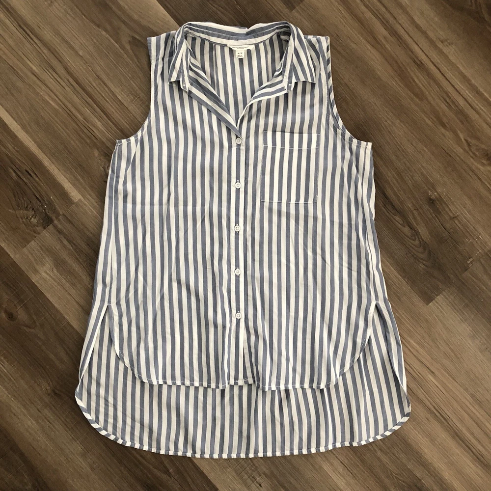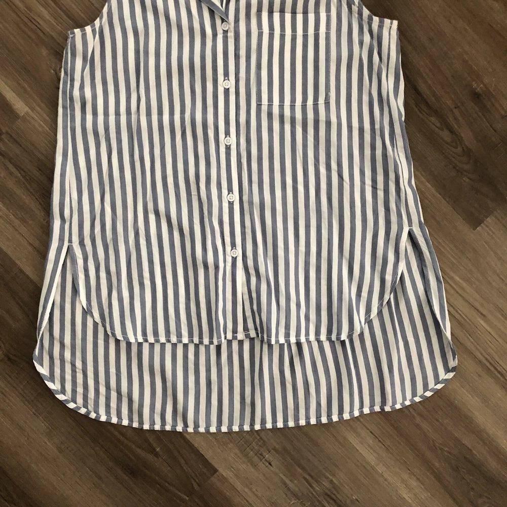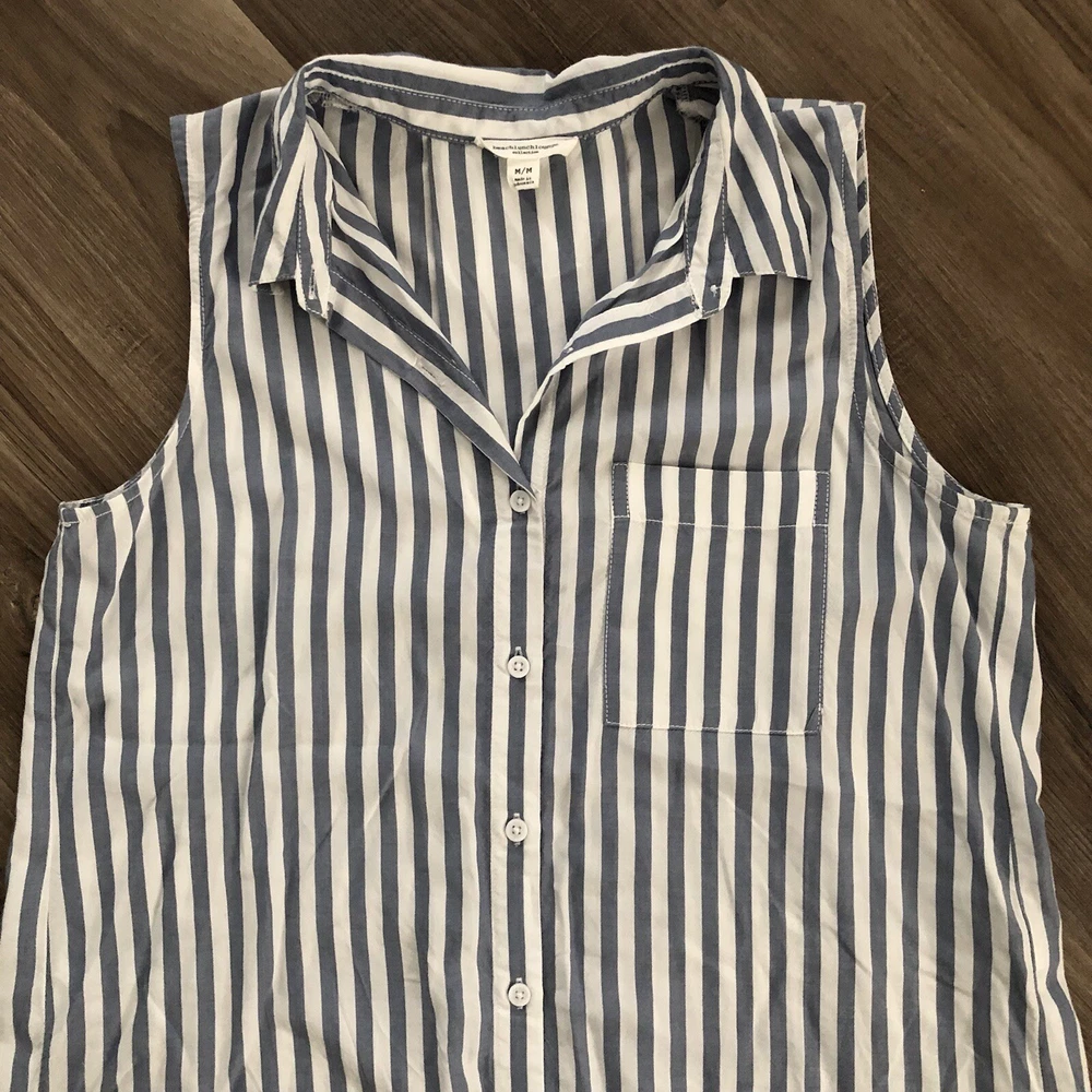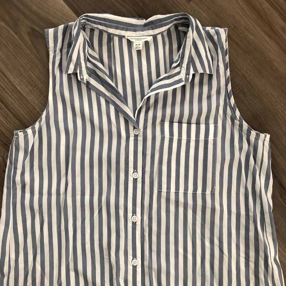 Beachlunchlounge blue and white sleeveless button down size mediu. Beachlunchlounge blue and white sleeveless button down size medium in great condition/ has back pleat giving it a loose flowy fit/ has high low hem /super comfy Pit to pit 21” across Length front 27” back: 32” Approximate measurements Nautical, summer, picnics