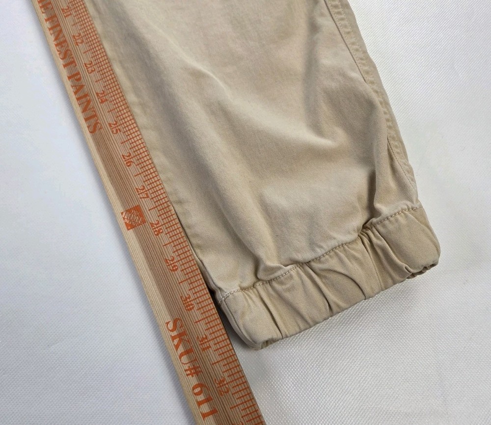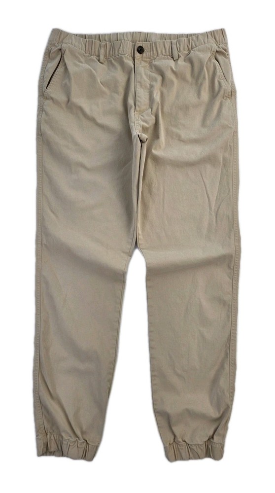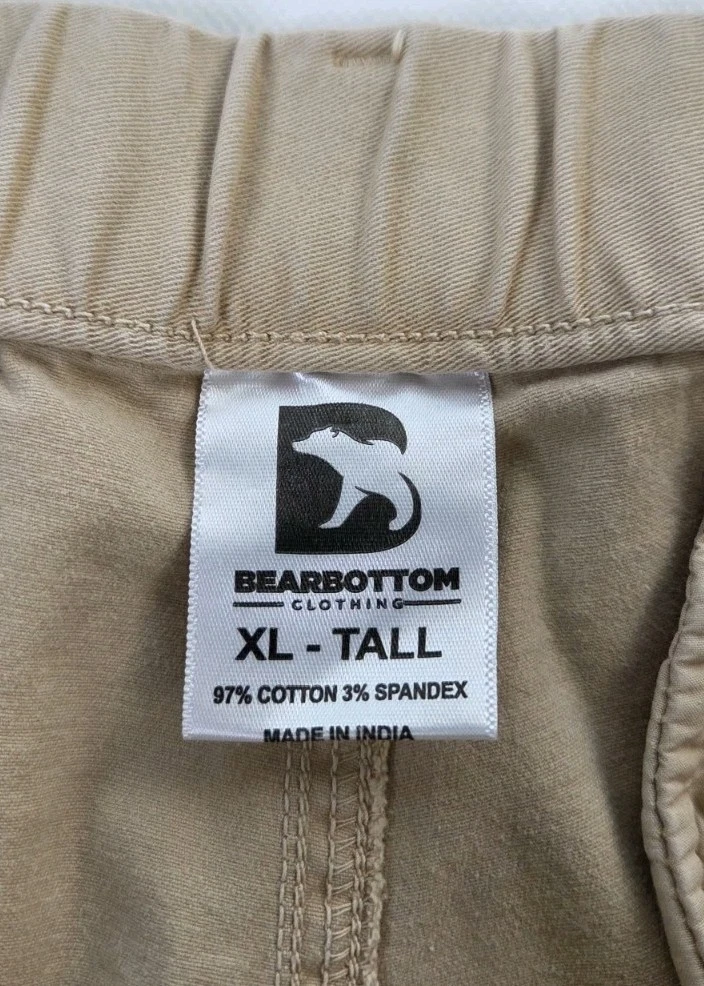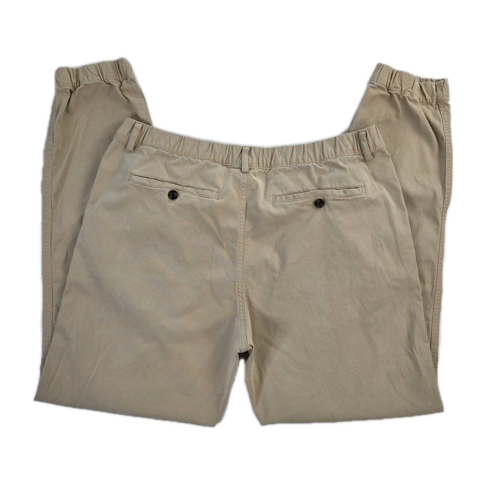 The Bearbottom Pants in Men's Size XL Tall are stylish jogger-style pants made from comfortable beige cotton. With an elastic waist for added comfort and flexibility, these casual pants feature a tapered leg design and a flat front. Perfect for everyday wear, these regular fit pants have a 31.5-inch inseam, making them a versatile and comfortable option for men looking for a relaxed and easy-to-wear garment.