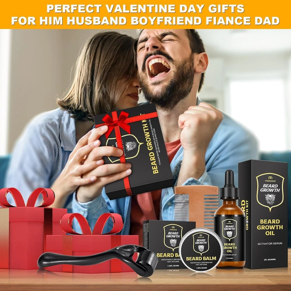 Beard Growth Kit - Beard Kit for Men, Beard Growth Oil (2oz), Beard Balm, Beard Comb, Massager for Spot/Patchy Beard - Christmas, Anniversary, Birthday Gifts for Men, Dad, Husband, Boyfriend Description Looking for a gift for the man who has it all? The beard kit is a standout choice for those who take pride in their grooming and premium beard kit delivers a complete solution for achieving a fuller, well-defined beard. With its fast-absorbing beard oil that fills in patchy areas and enhances density, combined with a soothing beard balm and precision sandalwood comb for effortless styling, this kit transforms your daily routine into an indulgent grooming experience. Experience a remarkable transformation as your beard becomes noticeably thicker and more robust with regular use. Perfectly crafted for men who take pride in their appearance, it not only boosts confidence but also makes an exceptional gift for any special to Use The Beard OilRecommended use: For best results, use the beard oil daily on an ongoing basis.1. Clean your face thoroughly2. Distribute 1-2 drips in the palm3. Apply the oil with circular movements onto the desired area. 4. Leave in The Beard Oil and allow it to fully to Use The Beard BalmRecommended use: 3-4 times a week depending on your beard need.1. Take a small portion on your palm2. Rubbing with palms3. Apply on your beard4. Massage with your fingers to spread well for better absorptionDual Teeth Beard CombOur handmade comb made of natural solid wood, which is both sturdy, comfortable and unscent, not only does it have anti static properties but also make for long lastingLinen Beard Storage BagThe beard travel pouch is made of reusable linen. You can put all the beard grooming tools you have in the storage bag for easy to take on the road. Or just keep an extra kit in the office. Features: Achieve a Thicker, Healthier Beard Effortlessly - Our expertly crafted beard oil is designed to deeply nourish facial hair, helping to reduce patchiness and promote a fuller, stronger beard. The lightweight, non-greasy formula absorbs quickly into the skin without clogging pores, ensuring a smooth and refreshed feel. Elevate your grooming routine with a beard that looks denser, healthier, and effortlessly well-maintained. The Perfect Grooming Gift for Him - This premium beard care set is an ideal gift for any man who takes pride in his appearance. Featuring a nourishing beard oil, a styling balm, and a precision-crafted Sandalwood comb, it provides everything needed for a well-groomed and stylish beard. Whether for a birthday, anniversary, or holiday, this thoughtful gift enhances his grooming routine and boosts his confidence. Deep Conditioning for a Soft, Itch-Free Beard - Our all-natural beard balm works to deeply condition and tame unruly facial hair while hydrating the skin beneath. It absorbs quickly, reducing itchiness and beard dandruff, ensuring long-lasting comfort. Paired with a handcrafted, anti-static Sandalwood comb, this set helps distribute natural oils evenly for a refined and polished beard. Thoughtful & Practical Gift for Every Occasion - Designed for men who take their beard care seriously, this grooming kit makes an excellent gift for husbands, boyfriends, fathers, or friends. Whether it’s for a special occasion like Father’s Day, Christmas, or a simple gesture of appreciation, this kit provides a premium self-care experience that any bearded man will appreciate. Premium Packaging for Home & Travel Convenience - Elegantly packaged in a sleek, travel-friendly gift box, this beard grooming set is designed for both home and on-the-go use. Its compact yet complete design ensures that every man can maintain his beard effortlessly, whether at home or while traveling. Give the gift of style, convenience, and confidence with this all-in-one grooming kit. Product Details: Package Dimensions : 6.42 x 5 x 2.4 inches; 9.91 ounces Item model number : Beard-Kit-011 Manufacturer : Mideand Product Benefits: Detangling Hair Type: All Scent: Tea Tree Liquid Volume: 2 Fluid Ounces Item Form: Oil Handling We will ship all orders within 3 business day of payment. Delivery We Do Not Ship Outside of the Continental US. Return Policy All items qualify for returns within 30 days of receipt. Buyer is responsible for return shipping on any item that is not damaged. Feedback We take our reputation seriously, we buy and sell online, so we understand the value of trust. If you are unsatisfied with your order, please contact us and we will work with you to resolve it to your satisfaction.