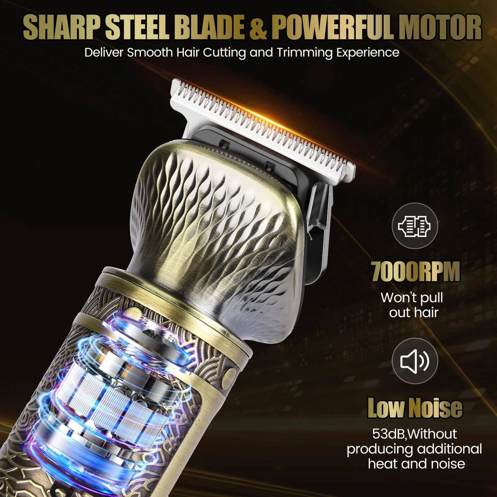 All in One Mens Trimmer: It has 7 trimmer heads, a T blade edgers, 2 in 1 cutting head to trim hair and beards, a foil shaver, a nose hair trimmer, a body hair trimmer for men, a precision beard trimmer and a design trimmer. Shaving Kit for Men: Beard grooming kit men also come with 9 guide comb sizes for different hairstyles and lengths. 4 hair guards 1/3/5/7 mm, 4 guide combs 3/6/9/12 mm, a durable stand and storage pouch for travel. The interchangeable multiple heads are for trimming face and neck, mustache, sideburns, stubble, body hair and facial hair. Ultra Sharp Steel Blades: The electric razor for men face delivers an even, precise, close shave and clean cut; its sharp blades can easily cut through fine, thick, coarse hair without pulling or snagging. The T blade liners can be close to the skin for a zero-gap trim and can do hairlines or edges. Useful LED Display: This cordless hair trimmer for men haircut has a digital display that can constantly shows the remaining battery life to let you recharge the beard and mustache trimmer. Rustic personal mens grooming kit is a versatile tool to shape and trim different areas of body. USB C Rechargeable & Long Battery Life: This hair clippers for men cordless built-in lithium battery provides wireless operation for up to 120 mins after 1.5 hrs of charge. Included a USB C cable but wall adapter is not included. Easy to Use and Clean: The portable body/facial grooming clippers set is ergonomic, ensuring a comfortable grip and effortless to use. Wash the stainless steel blades by rinsing under water.(Note: Don't immerse the whole electric hair trimmer in water). Gifts for Men: The men's hair clippers are a solid pick for a complete grooming experience. Perfect for personal use or as a stylish gift for your fathers, dads, and husband. Give it as a christmas gift or birthday gifts to your family and friends.