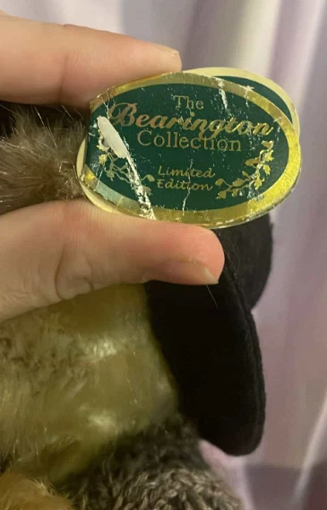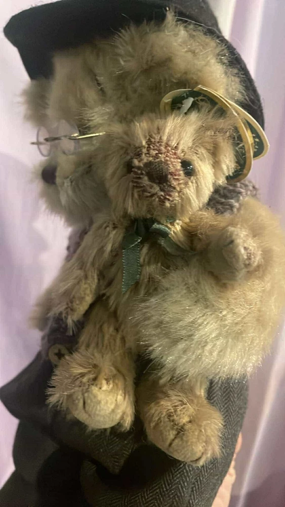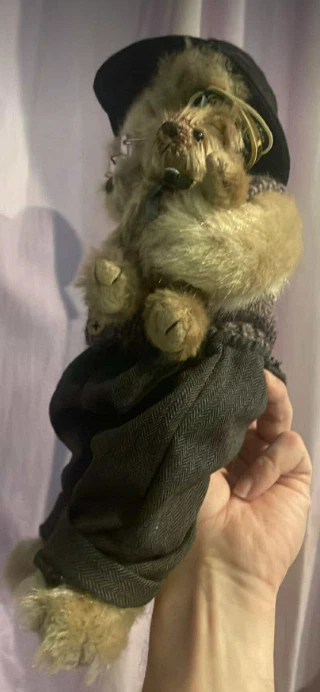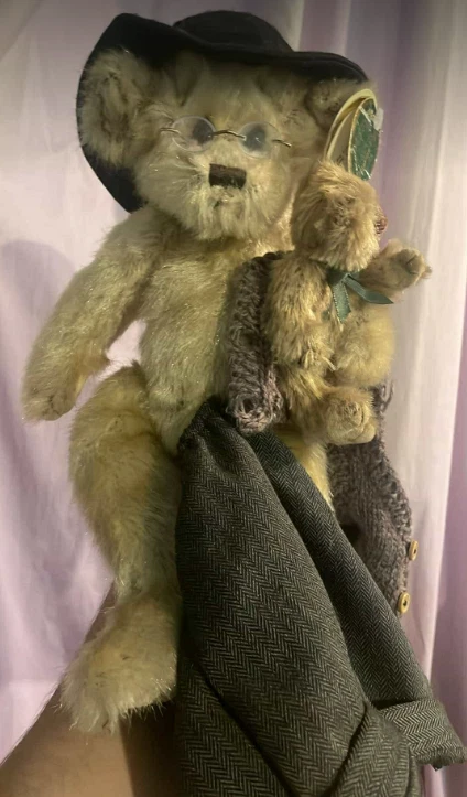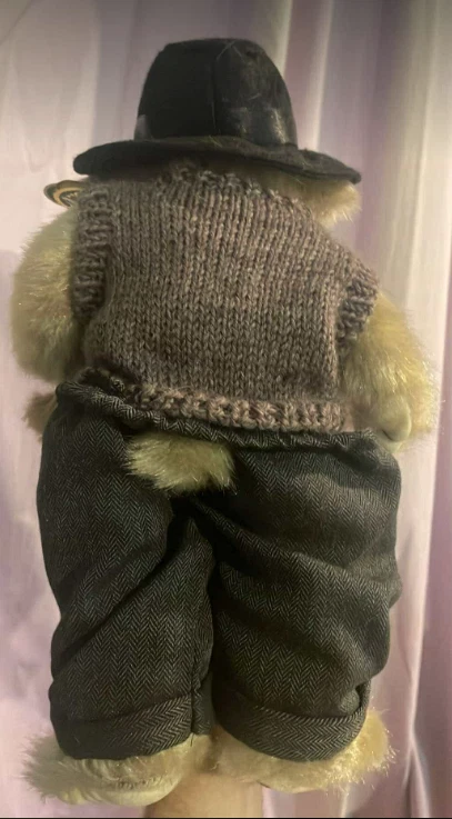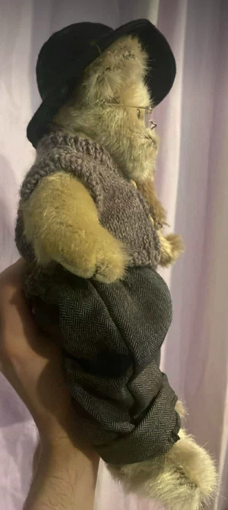 This is a Bearington bear. He is not suitable for children under 5. His hat doesn't come off at all. His glasses move a little bit, but don't fully come off. The little bear is sewn to his chest, so the big bear's sweater doesn't fully come off. The front of the big bear's pants is sewn to his belly, so the pants don't fully come off either. There is a hole in the back of his pants, for his tail. His head, right arm, and both legs rotate 360-degrees. However - the right arm only does that if you take off the sweater; and the legs only do that if you take off the pants. He is 14 inches tall, his shoulders are 7 inches wide, and his belly is 4 inches thick.