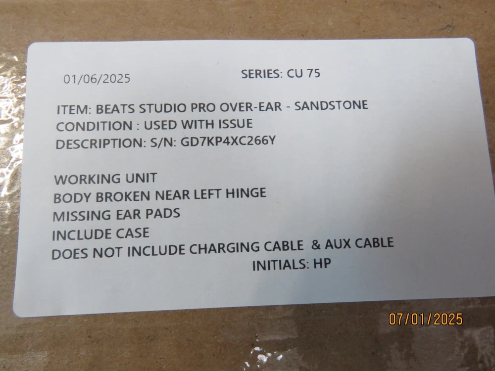 Beats by Dr. Dre Studio Pro Over-the-Ear Wireless Headphones (BROKEN) [CU176] Functional Condition: Tested and Functional With Issue. ISSUE: Broken Left Hinge. Missing Ear Pads. Cosmetic Condition: This is a Used Item and Normal Wear (Scuffs & Scratches) is Expected. Items included in this listing: Headphones Case Items NOT included in this listing: Charging Cable Aux Cable Thank you for Shopping with Us! ENJOY Free Shipping in USA & Low Cost Shipping to CANADA! Terms of Sale NOTE: Our Listings only include items as pictured - Please do not assume any item is included if its not pictured. We will try our best to picture all items included in this listing as well as its cosmetic condition. We Guarantee & Stand Behind our product and commitment to provide you with o nly Original, Branded, OEM & Genuine Products Shipping A complete and correct shipping address is essential. We cannot guarantee the shipping address can be changed after checkout. Sales Tax will be charged to all Canadian & USA Buyers. Combined shipping is not guaranteed. We are unable to change any content of your order based on the eBay checkout note or PayPal message. Customers with shipping addresses outside of the U.S.A and Canada are responsible for all duties and import taxes. Please contact your customs for information Bidding All items are accurately described and pictured. Please ensure you are consciously bidding on the items as described. Payment Payments are expected at the time of purchase or in case of Auctions, at the end of auctions. Payments are managed via eBay Managed Payments Contact Us Your positive feedbacks are extremely valuable to us. If you have any concerns about your order, please contact us through eBay message to resolve any issues before leaving a negative feedback or opening a dispute. We will reply within 24 Hours Return Policy All items are in used condition unless specified.